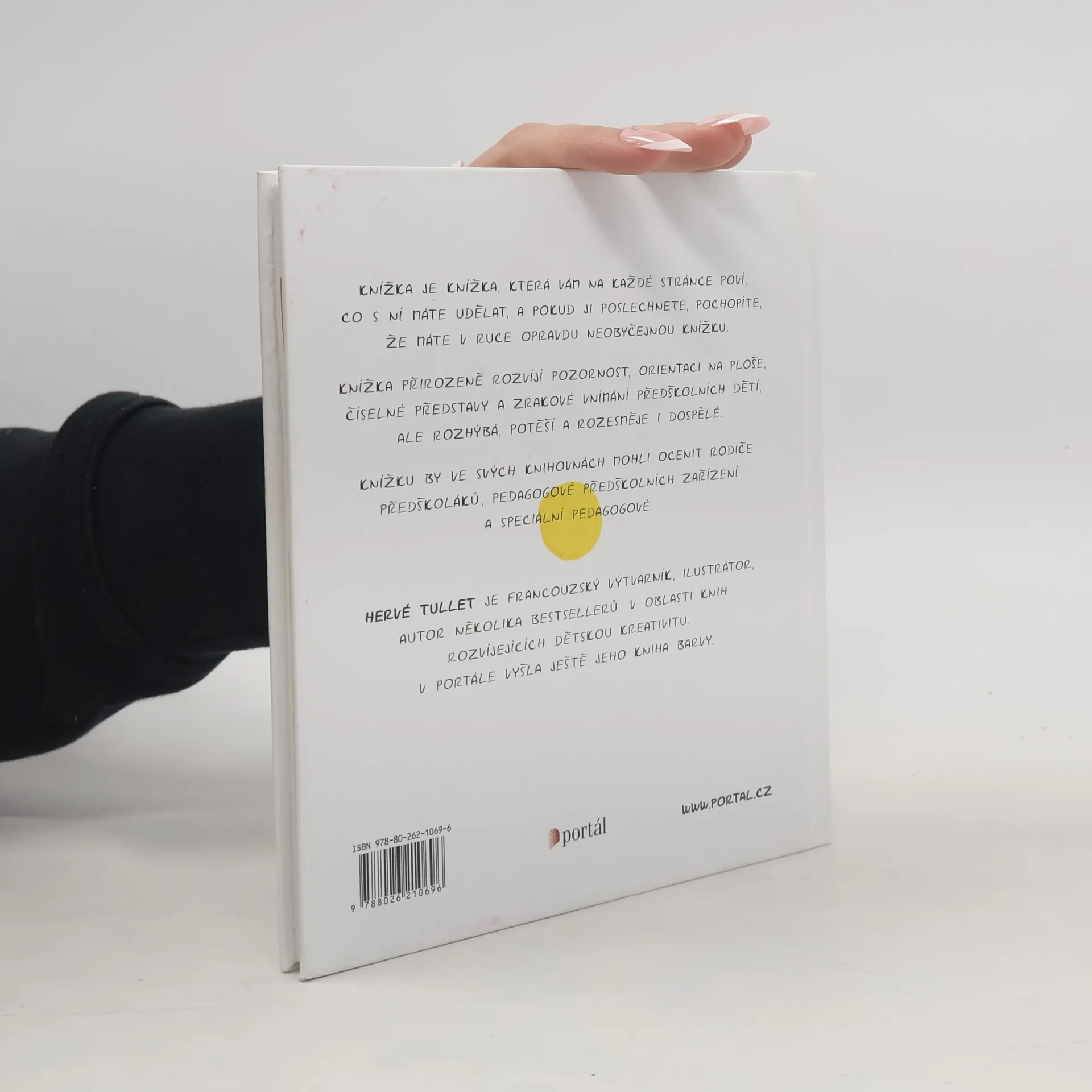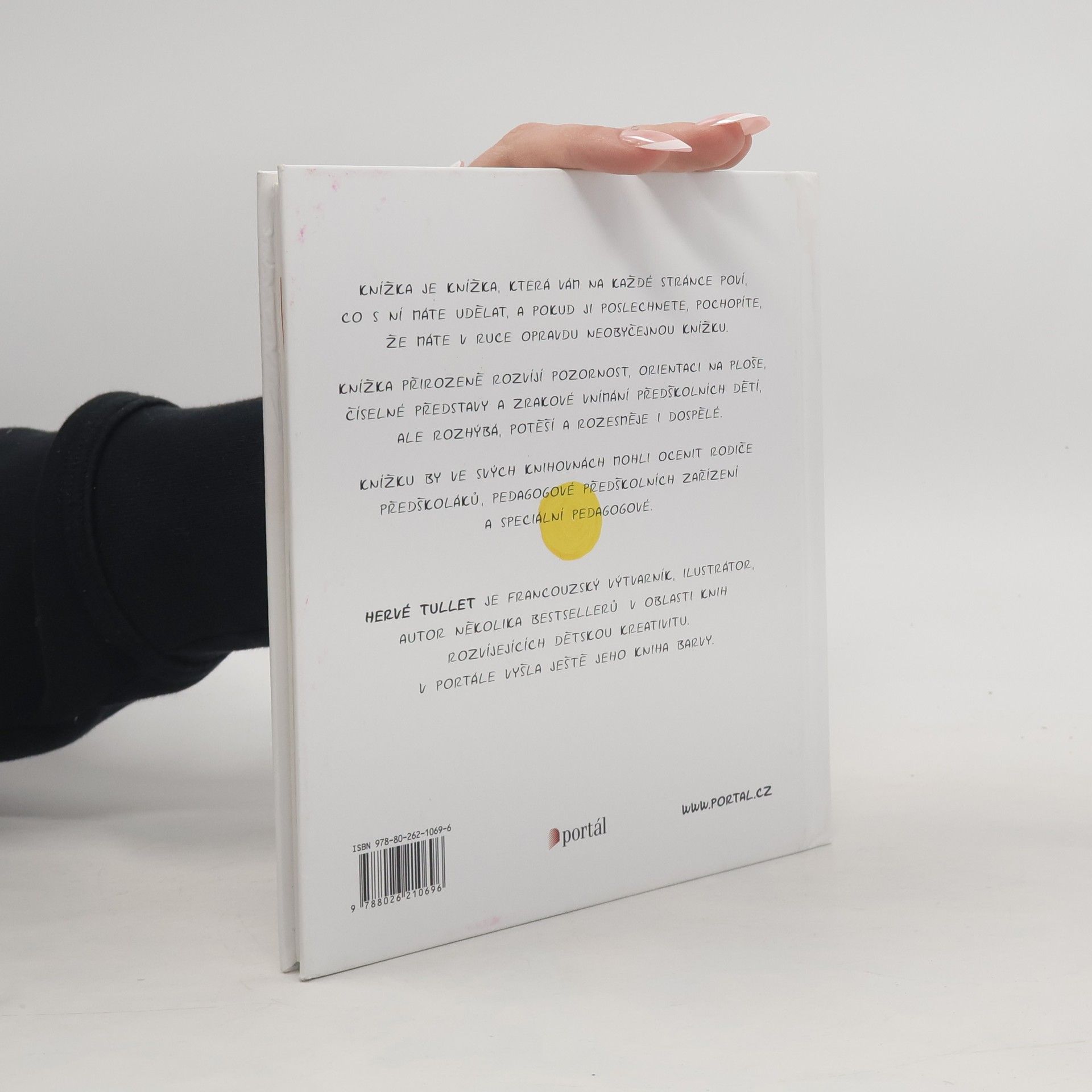 Knížka je knížka, která vám na každé stránce poví, co s ní máte udělat. A pokud ji poslechnete, pochopíte, že máte v ruce opravdu neobyčejnou knížku. Stačí jí zatřást, někde poklepat, jinde fouknout do barevných puntíků a začnou se dít překvapivé věci… Knížka přirozeně rozvíjí pozornost, orientaci na ploše, číselné představy a zrakové vnímání předškolních dětí, připravuje pro čtení a psaní, ale rozhýbá, potěší a rozesměje i dospělé. Knížku ve svých knihovnách ocení rodiče předškoláků, pedagogové předškolních zařízení a speciální pedagogové. Druhé vydání.