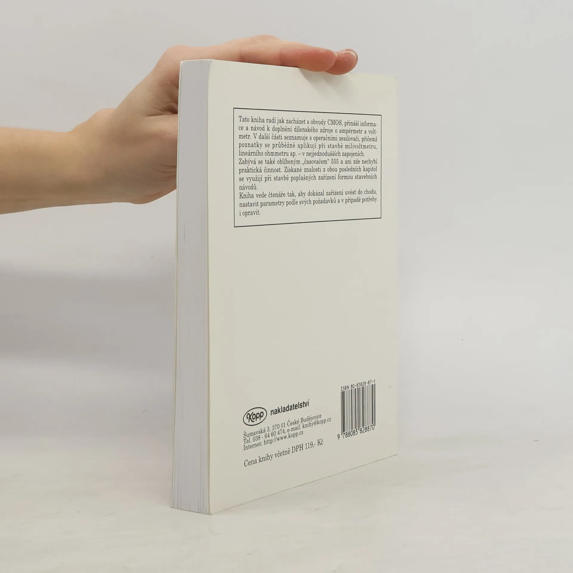 Tato kniha radí jak zacházet s obvody CMOS, přináší informace a návod k doplnění dílenského zdroje o ampérmetr a voltmetr. V další části seznamuje s operačními zesilovači, přičemž poznatky se průběžně aplikují při stavbě milivoltmetru, lineárního ohmmetru apod. - v nejjednodušších zapojeních. Zabývá se také oblíbeným "časovačem" 555 a ani zde nechybí praktická činnost. Získané znalosti z obou posledních kapitol se využijí při stavbě poplašných zařízení formou stavebních návodů. Kniha vede čtenáře tak, aby dokázal zařízení uvést do chodu, nastavit parametry podle svých požadavků a v případě potřeby i opravit.