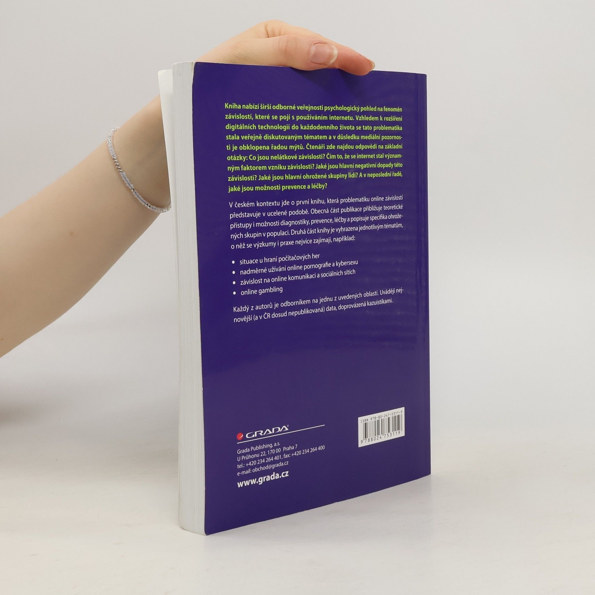 Záměrem knihy je nabídnout širší odborné veřejnosti psychologický pohled na fenomén závislostí, které se mohou pojit s používáním internetu. Vzhledem k rozšíření digitálních technologií do každodenního života se tato problematika stala veřejně diskutovaným tématem a vzhledem k mediální pozornosti je obklopena řadou mýtů. Téma bylo rovněž stranou praktiků, protože nebyla široce akceptována kritéria adekvátní diagnostiky. To se ale změnilo v roce 2013, kdy Americká Psychiatrická Asociace zavedla závislost na online počítačových hrách jako experimentální diagnózu. Cílem knihy je shrnutí aktuálních a klíčových poznatků a výsledků empirických i teoretických studií zaměřených na závislost na internetu. Čtenáři v knize najdou odpovědi na základní otázky, jako co jsou nelátkové závislosti, jak můžeme závislost diagnostikovat ve vztahu k online prostředí, jaké jsou hlavní ohrožené skupiny lidí a jaké jsou možnosti prevence a léčby. Specifická pozornost je věnována závislosti na online hraní, na online pornografii, online komunikaci a používání sociálních sítí a online gamblingu – tyto kapitoly doprovázejí kazuistiky a aktuální data z ČR.