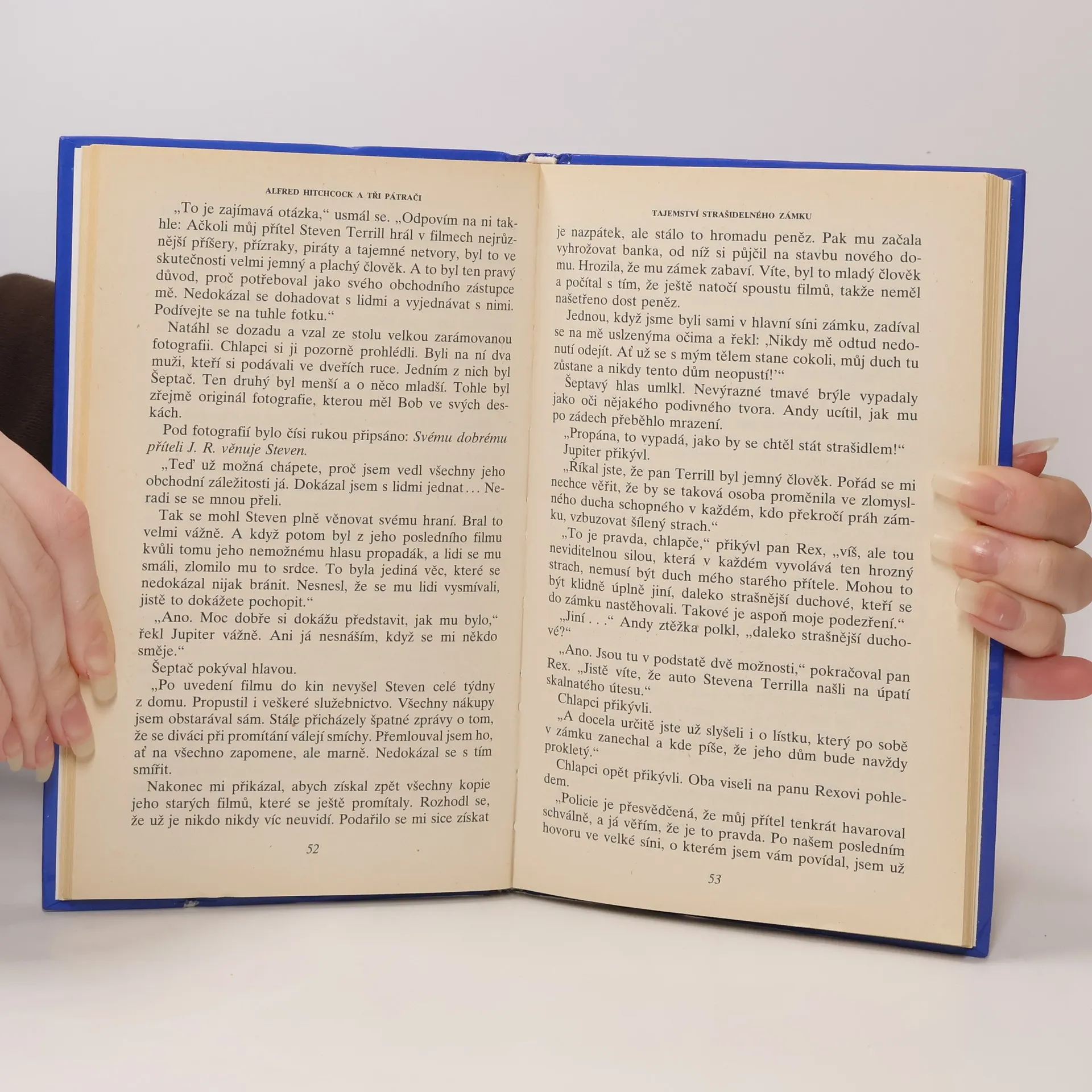 Všichni tři chlapci bydlí v Rocky Beach, malém městečku na pobřeží Tichého oceánu, vzdáleném jenom několik kilomwetrů od Hollywoodu. Bob Andrews je malý, ale obratný mládenec, přemýšlivý, hloubavý typ, i když má sklony k dobrodružství. Petr Crenshaw je poměrně vysoký a svalnatý a o Jupiterovi Jonesovi by se dalo říci, že je tlustý a trochu nemotorný. Už jako malému se mu kvůli tomu ostatní smáli. Proto vždy chtěl, aby ho lidé brali vážně a tak jen co se naučil číst, četl všechno co se mu dostalo do rukou a nejvíc ho zaujaly knihy o kriminalistice a psychologii. A protože měl dobrou paměť, zapamatoval si téměř všechno co přečetl a moc rád o všem diskutoval, takže i učitelé ve škole pokládali za moudřejší nepouštět se s ním do debaty o rozličných faktických problémech. Stávalo se jim totiž, že je často usvědčil z omylu. Tito tři podnikavci se nabídli najít A. Hitchcockovi strašidelný dům pro jeho nový film. Ve starých novinách se dočetli o Strašidelném zámku a samozřejmě se okamžitě rozhodnou ho navštívit. Velmi rychle zjistí, že přívlastek „strašidelný“ není náhodný a s řáděním strašidla se setkávají na každém kroku.