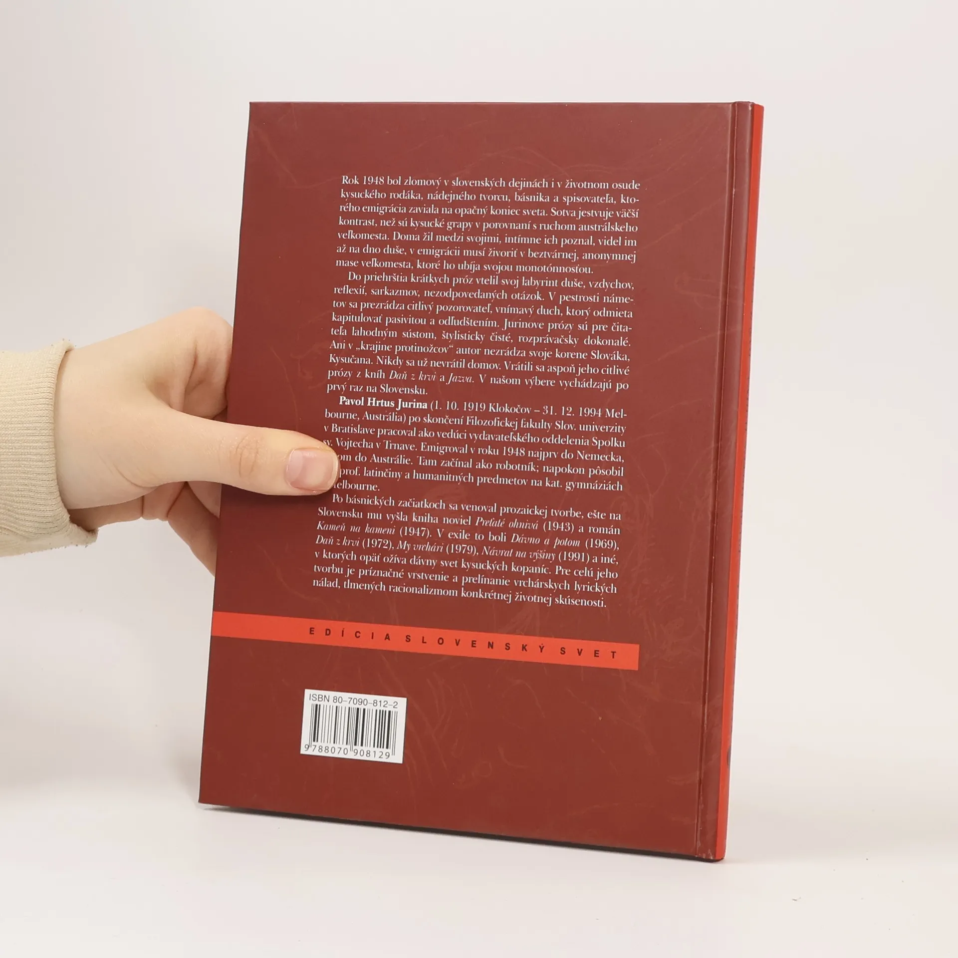 Jeden z najvýraznejších prozaikov slovenského exilu takisto až teraz, „in memoriam“ po prvý raz preniká na domácu scénu súborom pôvodne dvoch zbierok krátkych, dynamických, prenikavo napísaných próz: Daň z krvi a Jazva. Autor do nich vtelil svoj labyrint duše, sarkazmy, reflexie, nezodpovedané otázky. V pestrosti námetov badať citlivého pozorovateľa a vnímavého ducha, ktorý ochotne prezrádza svoje slovenské korene.