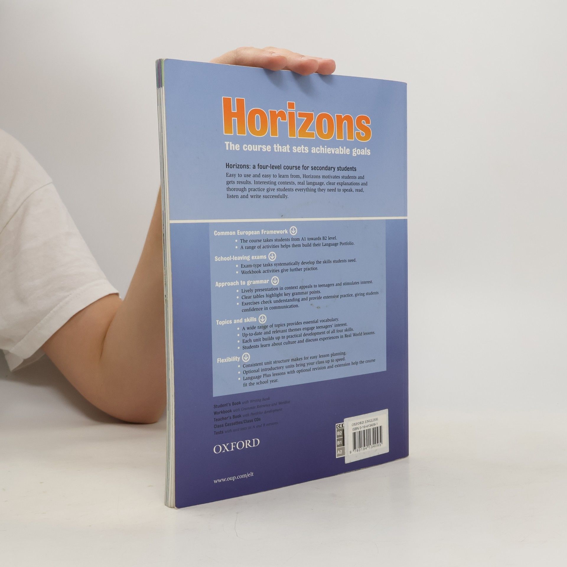 Jazyková úroveň: (False) Beginner až Intermediate Hlavní rysy: • Je určený pro studenty středních škol ve věku 14-19 let • Každý díl je určený pro jeden školní rok • Gramatika je prezentována v kontextu s rozhovory a je systematicky procvičována • Novinka 2006 české pracovní sešity • Novinka 2006 učebnice s CD-Romem • Zpracovává témata k maturitní zkoušce • Obsahuje také nepovinné lekce s dalším procvičováním • Kulturní oddíly poukazují na různé aspekty života v různých zemích • Doložka