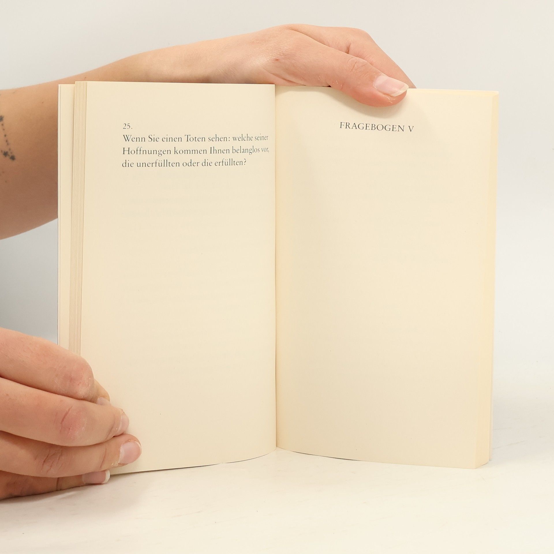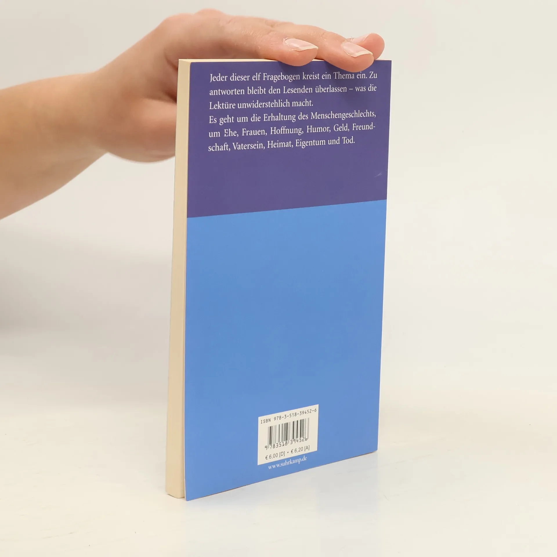 »Halten Sie sich für einen guten Freund? Sind Sie sich selber ein Freund?« Zwischen diesen beiden Fragestellungen liegen 23 Fragen zum Thema Freundschaft. Die Antworten bleiben den Leserinnen und Lesern überlassen. Dieser und zehn weitere Fragebogen umkreisen die Themen Ehe, Frauen, Hoffnung, Humor, Geld, Vatersein, Heimat, Eigentum, Tod, Erhaltung des Menschengeschlechts.