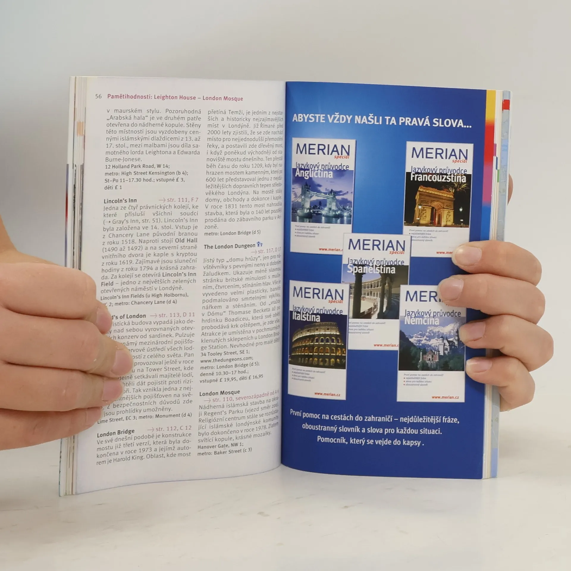 Průvodce seznamuje ve stručnosti s nejznámějšími turistickými atraktivitami jedné z největších evropských metropolí. Česká mutace vybraných titulů ediční řady německého vydavatelství Merian přibližuje čtenářům místa, která by při své návštěvě Londýna neměli vynechat. Podstatnou část příručky tvoří informace o možnostech stravování, nákupů, kulturního vyžití (koncerty, divadlo, show...), nabídkách akcí pro děti apod. Množství barevných fotografií, doplňkové mapky.