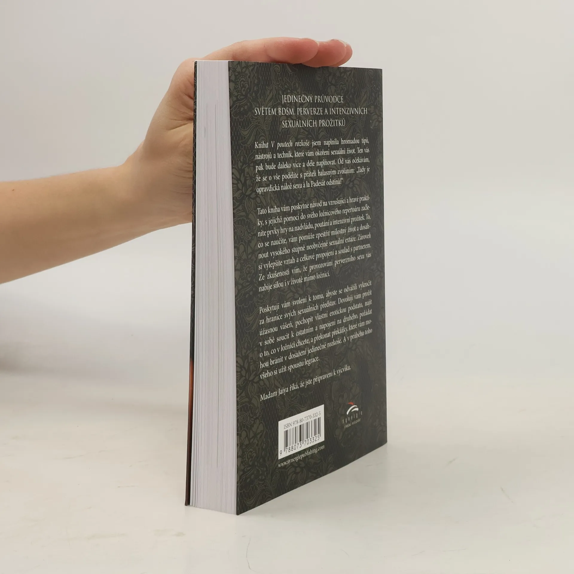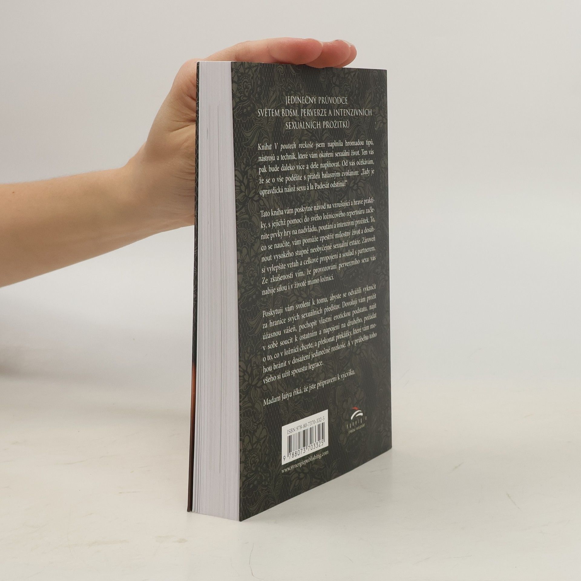 Jedinečný průvodce světem BDSM, perverze a intenzivních sexuálních prožitků Tato kniha vám poskytne návod na vzrušující a hravé praktiky, s jejichž pomocí do svého ložnicového repertoáru začleníte prvky hry na nadvládu, poutání a intenzivní prožitek. To, co se naučíte, vám pomůže zpestřit milostný život a dosáhnout vysokého stupně neobyčejné sexuální extáze. Zároveň si vylepšíte vztah a celkové propojení a soulad s partnerem. Ze zkušenosti vím, že provozování perverzního sexu vás nabije silou i v životě mimo ložnici. Knihu V poutech rozkoše jsem naplnila hromadou tipů, nástrojů a technik, které vám okoření sexuální život. Ten vás pak bude daleko více a déle naplňovat. Od vás očekávám, že se o vše podělíte s přáteli halasným zvoláním: „Tady je opravdická nálož sexu à la Padesát odstínů!“ Poskytuji vám svolení k tomu, abyste se odvážili vykročit za hranice svých sexuálních představ. Dovoluji vám prožít úžasnou vášeň, pochopit vlastní erotickou podstatu, najít v sobě soucit k ostatním a napojení na druhého, požádat o to, co v ložnici chcete, a překonat překážky, které vám mohou bránit v dosažení jedinečné rozkoše. A v průběhu toho všeho si užít spoustu legrace. Madam Jaiya říká, že jste připraveni k výcviku.