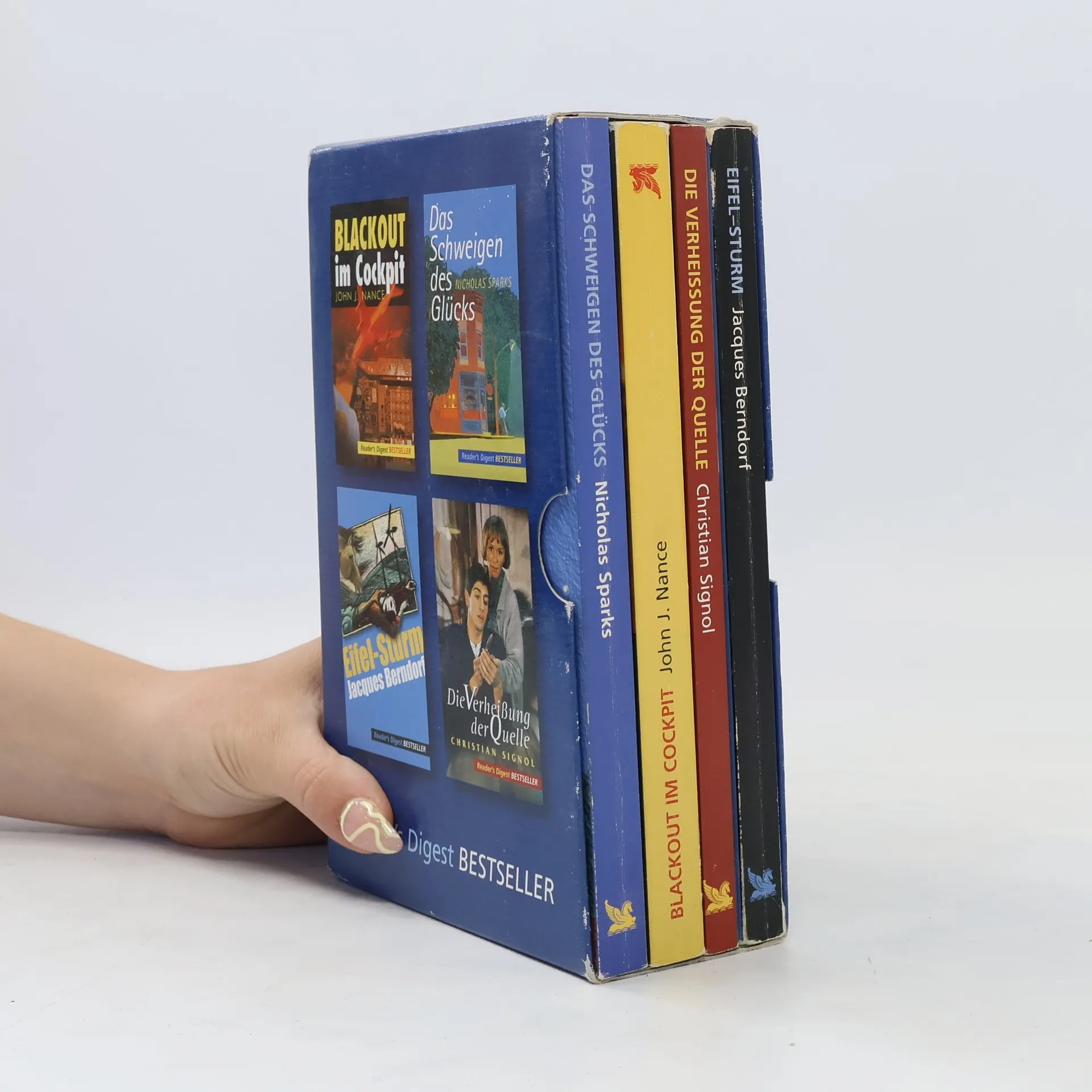 Die Verheissung der Quelle. Eifel-Sturm. Das Schweigen des Glücks. Blackout im Cockpit, Christian Signol, Jacques Berndorf, Nicholas Sparks, John J. Nance