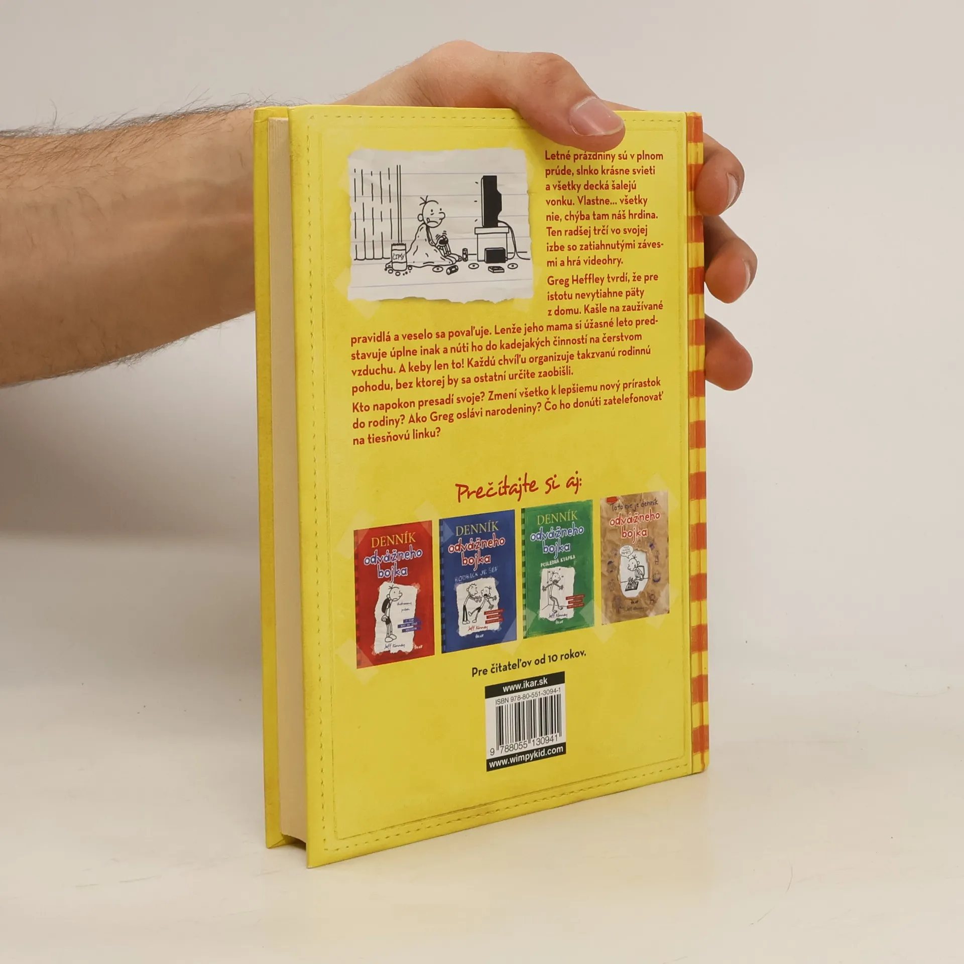 Letné prázdniny sú v plnom prúde, slnko krásne svieti a všetky decká šalejú vonku. Vlastne... všetky nie, chýba tam náš hrdina. Ten radšej trčí vo svojej izbe so zatiahnutými závesmi a hrá videohry. Greg Heffley tvrdí, že pre istotu nevytiahne päty z domu. Kašle na zaužívané pravidlá a veselo sa povaľuje. Lenže jeho mama si úžasné leto predstavuje úplne inak a núti ho do kadejakých činností na čerstvom vzduchu. A keby len to! Každú chvíľu organizuje takzvanú rodinnú pohodu, bez ktorej by sa ostatní určite zaobišli. Kto napokon presadí svoje? Zmení všetko k lepšiemu nový prírastok do rodiny? Ako Greg oslávi narodeniny? Čo ho donúti zatelefonovať na tiesňovú linku?