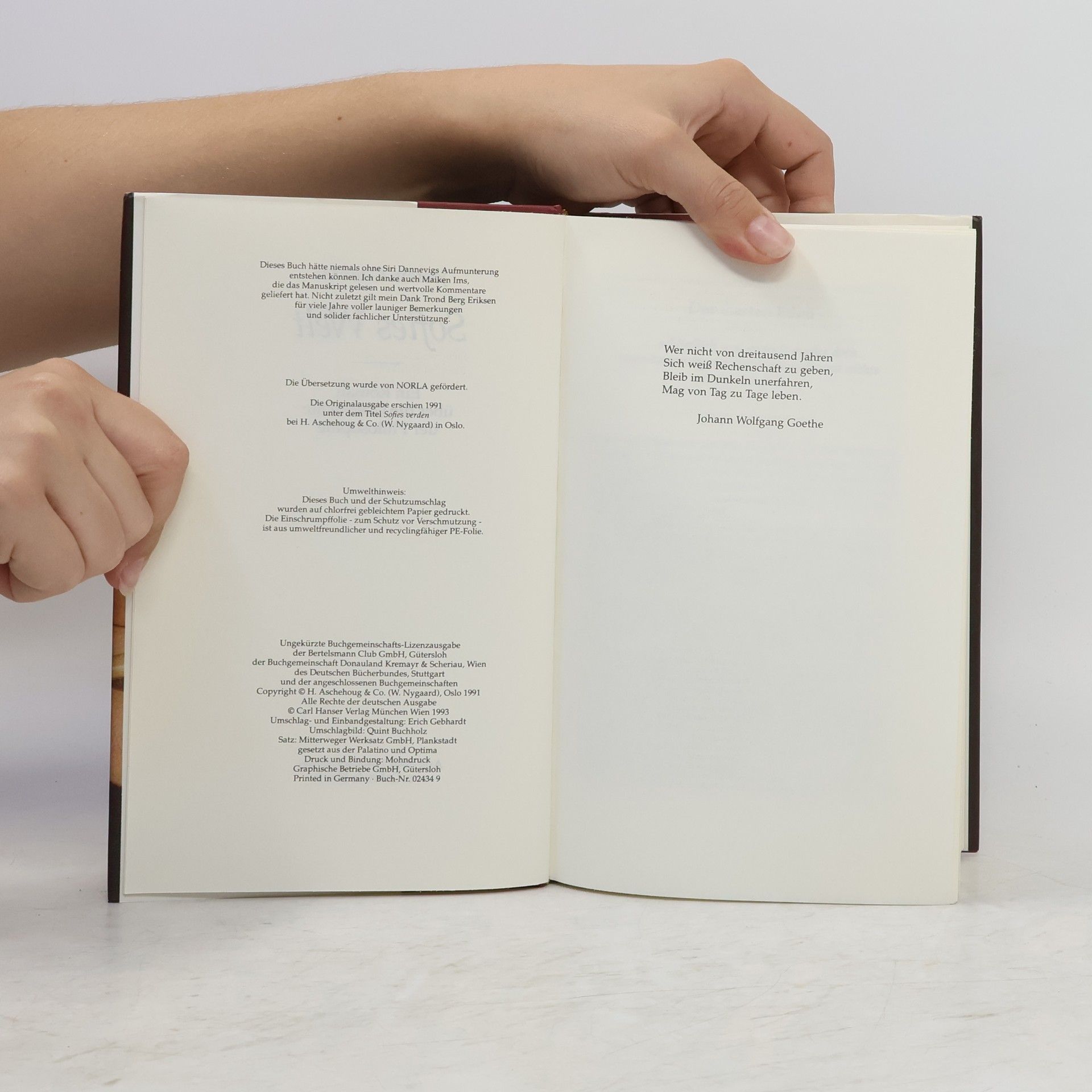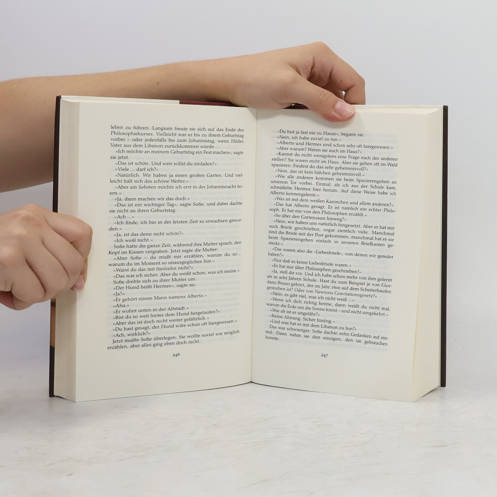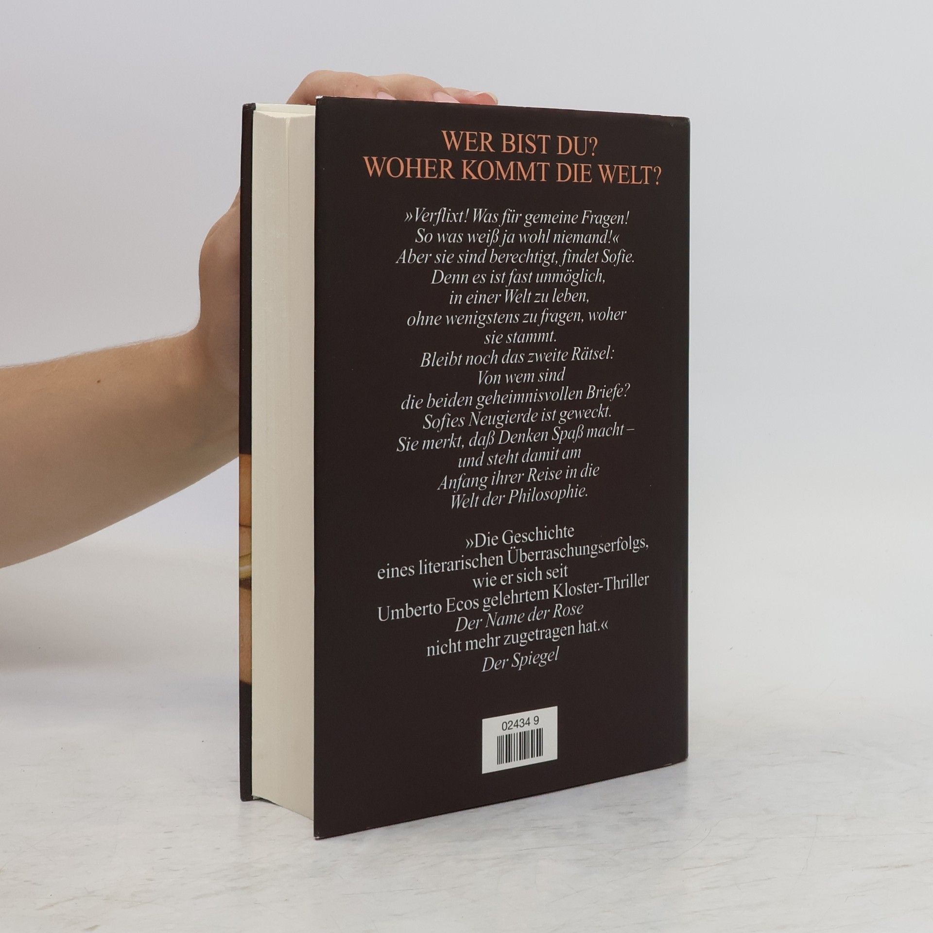 »Ein dickes Buch, mit spitzen Fingern angefaßt und mit Begeisterung zugeklappt: ein großer Wurf im wörtlichen wie übertragenen Sinn.« Die Zeit Mysteriöse Briefe landen im Briefkasten der 15jährigen Sofie Amundsen in Oslo. Was sollen diese Fragen: »Wer bist du?«, »Was ist ein Mensch?« und »Woher kommt die Welt?«. Sofie ist irritiert. Die Briefe werden ausführlicher und entführen sie in die abenteuerliche und geheimnisvolle Gedankenwelt der großen Philosophen. Ihr unbekannter Briefeschreiber erzählt Sofie die Geschichte Europas, der Antike, des Mittelalters und der Renaissance und dann nimmt die Geschichte eine unglaubliche Wendung.