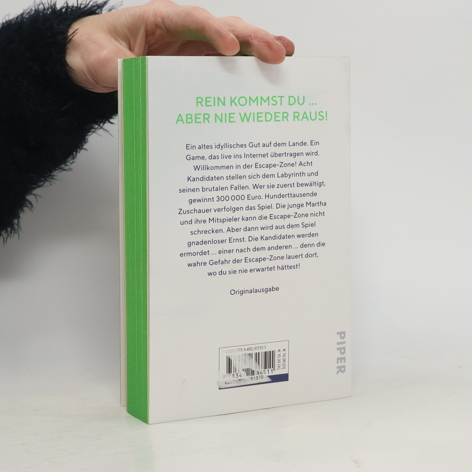 Rein kommst du ... aber nie wieder raus! Ein altes idyllisches Gut auf dem Lande. Ein Game, das live ins Internet übertragen wird. Willkommen in der Escape Zone! Acht Kandidaten stellen sich dem Labyrinth und seinen Horrorräumen. Wer sie zuerst bewältigt, gewinnt 300 000 Euro. Hunderttausende Zuschauer verfolgen das Spiel. Die junge Martha und ihre Mitspieler kann die Escape Zone nicht schrecken. Aber dann wird aus dem Spiel gnadenloser Ernst. Die Kandidaten werden ermordet … einer nach dem anderen … denn die wahre Gefahr der Escape Zone lauert dort, wo du sie nie erwartet hättest!