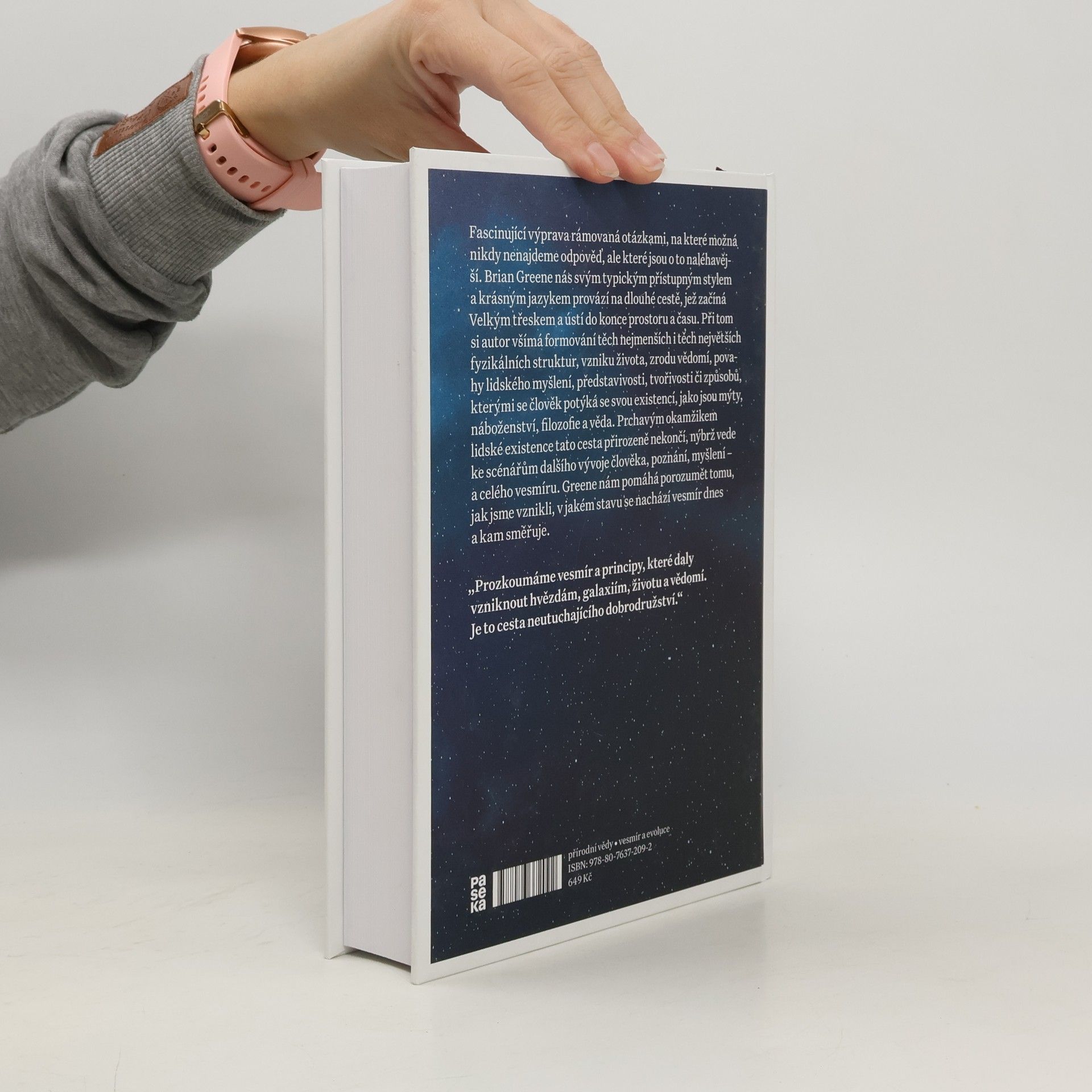 Fascinující výprava rámovaná otázkami, na které možná nikdy nenajdeme odpověď, ale které jsou o to naléhavější. Brian Greene nás svým typickým přístupným stylem a krásným jazykem provází na dlouhé cestě, jež začíná Velkým třeskem a ústí do konce prostoru a času. Při tom si autor všímá formování těch nejmenších i těch největších fyzikálních struktur, vzniku života, zrodu vědomí, povahy lidského myšlení, představivosti, tvořivosti či způsobů, kterými se člověk potýká se svou existencí, jako jsou mýty, náboženství, filozofie a věda. Prchavým okamžikem lidské existence tato cesta přirozeně nekončí, nýbrž vede ke scénářům dalšího vývoje člověka, poznání, myšlení – a celého vesmíru. Greene nám pomáhá porozumět tomu, jak jsme vznikli, v jakém stavu se nachází vesmír dnes a kam směřuje.