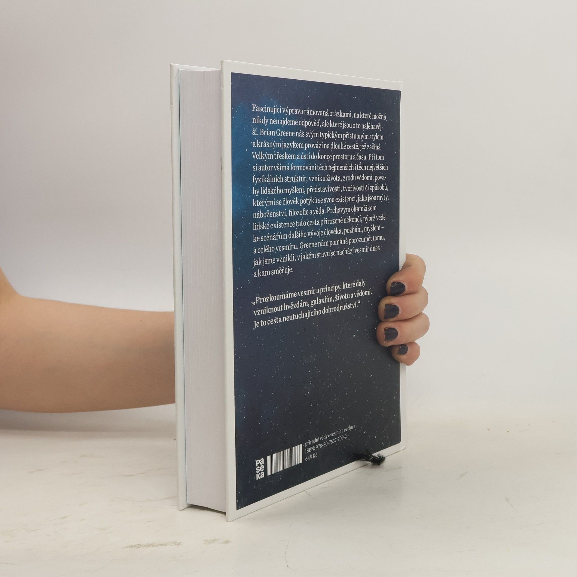 Fascinující výprava rámovaná otázkami, na které možná nikdy nenajdeme odpověď, ale které jsou o to naléhavější. Brian Greene nás svým typickým přístupným stylem a krásným jazykem provází na dlouhé cestě, jež začíná Velkým třeskem a ústí do konce prostoru a času. Při tom si autor všímá formování těch nejmenších i těch největších fyzikálních struktur, vzniku života, zrodu vědomí, povahy lidského myšlení, představivosti, tvořivosti či způsobů, kterými se člověk potýká se svou existencí, jako jsou mýty, náboženství, filozofie a věda. Prchavým okamžikem lidské existence tato cesta přirozeně nekončí, nýbrž vede ke scénářům dalšího vývoje člověka, poznání, myšlení – a celého vesmíru. Greene nám pomáhá porozumět tomu, jak jsme vznikli, v jakém stavu se nachází vesmír dnes a kam směřuje.