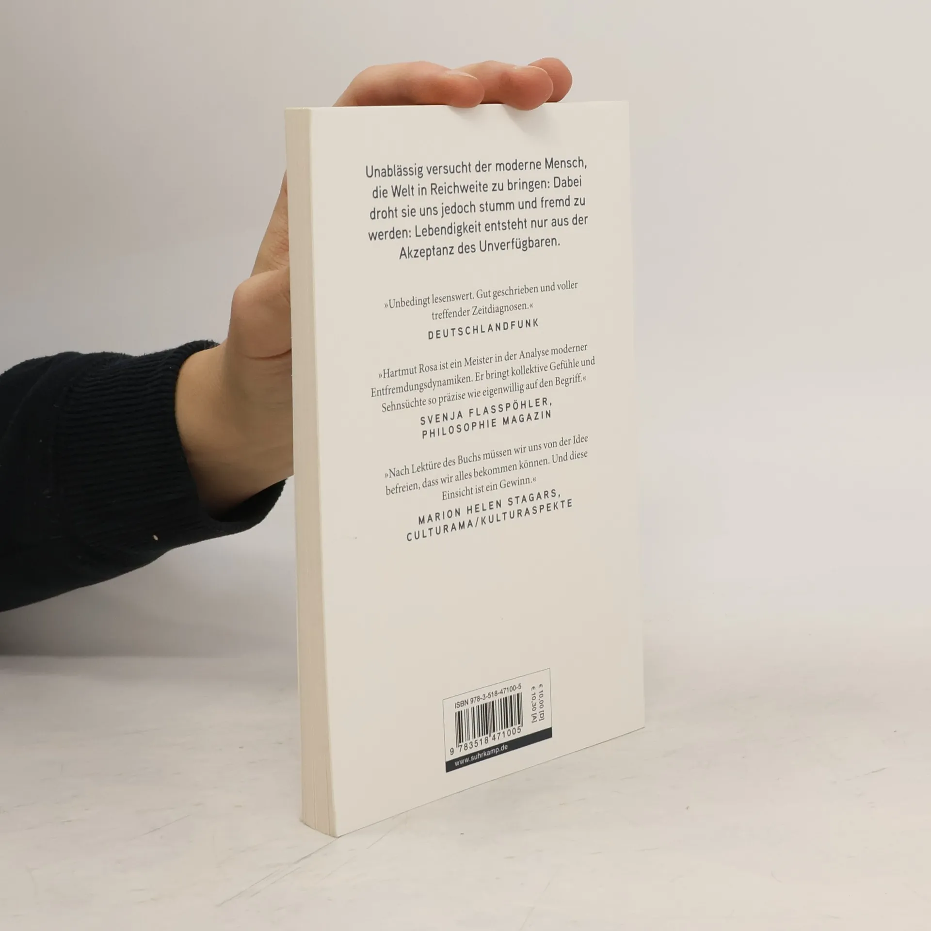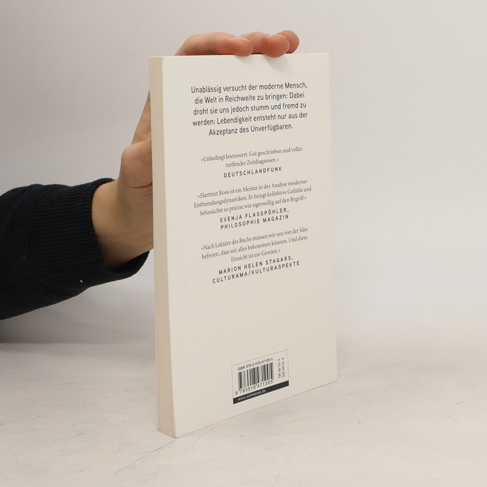 Ein fundiertes Plädoyer für eine Gesellschaft, die der Verfügbarkeit der Welt Grenzen setzt. Das zentrale Bestreben der Moderne gilt der Vergrößerung der eigenen Reichweite, des Zugriffs auf die Welt: Diese verfügbare Welt ist jedoch, so Hartmut Rosas brisante These, eine verstummte, mit ihr gibt es keinen Dialog mehr. Gegen diese fortschreitende Entfremdung zwischen Mensch und Welt setzt Rosa die Resonanz , als klingende, unberechenbare Beziehung mit einer nicht-verfügbaren Welt. Zur Resonanz kommt es, wenn wir uns auf Fremdes, Irritierendes einlassen, auf all das, was sich außerhalb unserer kontrollierenden Reichweite befindet. Das Ergebnis dieses Prozesses lässt sich nicht vorhersagen oder planen, daher eignet dem Ereignis der Resonanz immer auch ein Moment der Unverfügbarkeit.