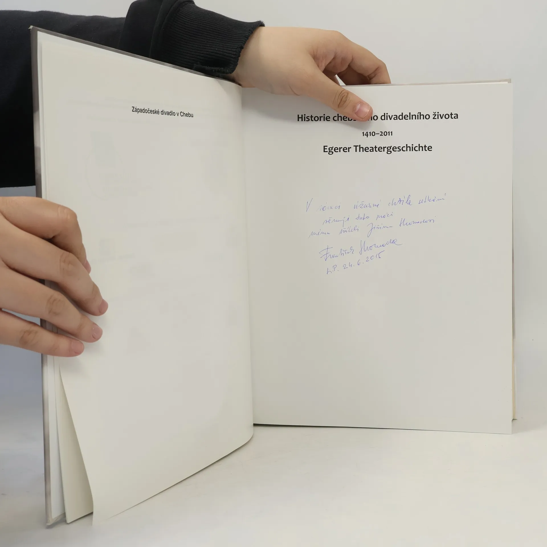 Výpravná dvojjazyčná publikace přibližuje tradici chebského divadla od 15. do 18. století, mj. první zmínky o divadelních představeních lidových náboženských her provozovaných o svátku Božího těla, činnost kočovných divadelních společností druhé poloviny 18. a v 19. století včetně aktivit divadla loutkového. Podrobně se věnuje i činnosti německého profesionálního divadla konce 19. a první poloviny 20. století. Podstatná část monografie dokumentuje zejména dějiny českého profesionálního divadla v Chebu od jeho založení v listopadu 1960 až do počátku 21. století. Knihu doplňuje bohatá fotografická příloha.