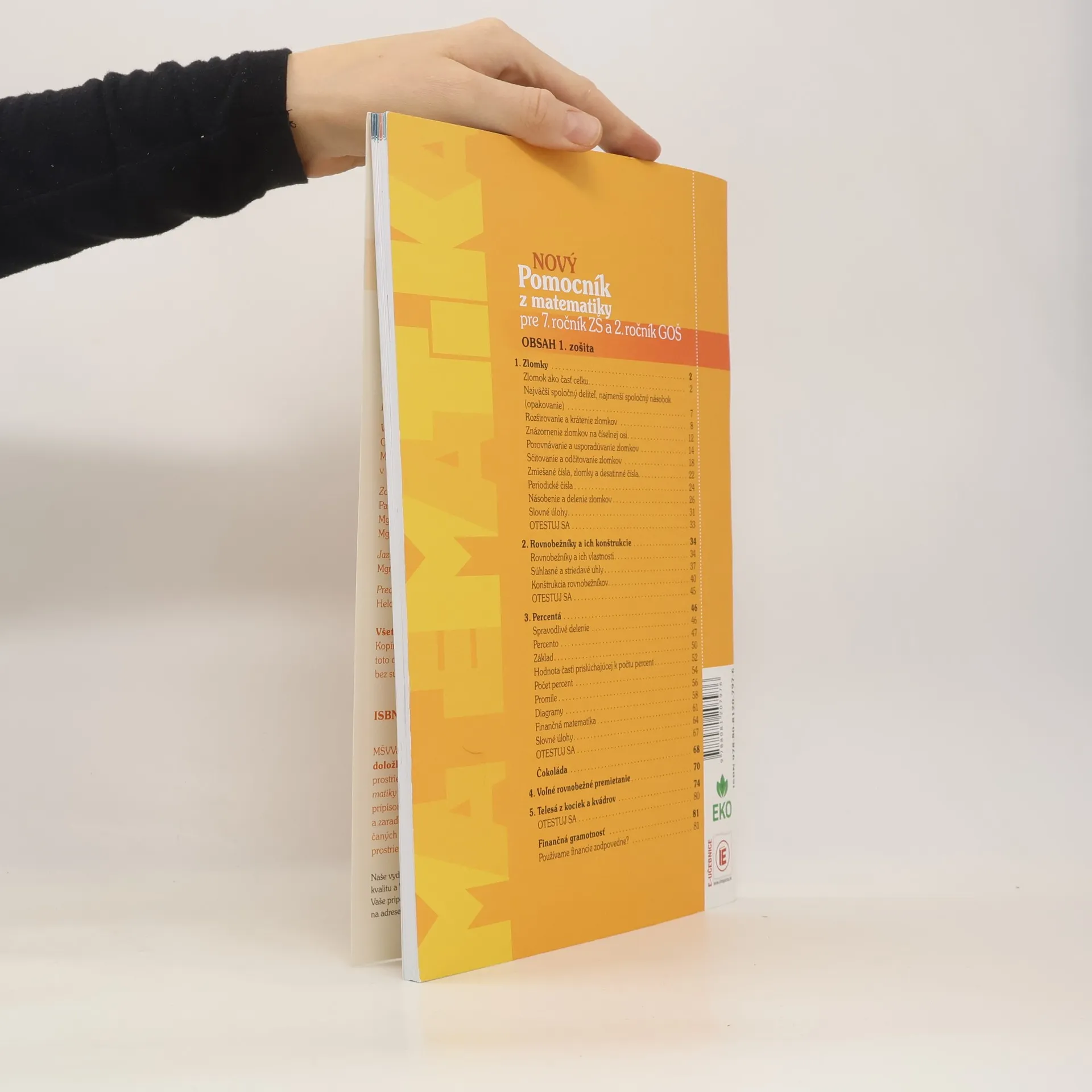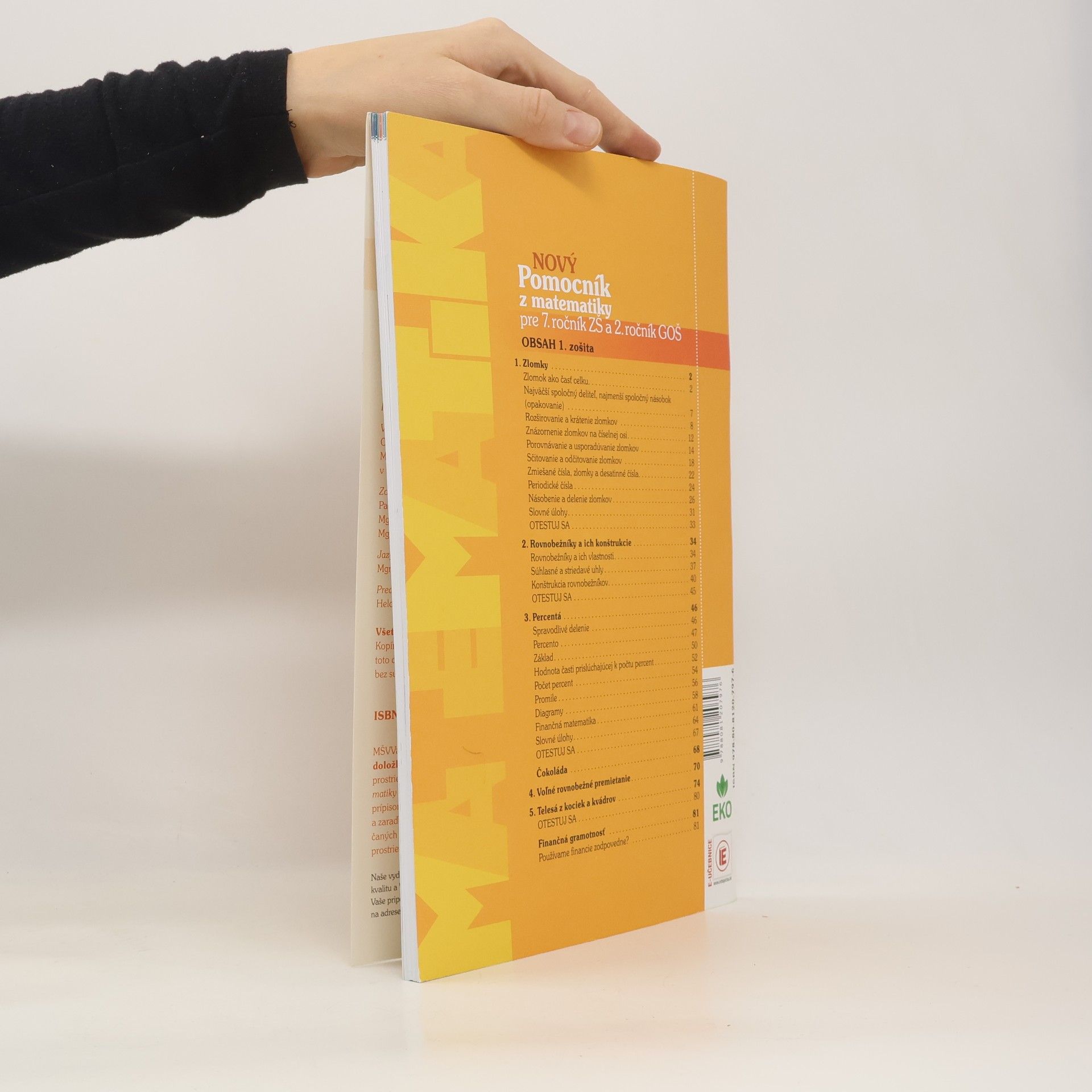 Vydavateľstvo Orbis Pictus Istropolitana pripravilo vylepšený dvojdielny pracovný zošit s implementovanými prvkami učebnice Nový pomocník z matematiky pre 7. ročník ZŠ a 2. ročník GOŠ, ktorý je v súlade so ŠVP platným od septembra 2015. Vytvoril ho kolektív skúsených učiteliek matematiky ZŠ a GOŠ pod vedením vedúcej Oddelenia didaktiky matematiky FMFI UK. Spracovaný je na základe požiadaviek učiteľov matematiky z praxe. Rozvíja matematickú, čitateľskú a finančnú gramotnosť. Pracovný zošit využíva autokorektívne prvky (doplňovačky, tajničky), ktoré sú pre žiakov zaujímavé a motivujúce. Obsahuje aj prvky diferencovaného vyučovania, ktoré umožňujú individuálny prístup a zohľadňujú rôzne tempo žiakov. Pridanou hodnotou pracovného zošita je v závere každej kapitoly test s úlohami s výberom odpovede na komplexné zopakovanie prebratého učiva. V Novom pomocníku okrem iného nájdete: Zlomky; Rovnobežníky a ich konštrukcie; Percentá;/li> Voľné rovnobežné premietanie; Telesá z kociek a kvádrov.
