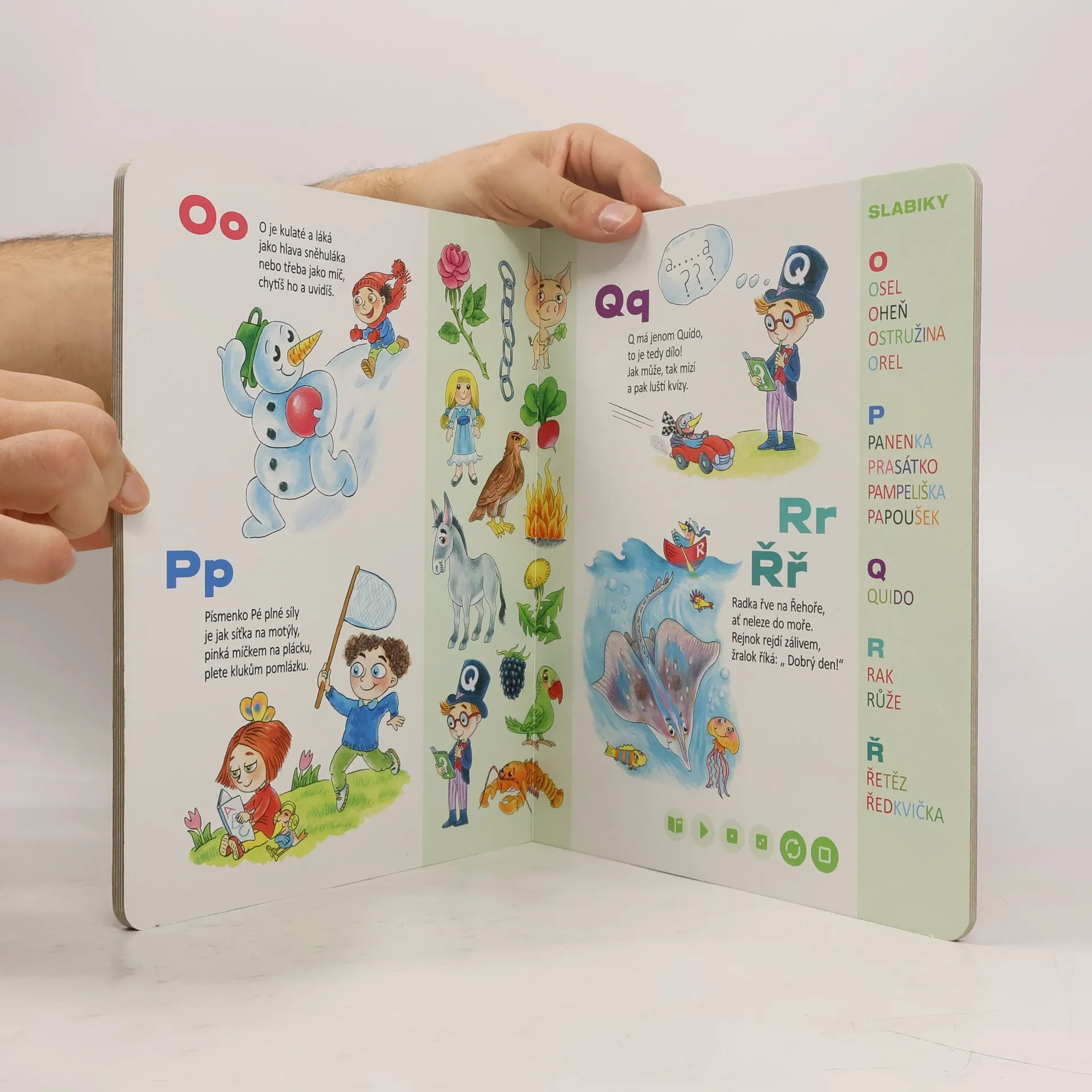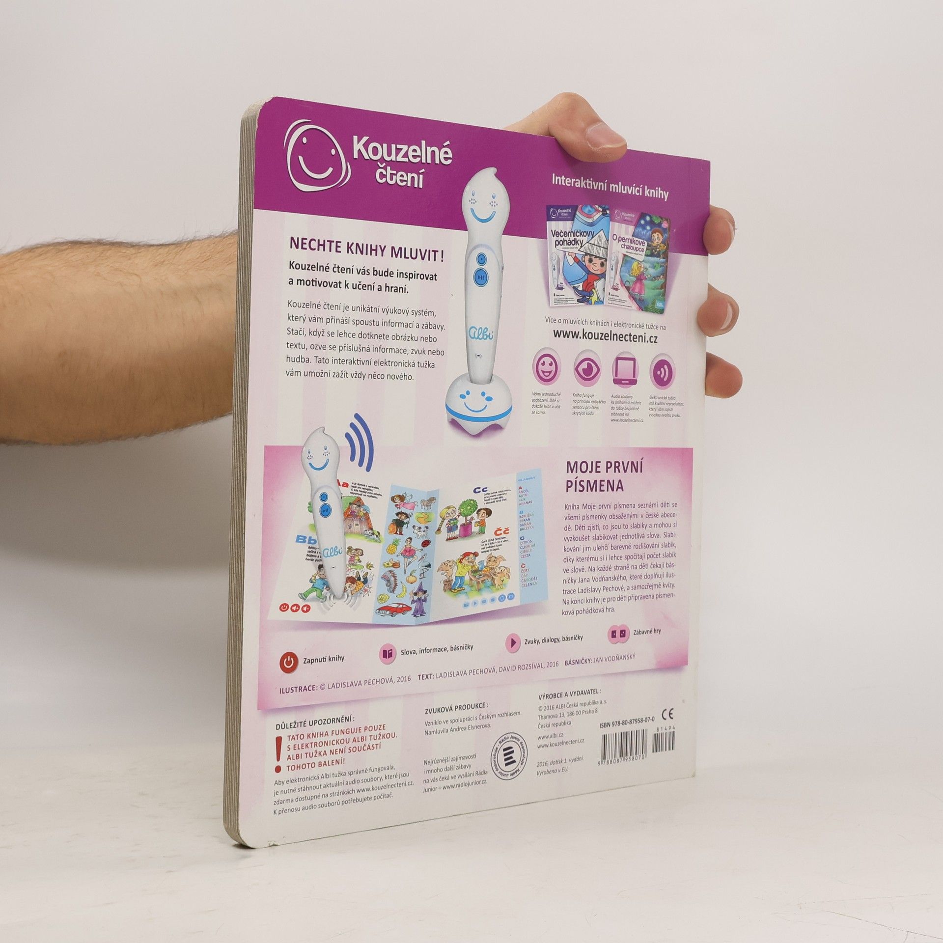 Interaktivní naučná kniha Moje první písmena seznámí děti od 3 let se všemi písmenky české abecedy. Kouzelné čtení tentokrát dětem představí nejen písmena, ale naučí je i slabiky. Slabikování si mohou za pomoci elektronické Albi tužky i vyzkoušet. Jednotlivé slabiky slov jsou barevně rozlišené, pro děti se tím slabikování stane rázem snadnější.