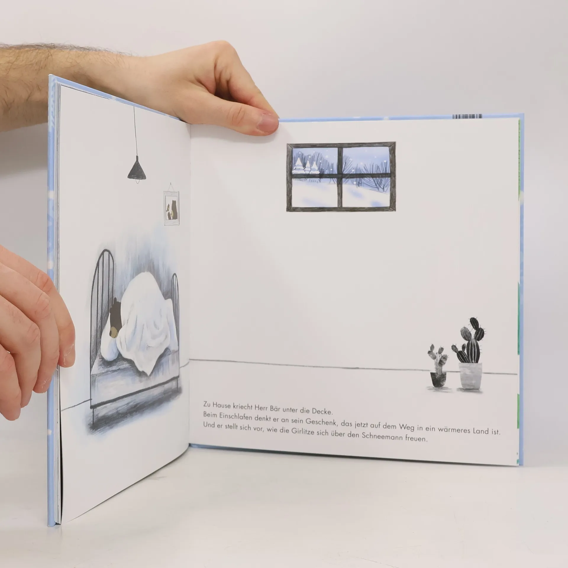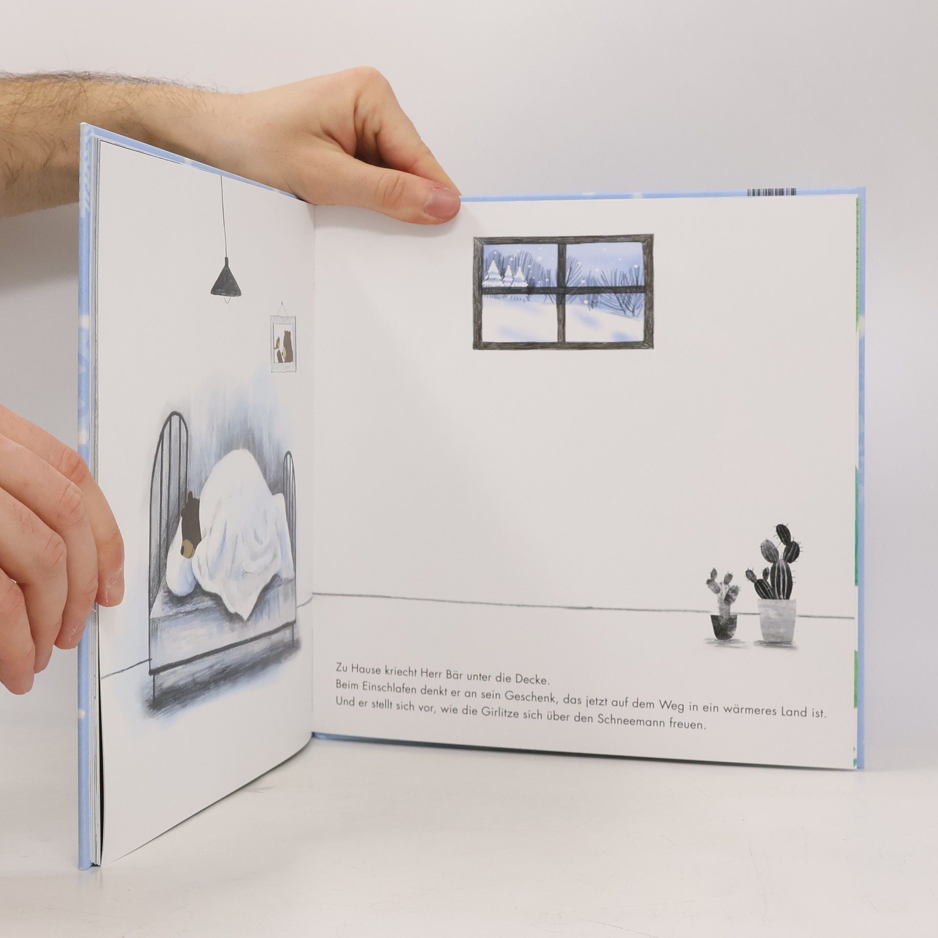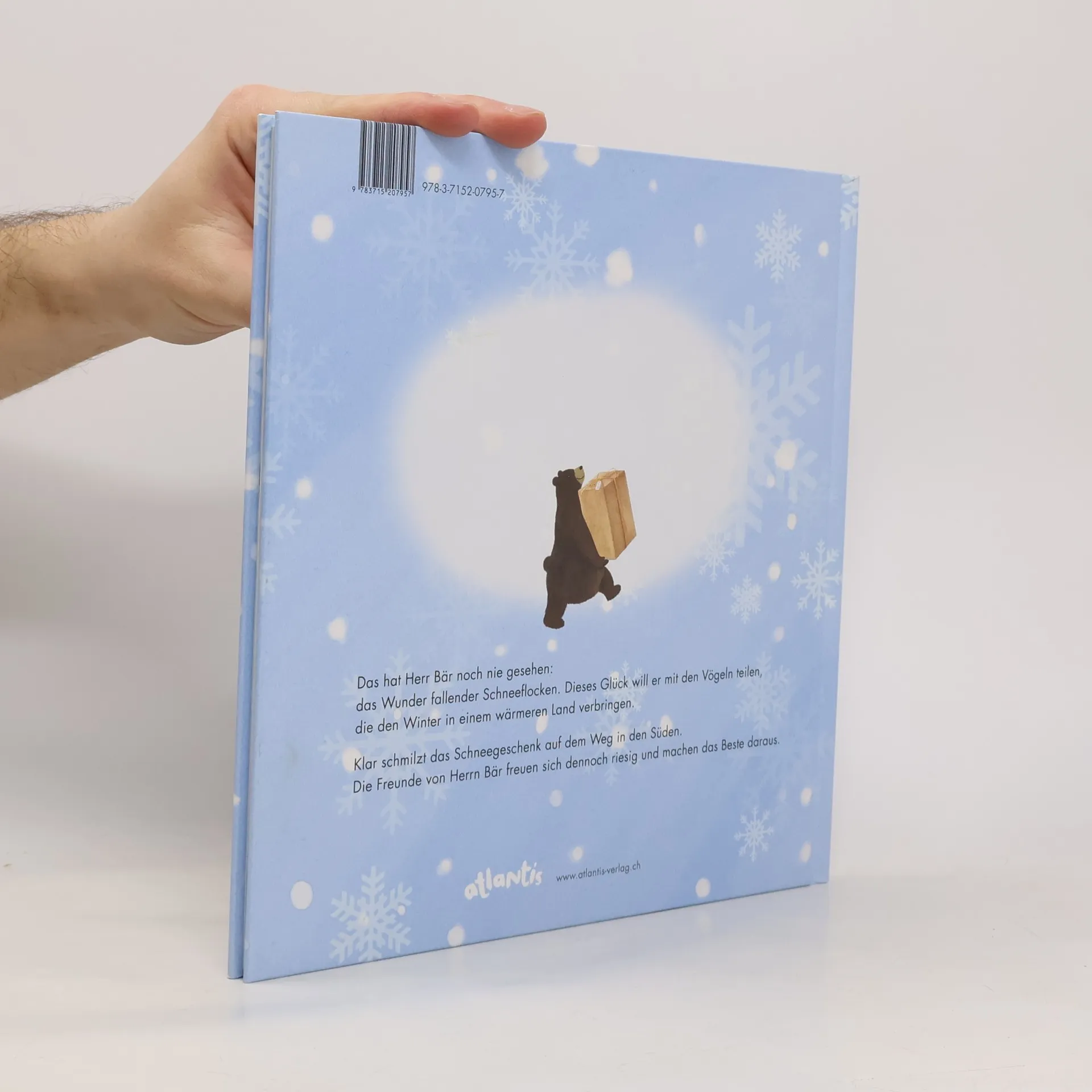 Das hat der Bär noch nie gesehen: Das Wunder fallender Schneeflocken. Lärm hat ihn aus dem Winterschlaf geweckt, verärgert ist er nach draußen gestapft. Und jetzt dieser Zauber! Er will das Schneeglück mit seinen Freunden teilen. Aber die zwei Girlitze sind in die Wärme gezogen. Was soll der Bär nun tun? Die Maus rät ihm, einen Schneemann zu bauen und diesen den Vögeln zu senden. Klar ist die Überraschung geschmolzen, bis sie ankommt. Aber die beiden Girlitze wissen sich zu helfen und freuen sich an dem Geschenk.