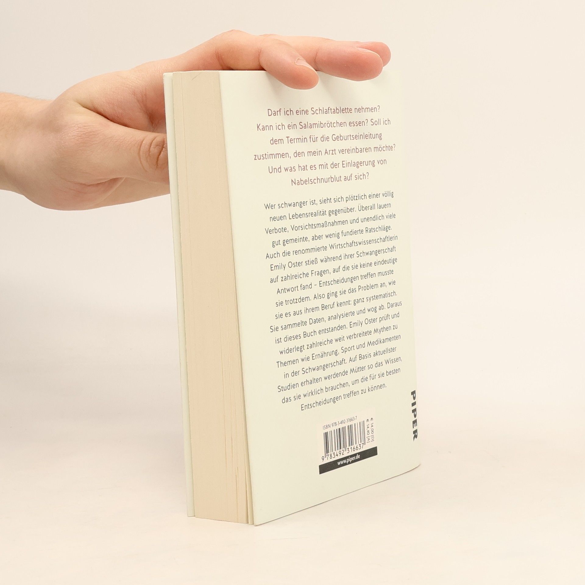 Antworten auf alle Fragen rund um die Themen Schwangerschaft und Geburt Während ihrer ersten Schwangerschaft erhielt Emily Oster immer wieder Ratschläge, die einander zwar widersprachen, aber alle mit beeindruckender Vehemenz vorgebracht wurden. Also ging sie das Problem systematisch an. Sie sammelte Daten, sie analysierte und wog ab. So ist dieses Buch entstanden: der erste große Schwangerschafts-Ratgeber aus der Feder einer Ökonomin. Emily Oster räumt auf mit zahlreichen weit verbreitete Mythen zu Ernährung während der Schwangerschaft, Alkohol und Bettruhe. Auf Basis aktuellster Studien erhalten werdende Mütter so das Wissen, das sie wirklich brauchen.
