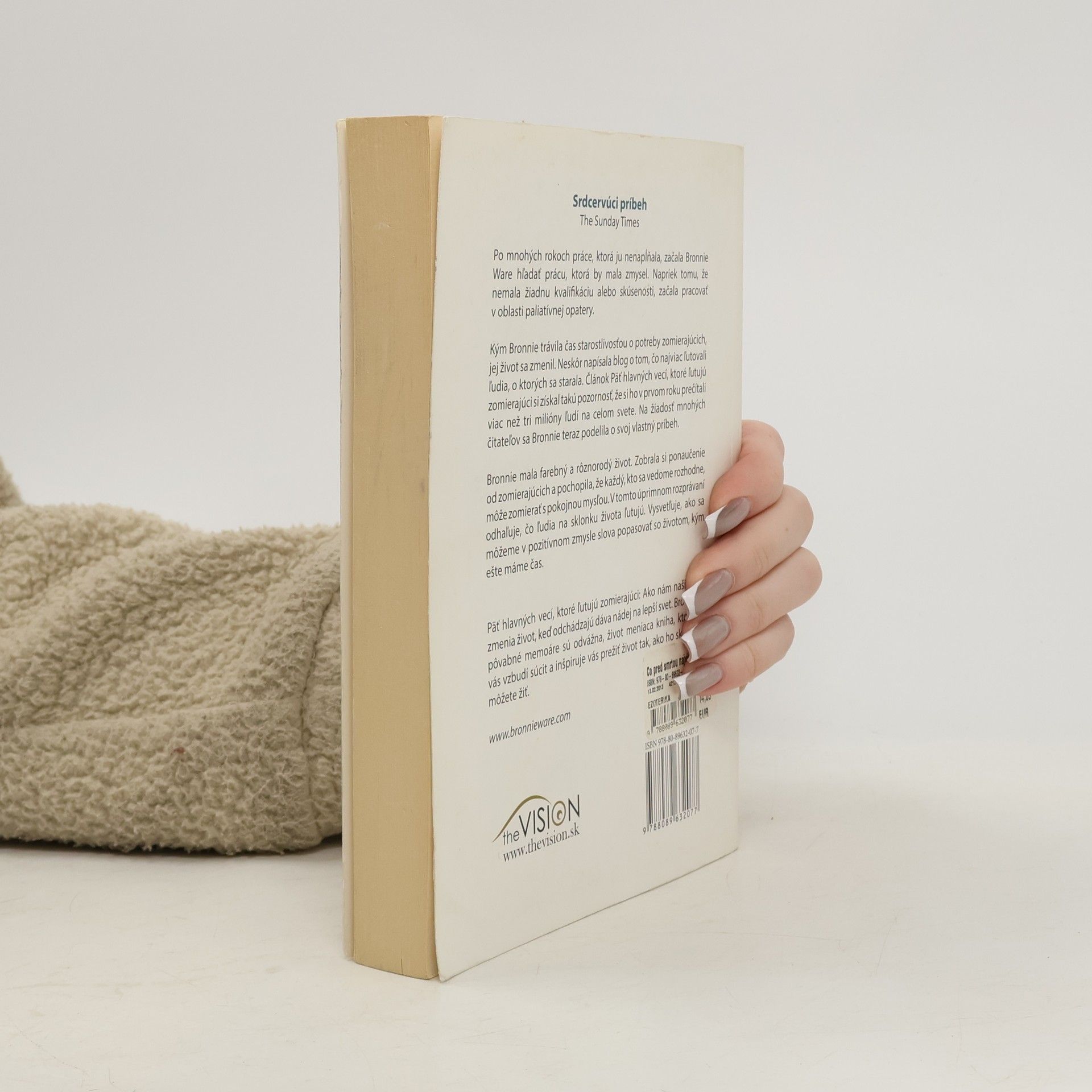 Po mnohých rokoch práce, ktorá ju nenapĺňala, začala Bronnie Ware hľadať prácu, ktorá by mala zmysel. Napriek tomu, že nemala žiadnu kvalifikáciu alebo skúsenosti, začala pracovať v oblasti paliatívnej opatery. Kým Bronnie trávila čas starostlivosťou o potreby zomierajúcich, jej život sa zmenil. Neskôr napísala blog o tom, čo najviac ľutovali ľudia, o ktorých sa starala. Článok "Čo pred smrťou najviac ľutujeme" si získal takú pozornosť, že si ho v prvom roku prečítali viac než tri milióny ľudí na celom svete. Na žiadosť mnohých čitateľov sa Bronnie teraz podelila o svoj vlastný príbeh. Bronnie mala farebný a rôznorodý život. Zobrala si ponaučenie od zomierajúcich a pochopila, že každý, kto sa vedome rozhodne, môže zomierať s pokojnou mysľou. V tomto úprimnom rozprávaní odhaľuje, čo ľudia na sklonku života ľutujú. Vysvetľuje, ako sa môžeme v pozitívnom zmysle slova popasovať so životom, kým ešte máme čas. Čo pred smrťou najviac ľutuje: Ako nám naši drahí zmenia život, keď odchádzajú dáva nádej na lepší svet. Bronniine pôvabné memoáre sú odvážna, život meniaca kniha, ktorá vo vás vzbudí súcit a inšpiruje vás prežiť život tak, ako ho skutočne môžete žiť.