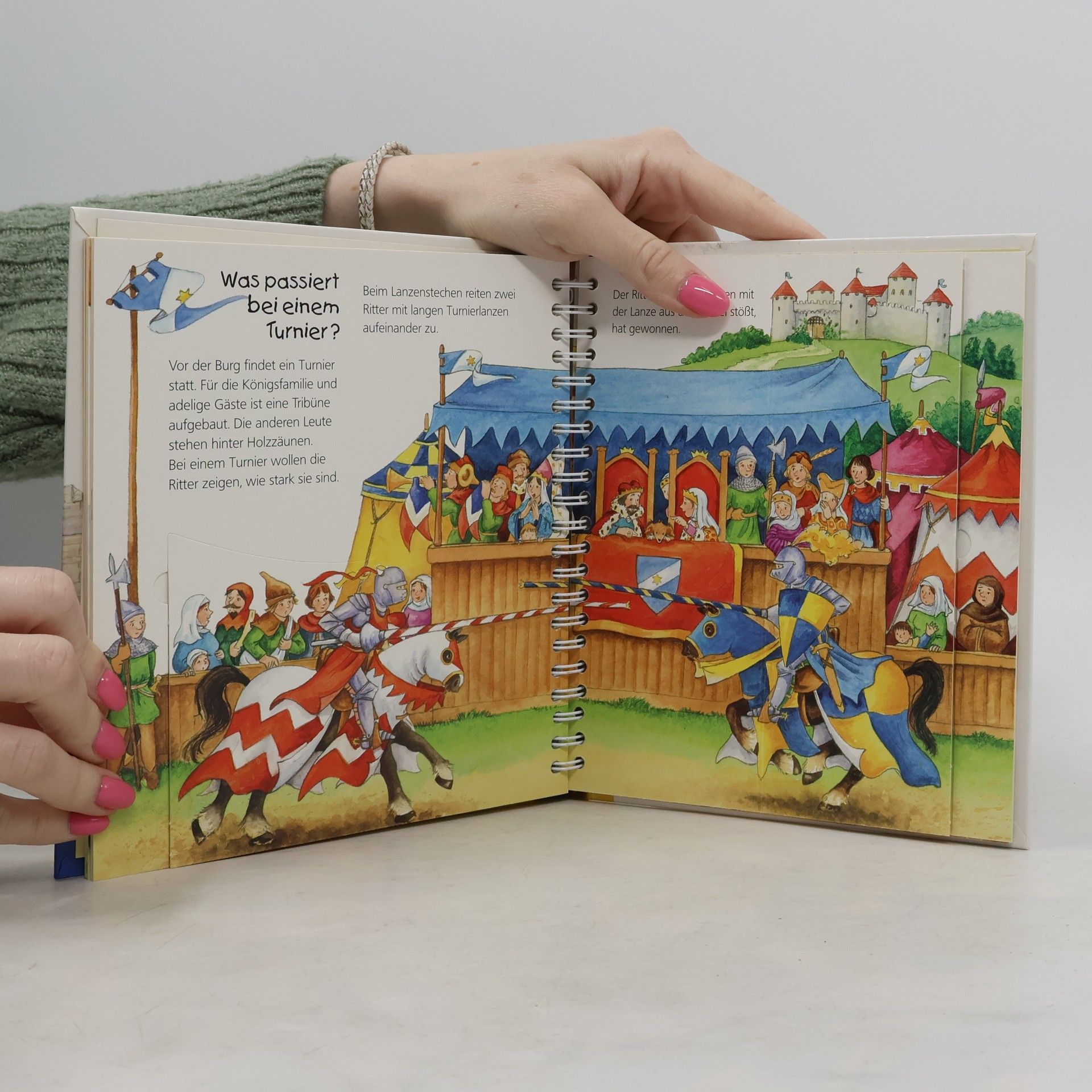 Knarrend wird die Zugbrücke heruntergelassen, und Kinder treten in die Burg von König Bodo ein. In den Türmen, Kammern und Gängen gibt es viel zu entdecken: Wer lebte wo auf der Burg? Was speisten Ritter und Burgfräulein? Was geschah bei einem Turnier? Hier finden Kinder Antworten auf ihre Fragen. Mit Klappen können sie dem Ritter seine Rüstung anlegen, ihn auf sein Pferd steigen lassen und das bunte Treiben im Burghof verändern. So kommt das Mittelalter ins Kinderzimmer. Die Sachbuchreihe für Kinder von 2-4 Jahren beantwortet die vielen Fragen, die Kinder täglich stellen. Themen wie die Feuerwehr, das Verhalten von Tieren im Winter oder die Notwendigkeit des Zähneputzens werden altersgerecht und detailverliebt behandelt. Die Reihe ist speziell auf kleine Hände und die Bedürfnisse der Kleinsten abgestimmt. Klare, liebevolle Bilder, kurze Sachtexte und handliche Klappen veranschaulichen Bewegungen und bieten überraschende Einblicke. Dies ermöglicht es Kindern, ihre Themen selbst zu erschließen. Der Spaß am eigenhändigen Entdecken, die liebevolle Umsetzung und die hochwertige Ausstattung garantieren langanhaltende Freude an jedem Buch.