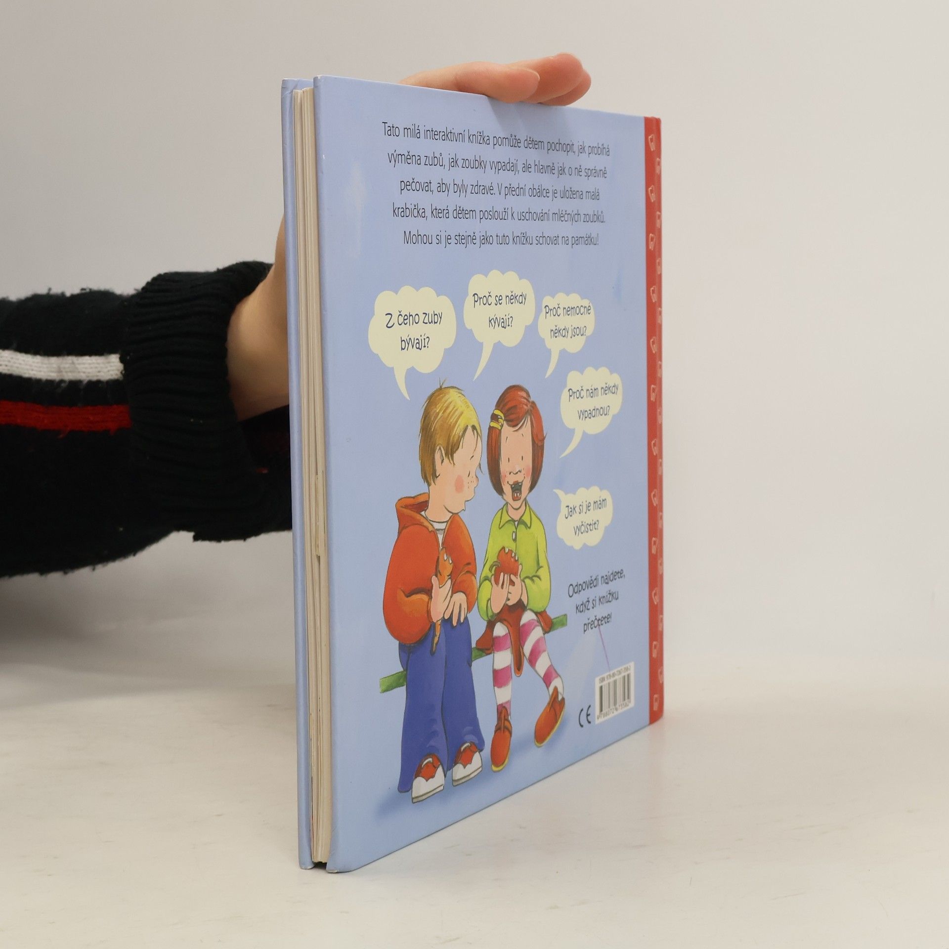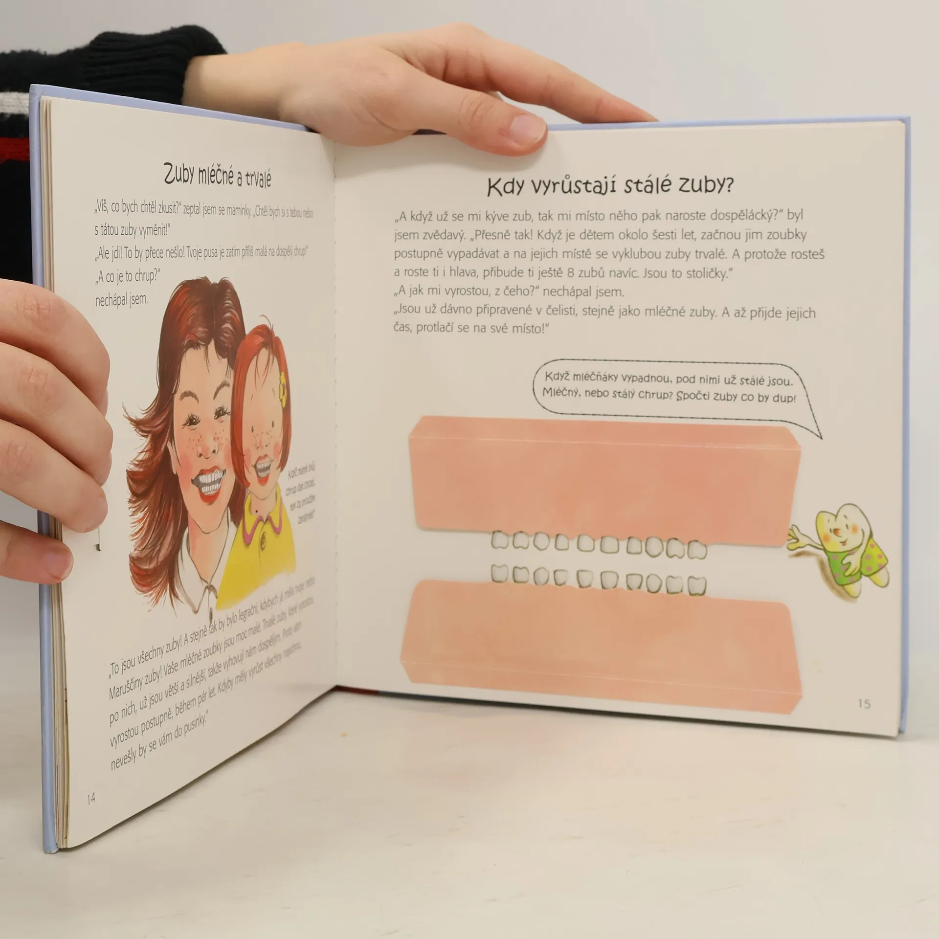 V této milé knížce pomůže Maruška a Ondrášek dětem pochopit, jak probíhá výměna zubů, jak zoubky vypadají uvnitř, ale hlavně jak o zoubky správně pečovat, aby byly zdravé. V přední obálce je uložená malá plechová krabička, která dětem poslouží k uschování mléčných zoubků. Mohou si je, stejně jako tuto knížku, uschovat na památku. Knížka kromě krabičky na mléčné zoubky zaujme děti zrcátkem na prohlížení zoubků a vytrháváním zoubku pomocí nitky.
