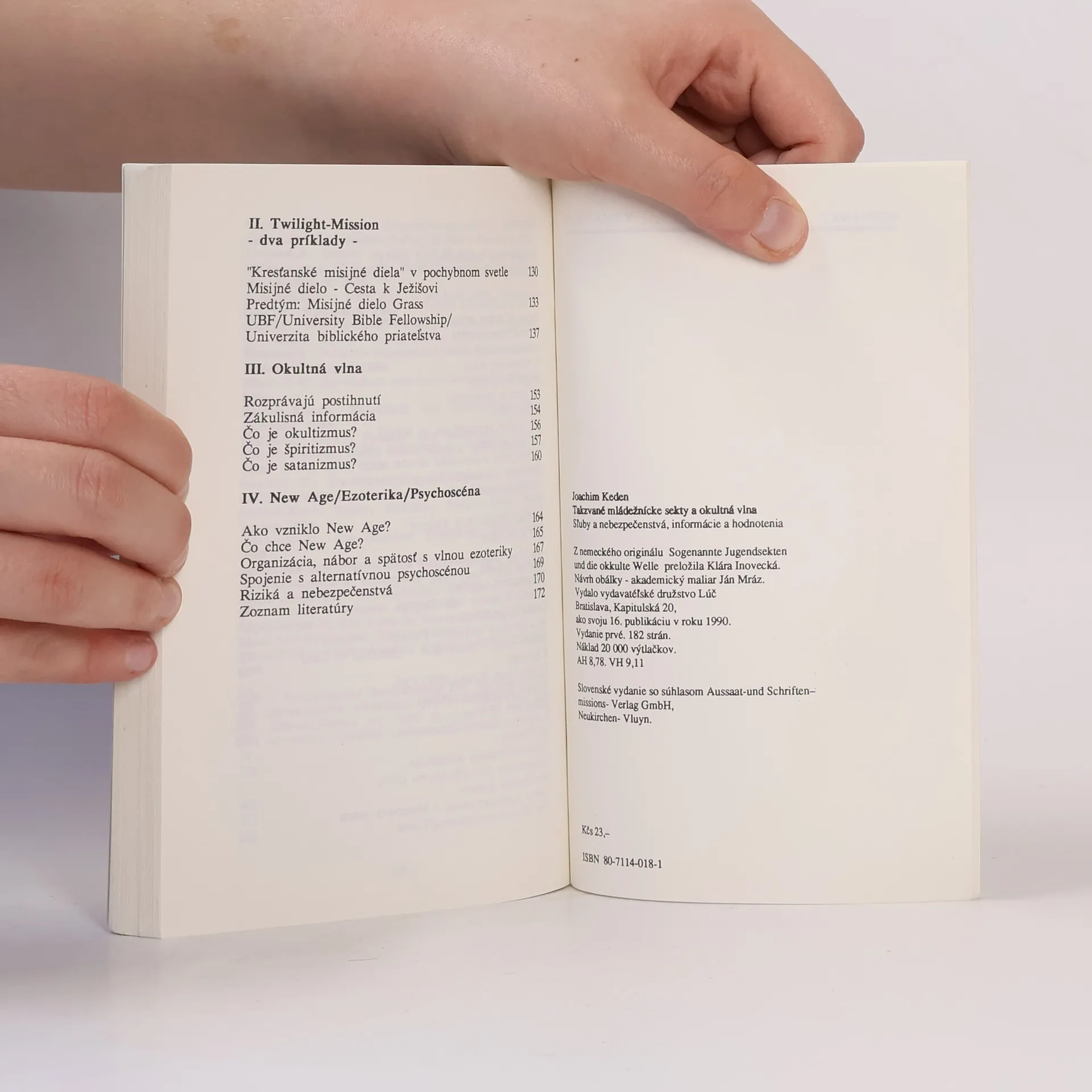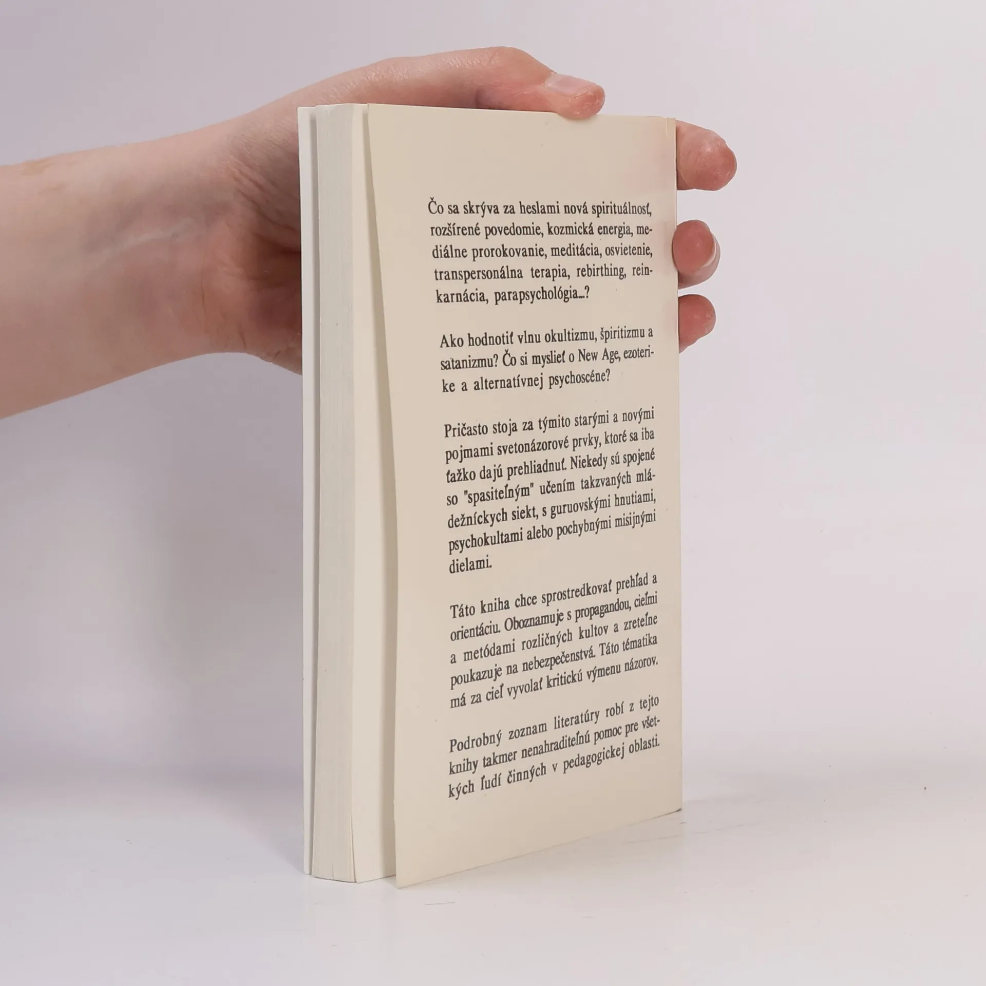 Podtitul: Sľuby a nebezpečenstvá, informácie a hodnotenia Publikácia má informatívny charakter a dodnes je jednou z mála svojho druhu na slovenskom knižnom trhu. Oboznamuje nás s praktikami a pôsobením siekt, rozšírených na celom Slovensku. Najohrozenejšia skupina populácie je mládež. Pretoje kniha určená predovšetkým mladým ľuďom, ale i rodičom, pedagógom a vychovávateľom. Čo sa skrýva za heslami nová spirituálnosť, rozšírené povedomie, kozmická energia, mediálne prorokovanie, meditácia, osvietenie, transpersonálna terapia, rebirthing, reinkarnácia, parapsychológia...? Ako hodnotiť vlnu okultizmu, špiritizmu a satanizmu? Čo si myslieť o New Age, ezoterike a alternatívnej psychoscéne? Pričasto stoja za týmito starými a novými pojmami svetonázorové prvky, ktoré sa iba tažko dajú prehliadnuť. Niekedy sú spojené so “spasiteľným” učením takzvaných mládežníckych siekt, s guruovskými hnutiami, psychokultami alebo pochybnými misijnými dielami. Táto kniha chce sprostredkovať prehľad a orientáciu. Oboznamuje s propagandou, cieľmi a metódami rozličných kultov a zreteľne poukazuje na nebezpečenstvá. Táto tématika má za ciel vyvolať kritickú výmenu názorov. Podrobný zoznam literatúry robí z tejto knihy takmer nenahraditeľnú pomoc pre všetkých ľudí činných v pedagogickej oblasti. Vydanie prvé