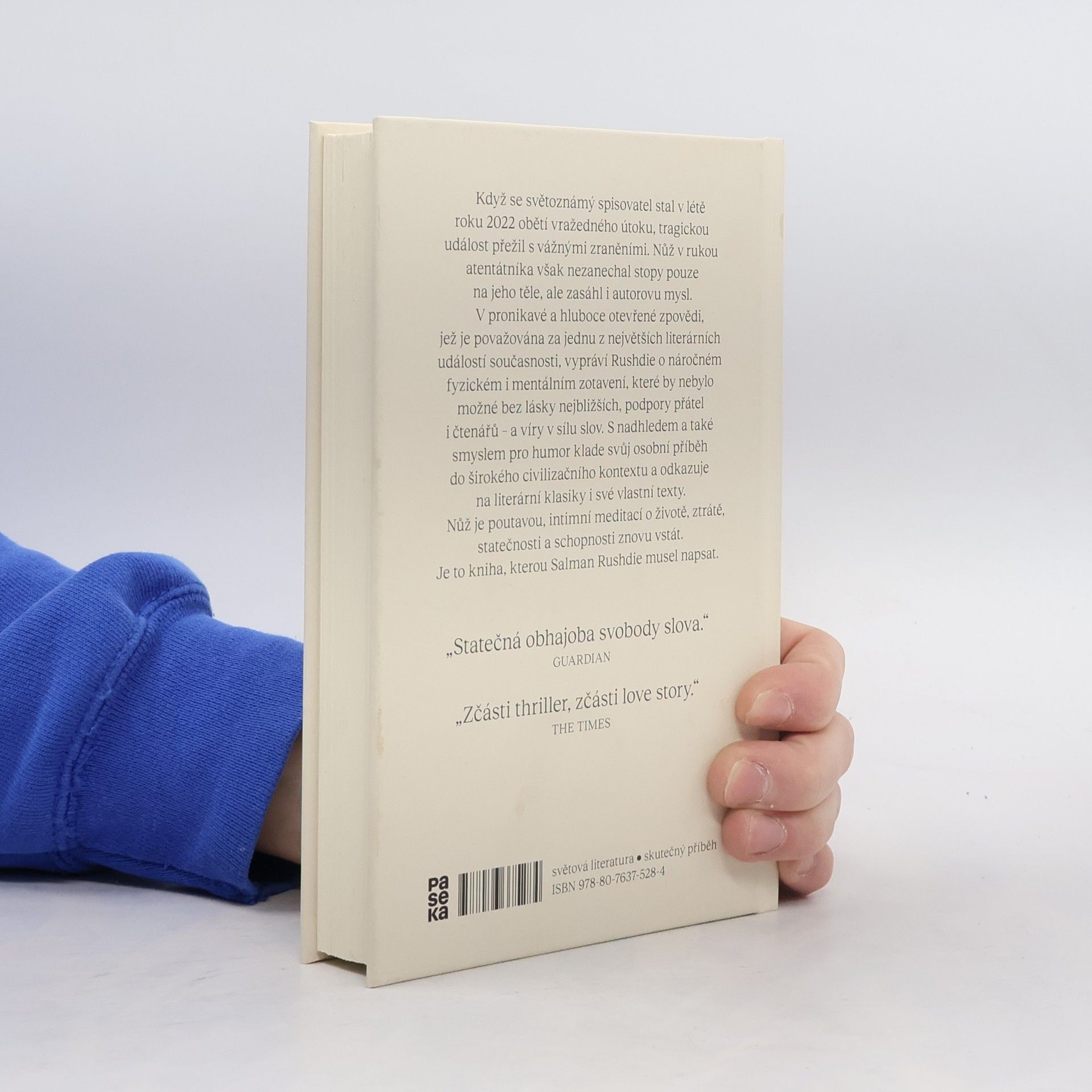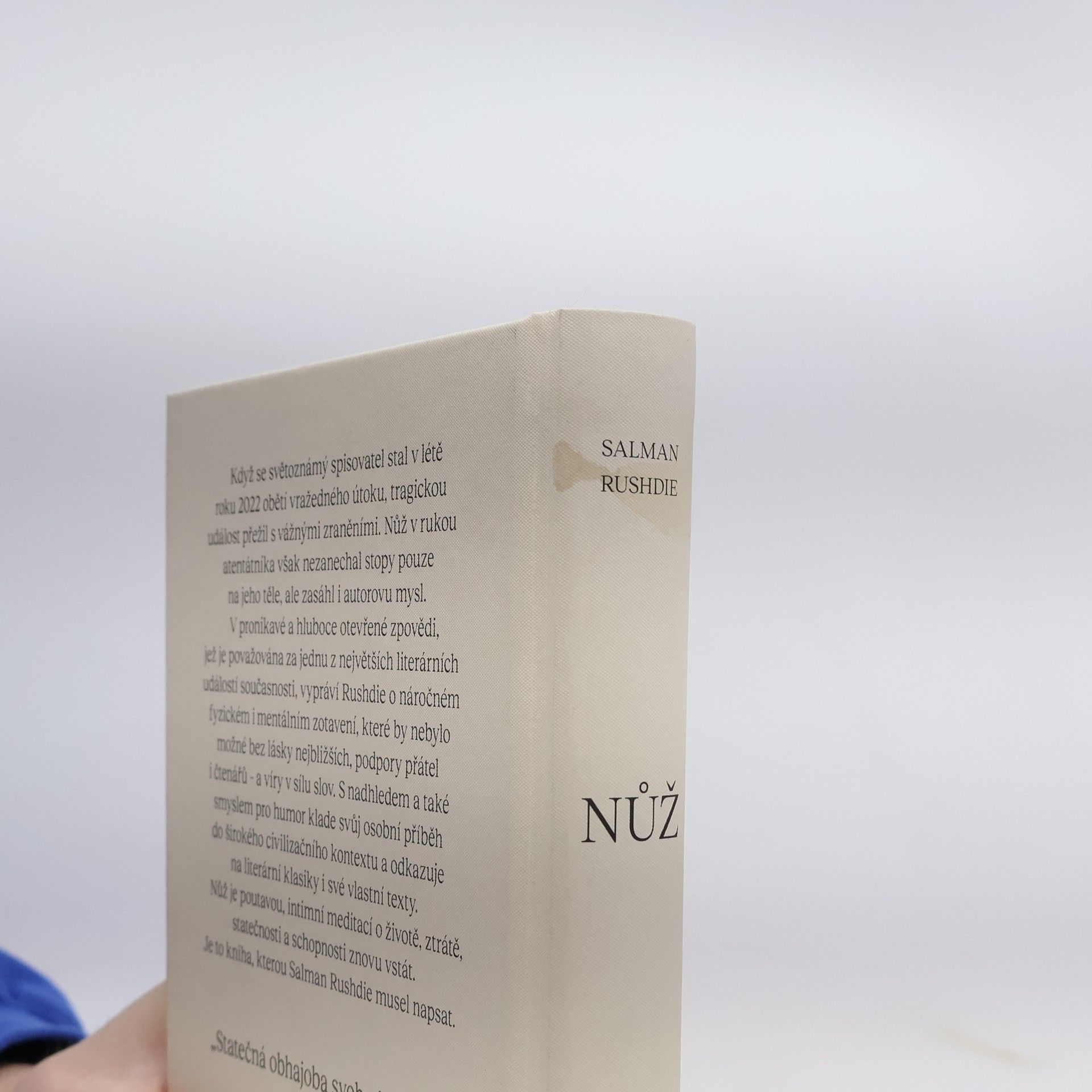 Když se světoznámý spisovatel stal v létě roku 2022 obětí vražedného útoku, tragickou událost přežil s vážnými zraněními. Nůž v rukou atentátníka však nezanechal stopy pouze na jeho těle, ale zasáhl i autorovu mysl. V pronikavé a hluboce otevřené zpovědi, jež je považována za jednu z největších literárních událostí současnosti, vypráví Rushdie o náročném fyzickém i mentálním zotavení, které by nebylo možné bez lásky nejbližších, podpory přátel i čtenářů – a víry v sílu slov. S nadhledem a také smyslem pro humor klade svůj osobní příběh do pletiva světového písemnictví a odkazuje na literární klasiky i své vlastní texty. Nůž je poutavou, intimní meditací o životě, ztrátě, statečnosti a schopnosti znovu vstát. Je to kniha, kterou Salman Rushdie musel napsat.