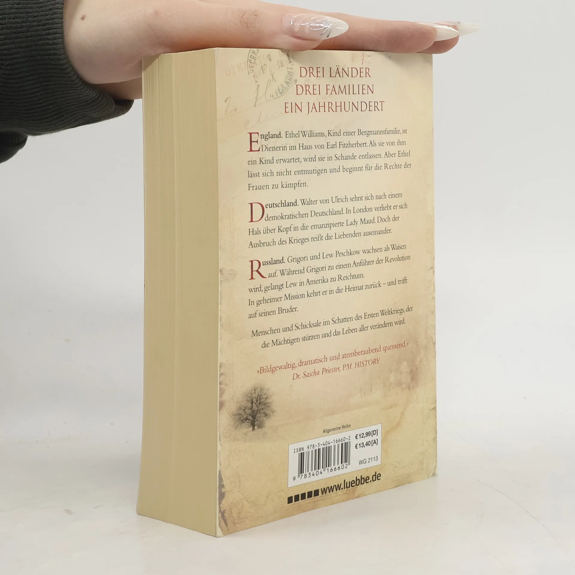 DREI LÄNDER. DREI FAMILIEN. EIN JAHRHUNDERT. Die große Familiensaga von Ken Follett, Autor der Bestseller DIE SÄULEN DER ERDE und DIE TORE DER WELT. Im Jahr 1914 herrscht in Europa Frieden, doch die Weltmächte rüsten zum Krieg. Der drohende Konflikt beeinflusst das Leben mehrerer Familien aus verschiedenen Ländern, deren Wege sich über ein ganzes Jahrhundert kreuzen. Ethel Williams, Tochter einer Bergmannsfamilie aus Wales, wird als Dienerin im Haus von Earl Fitzherbert schwanger und entlassen. Unbeirrt kämpft sie für die Rechte der Frauen, während die Männer in den Krieg ziehen. Walter von Ulrich, aus einer Adelsfamilie, wünscht sich ein demokratisches Deutschland und heiratet heimlich die emanzipierte Lady Maud, kurz bevor der Krieg ausbricht. Doch der Konflikt trennt die Liebenden. Grigori und Lew Peschkow wachsen als Waisen in St. Petersburg auf. Während der rechtschaffene Grigori zum Revolutionär wird, erlangt der leichtfertige Lew in Amerika Reichtum. Als Lew zur Armee eingezogen wird und als Soldat zurückkehrt, trifft er auf seinen Bruder. Als abgeschlossener historischer Roman ist dies der spannende Auftakt von Folletts Jahrhundert-Trilogie, die mit WINTER DER WELT fortgesetzt wird und mit KINDER DER FREIHEIT endet. Platz 1 der SPIEGEL-Bestsellerliste. „Bildgewaltig, dramatisch und atemberaubend spannend.“ Dr. Sascha Priester, P. M. History. Mit einer Leseprobe aus WINTER DER WELT.