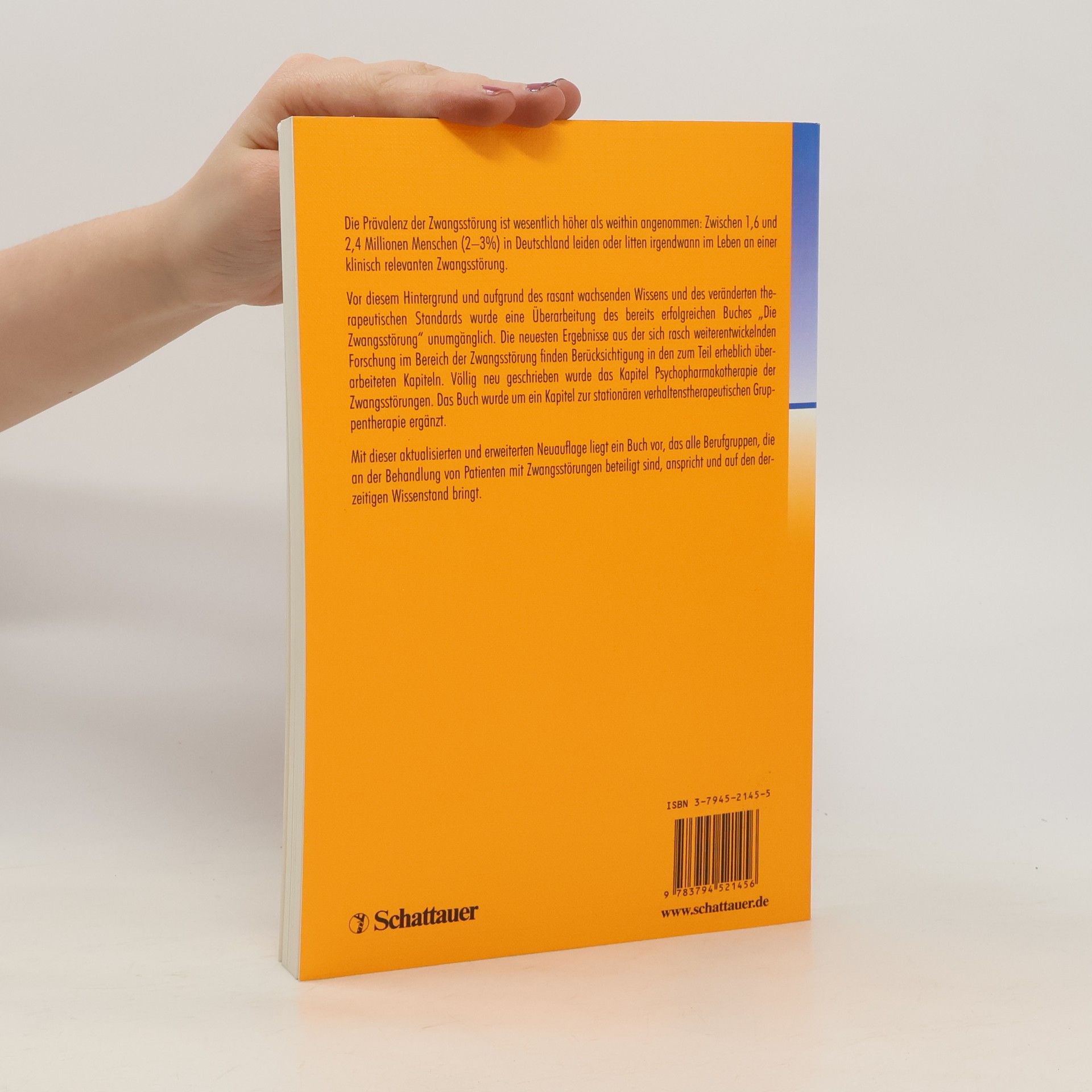 Die Prävalenz der Zwangsstörung ist wesentlich höher als weithin angenommen: Zwischen 1,6 und 2,4 Millionen Menschen (2-3%) in Deutschland leiden oder litten irgendwann im Leben an einer klinisch relevanten Zwangsstörung. §Vor diesem Hintergrund und aufgrund des rasant wachsenden Wissens und des veränderten therapeutischen Standards wurde eine Überarbeitung des bereits erfolgreichen Buches 'Die Zwangsstörung' erforderlich. Die neuesten Forschungsergebnisse im Bereich der Zwangsstörung finden in erheblich überarbeiteten Kapiteln Berücksichtigung. Völlig neu geschrieben wurde das Kapitel Psychopharmakotherapie der Zwangsstörungen. Das Buch wurde um ein Kapitel zur stationären verhaltenstherapeutischen Gruppentherapie ergänzt. §Mit dieser aktualisierten und erweiterten Neuauflage liegt ein Buch vor, das alle Berufgruppen, die an der Behandlung von Patienten mit Zwangsstörungen beteiligt sind, anspricht und auf den derzeitigen Wissenstand bringt.
