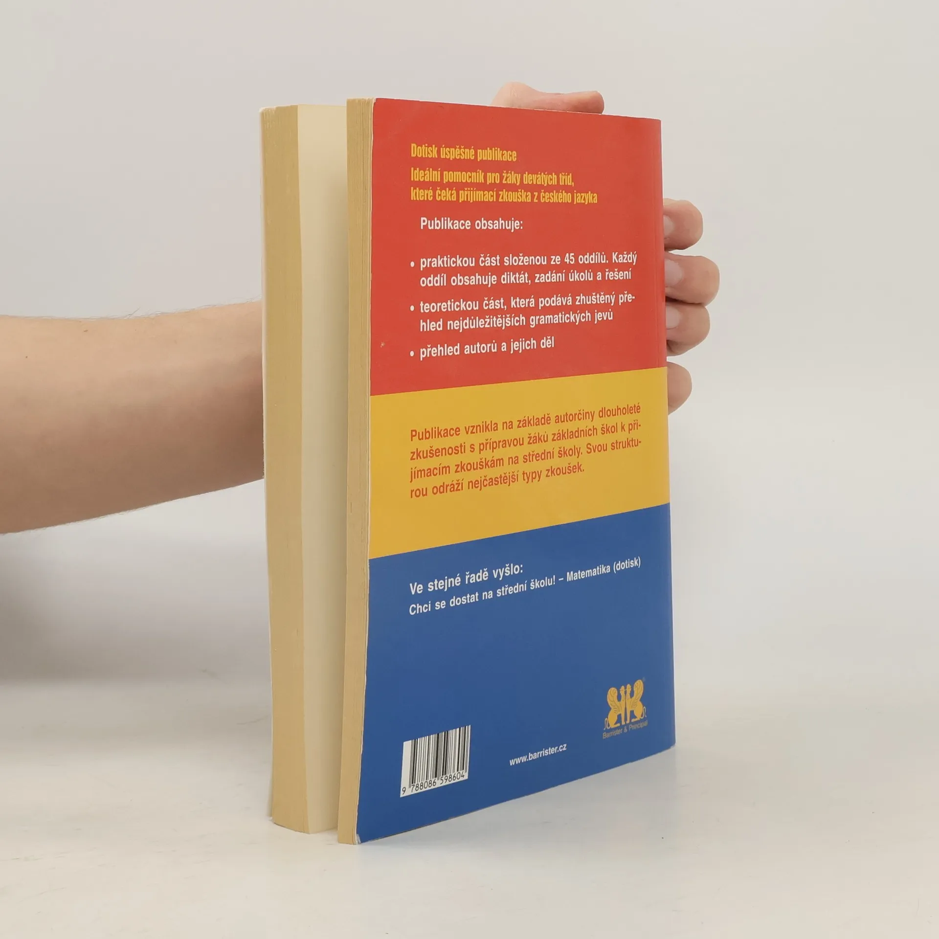Ideální pomocník pro žáky devátých tříd, které čeká přijímací zkouška z českého jazyka. Obsahuje praktickou část složenou ze 45 oddílů. Každý oddíl obsahuje diktát, zadání úkolů a řešení. Teoretickou část, která podává zhuštěný přehled nejdůležitějších gramatických jevů. Přehled autorů a jejich děl.