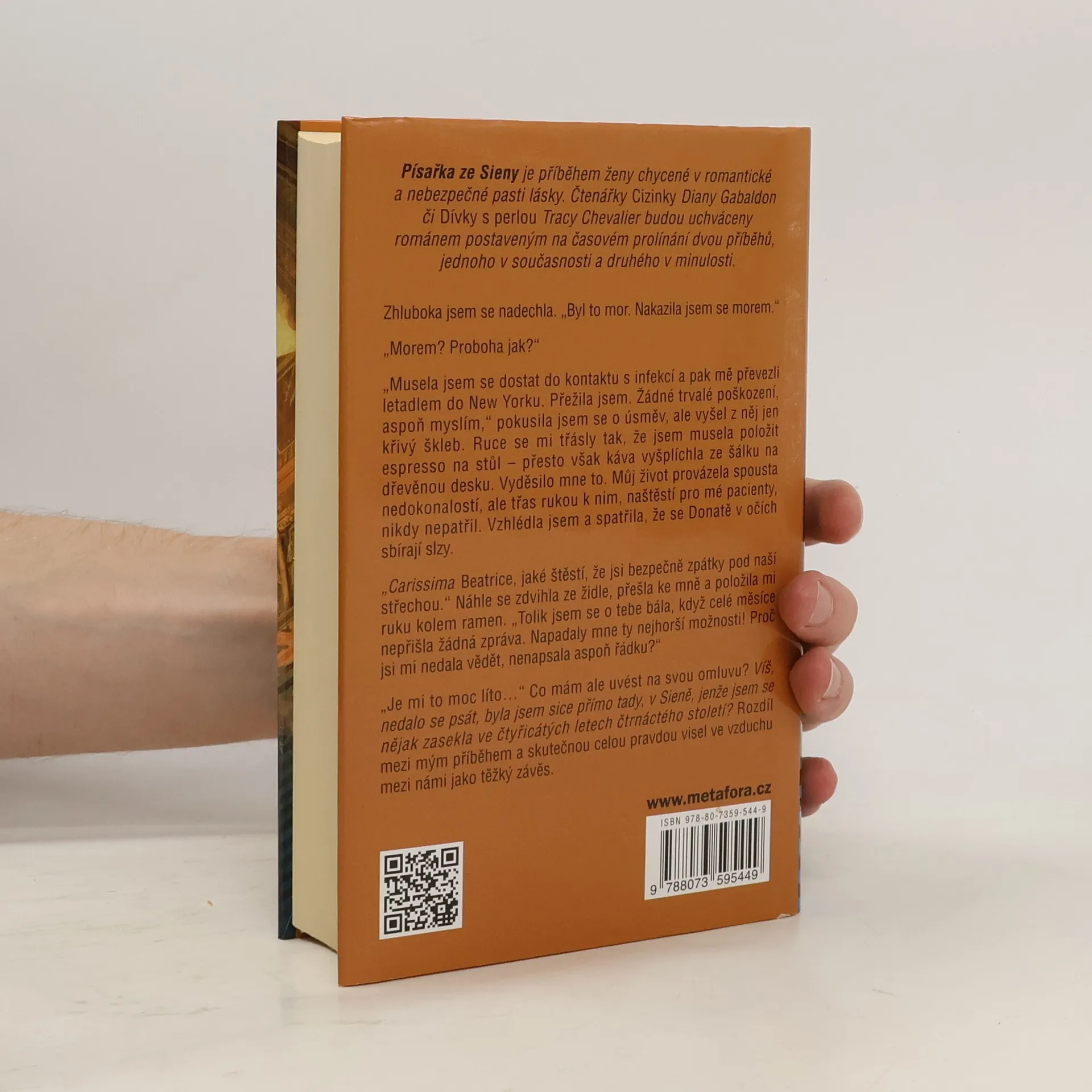 Záhadný deník ze 14. století spojí dva lidi napříč časem. Pro milovníky románů Dívka s perlou nebo Cizinka. Strhující love story a zároveň napínavý historický detektivní příběh, v němž se stírají hranice mezi minulostí a přítomností. Beatrice Trovato, mladá doktorka neurochirurgie z New Yorku, sice dobře ví, jak funguje lidský mozek, ale v záležitostech srdce se zrovna moc nevyzná. Po nenadálém úmrtí svého bratra, který žil v Itálii, letí jako jeho jediná dědička z New Yorku do Sieny. Bratr jí nechal dům a k tomu složku s výsledky svého bádání, zabývajícího se tajnými dějinami tohoto toskánského města v dobách jeho naprostého zmaru během morové epidemie ve 14. století. Beatrice se stále hlouběji noří do tajemství, které jí zanechal, a jednoho dne narazí na deník malíře fresek Gabriela Accorsiho, na jehož obrazu ke svému překvapení zahlédne svou vlastní tvář. Minulost a přítomnost se záhadně protnou a Beatrice se ocitne v roce 1347 v Sieně, těsně před propuknutím morové rány. S pomocí Gabriela odhalí zlovolné spiknutí, jehož důsledky zasahují až do stovky let vzdálené budoucnosti. V okamžiku, kdy si černá smrt začíná vybírat první oběti, se Beatrice musí rozhodnout, do které doby skutečně patří.