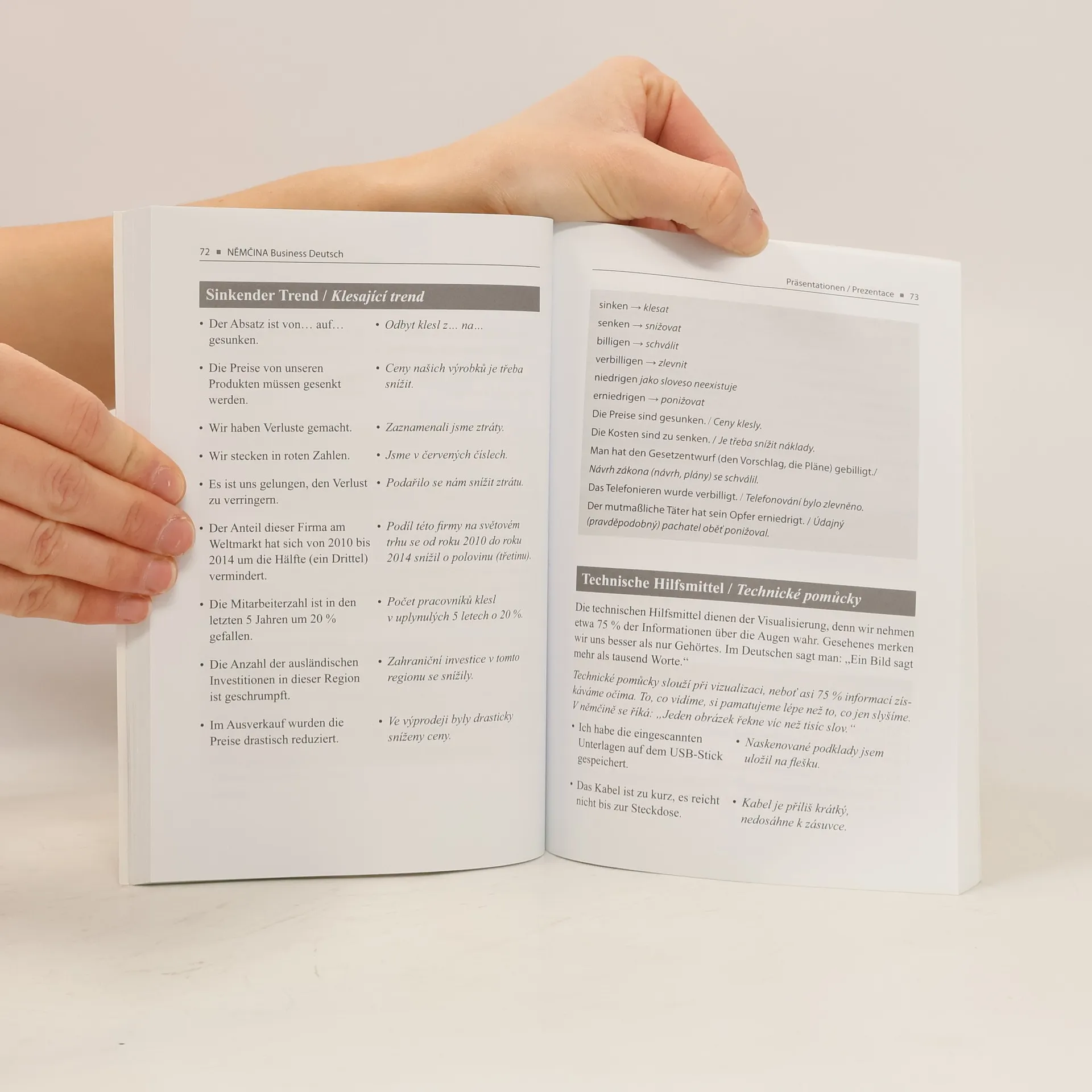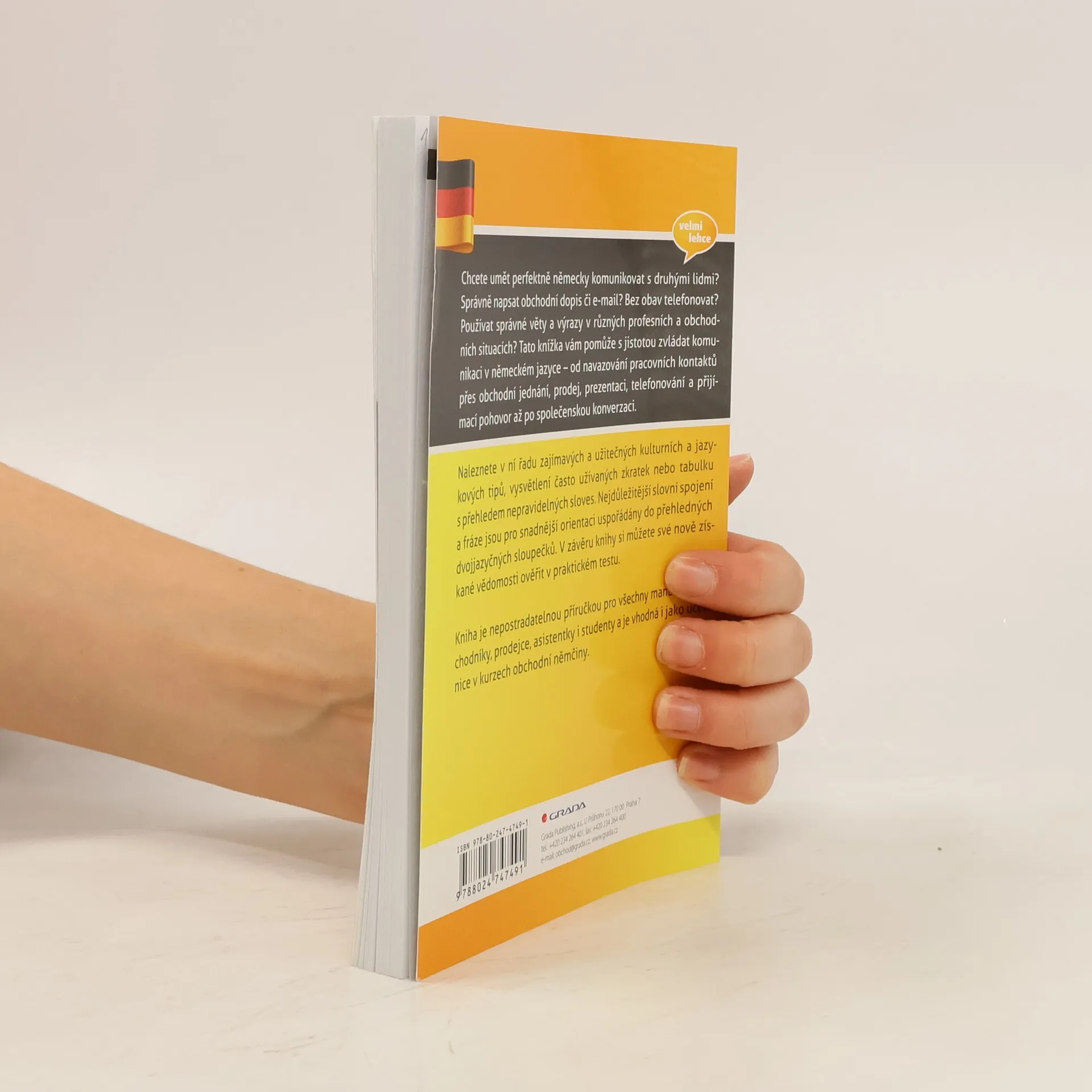 Chcete umět perfektně německy komunikovat s druhými lidmi? Správně napsat obchodní dopis či e-mail? Bez obav telefonovat? Používat správné věty a výrazy v různých profesních a obchodních situacích? Tato knížka vám pomůže s jistotou zvládat komunikaci v německém jazyce – od navazování pracovních kontaktů přes obchodní jednání, prodej, prezentaci, telefonování a přijímací pohovor až po společenskou konverzaci. Naleznete v ní řadu zajímavých a užitečných kulturních a jazykových tipů, vysvětlení často užívaných zkratek nebo tabulku s přehledem nepravidelných sloves. Nejdůležitější slovní spojení a fráze jsou pro snadnější orientaci uspořádány do přehledných dvojjazyčných sloupečků. V závěru knihy si můžete své nově získané vědomosti ověřit v praktickém testu. Kniha je nepostradatelnou příručkou pro všechny manažery, obchodníky, prodejce, asistentky i studenty a je vhodná i jako učebnice v kurzech obchodní němčiny.