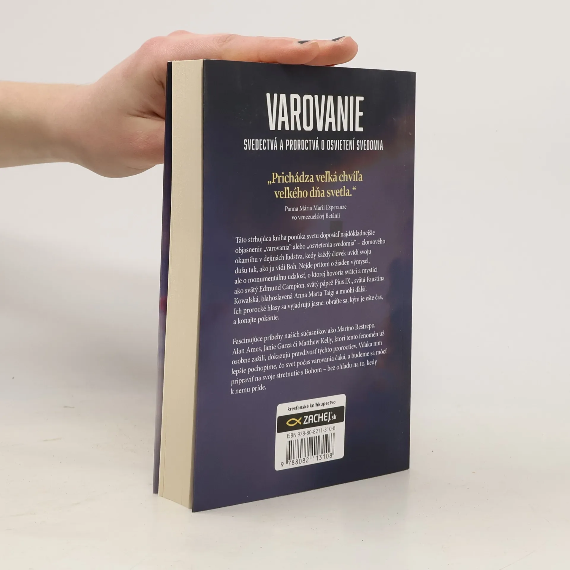Táto strhujúca kniha ponúka svetu doposial' najdôkladnejšie objasnenie "varovania" alebo "osvetenia svedomia" - zlomového okamihu v dejinách ľudstva, kedy každý človek uvidí svoju dušu tak, ako ju vidí Boh. Nejde pritom o žiaden výmysel, ale o monumentálnu udalosť, o ktorej hovoria svätci a mystici ako svätý Edmund Campion, svätý pápež Pius IX., svätá Faustína Kowalská, blahoslavená Anna Maria Taigi a mnohí ďalší. Ich prorocké hlasy sa vyjadrujú jasne: obráťte sa, kým je ešte čas, a konajte pokánie. Fascinujúce príbehy našich súčasníkov ako Marino Restrepo, Alan Ames, Janie Garza či Matthew Kelly, ktorí tento fenomén už osobne zažili, dokazujú pravdivosť týchto proroctiev. Vďaka nim lepšie pochopíme, čo svet počas varovania čaká, a budeme sa môcť pripraviť na svoje stretnutie s Bohom - bez ohľadu na to, kedy k nemu dôjde.