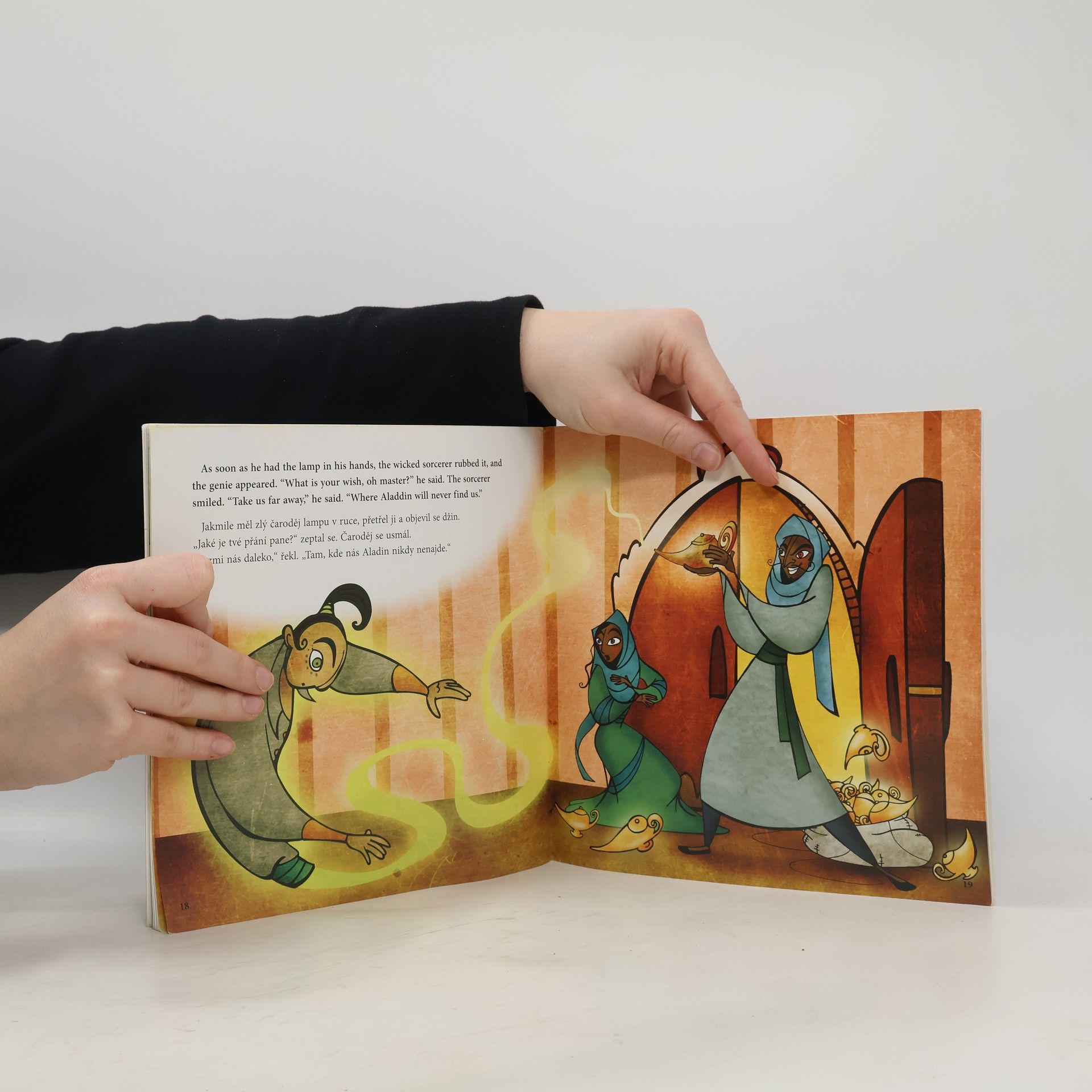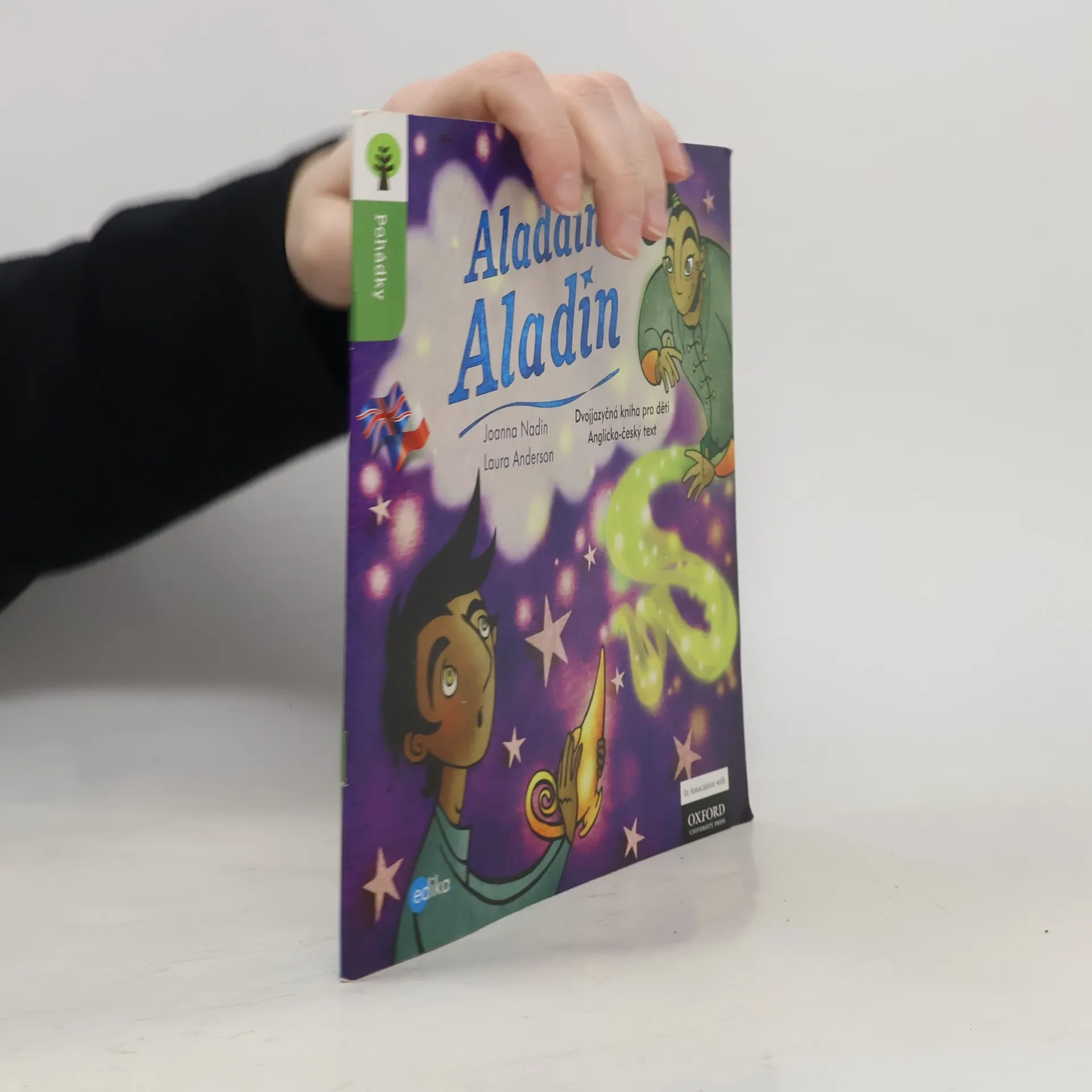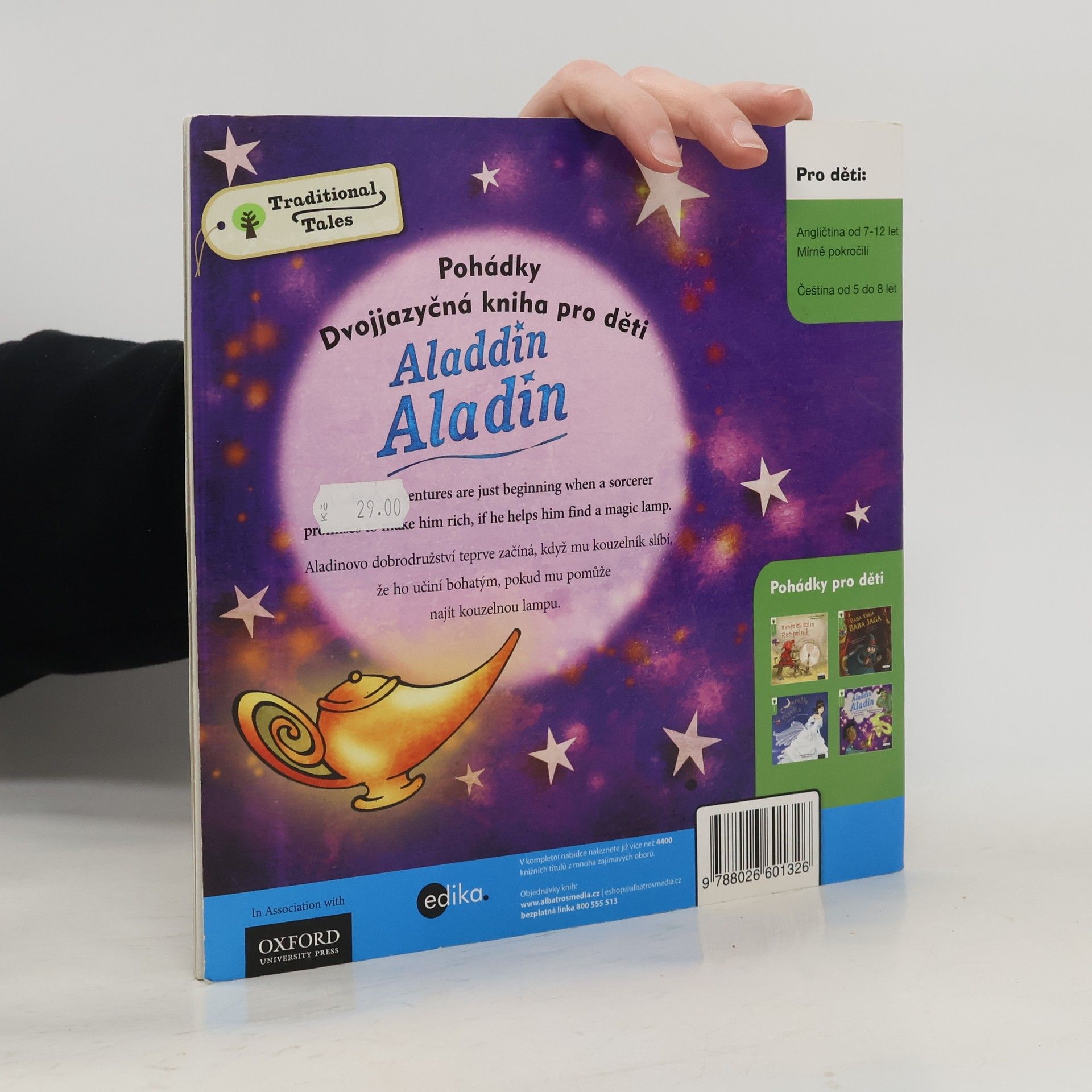 Aladin byl jedním z příběhů tisíce a jedné noci, ze souboru lidových pověstí z Blízkého východu shromážděného v průběhu mnoha staletí. Jako v každé správné pohádce i v naší vítězí dobro nad zlem. Napínavý příběh mohou číst děti samy, s rodiči anebo poslouchat ve formě mp3 namluvené rodilými herci, uložené na webu Albatros Media. Vydavatelství Edika připravilo ve spolupráci s Oxford University Press dvojjazyčné verze patnácti klasických pohádek. V angličtině jsou určeny pro čtenáře ve věku od 7 do 12 let.
