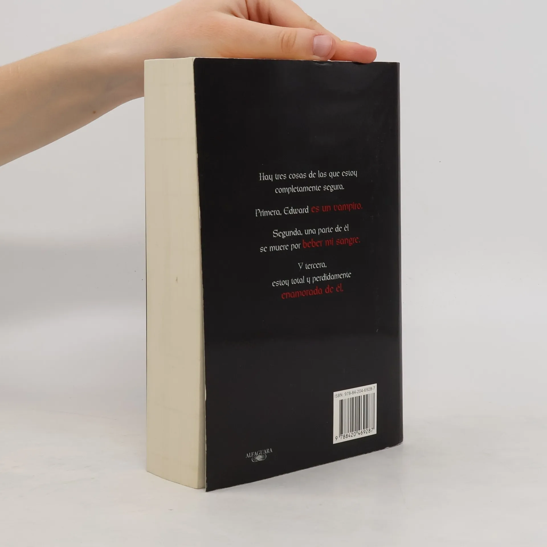 «Hay tres cosas de las que estoy completamente segura. Primera, Edward es un vampiro. Segunda, una parte de él se muere por beber mi sangre. Y tercera, estoy total y perdidamente enamorada de él». Cuando Isabella Swan se muda a Forks, una pequeña localidad del estado de Washington en la que no deja de llover, piensa que es lo más aburrido que le podía haber ocurrido en la vida. Pero su vida da un giro excitante y aterrador una vez que se encuentra con el misterioso y seductor Edward Cullen. Hasta ese momento, Edgard se las ha arreglado para mantener en secreto su identidad vampírica, pero ahora nadie se encuentra a salvo, y sobre todo Isabella, la persona a quien más quiere Edward...