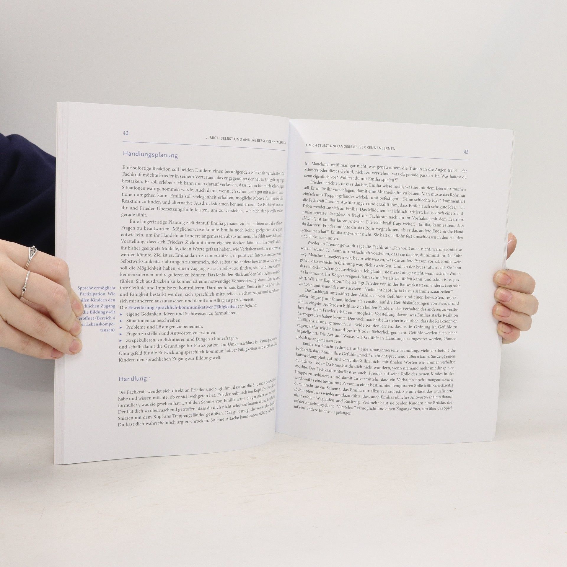 Der vorliegende Titel von drei Expertinnen/Experten im Bereich der frühkindlichen Entwicklungspsychologie stellt sechs Bereiche der Lebenskompetenzen von Kindern im Alter von 4 bis 6 Jahren vor: Beziehungsfähigkeit, Selbst- und Fremdwahrnehmung, Körperwahrnehmung, Kommunikationsfähigkeit usw. Pädagogische Fachkräfte erhalten einen Überblick darüber, welchen Stand Kinder über vier in ihren sozio-emotionalen und kognitiven Entwicklungsbereichen haben und welche Möglichkeiten es gibt, diese im Alltag weiter zu fördern. Dabei geht es nicht darum, rezeptartige Anleitungen für Übungen, Projekte und Spiele vorzustellen, sondern die eigene Deutungskompetenz zu erweitern. Ein kurzes Kapitel befasst sich mit dem "Aufbau einer Bibliothek" in der Kita. Mit Farbfotos und eingerahmten konkreten Fallbeispielen aus dem Kita-Alltag vom Layout her aufgelockert gestaltet. Mit einem ausführlichen Literaturverzeichnis. Alternativ zu "Stark von Anfang an" von Gabriele Haug-Schnabel. (2-3)