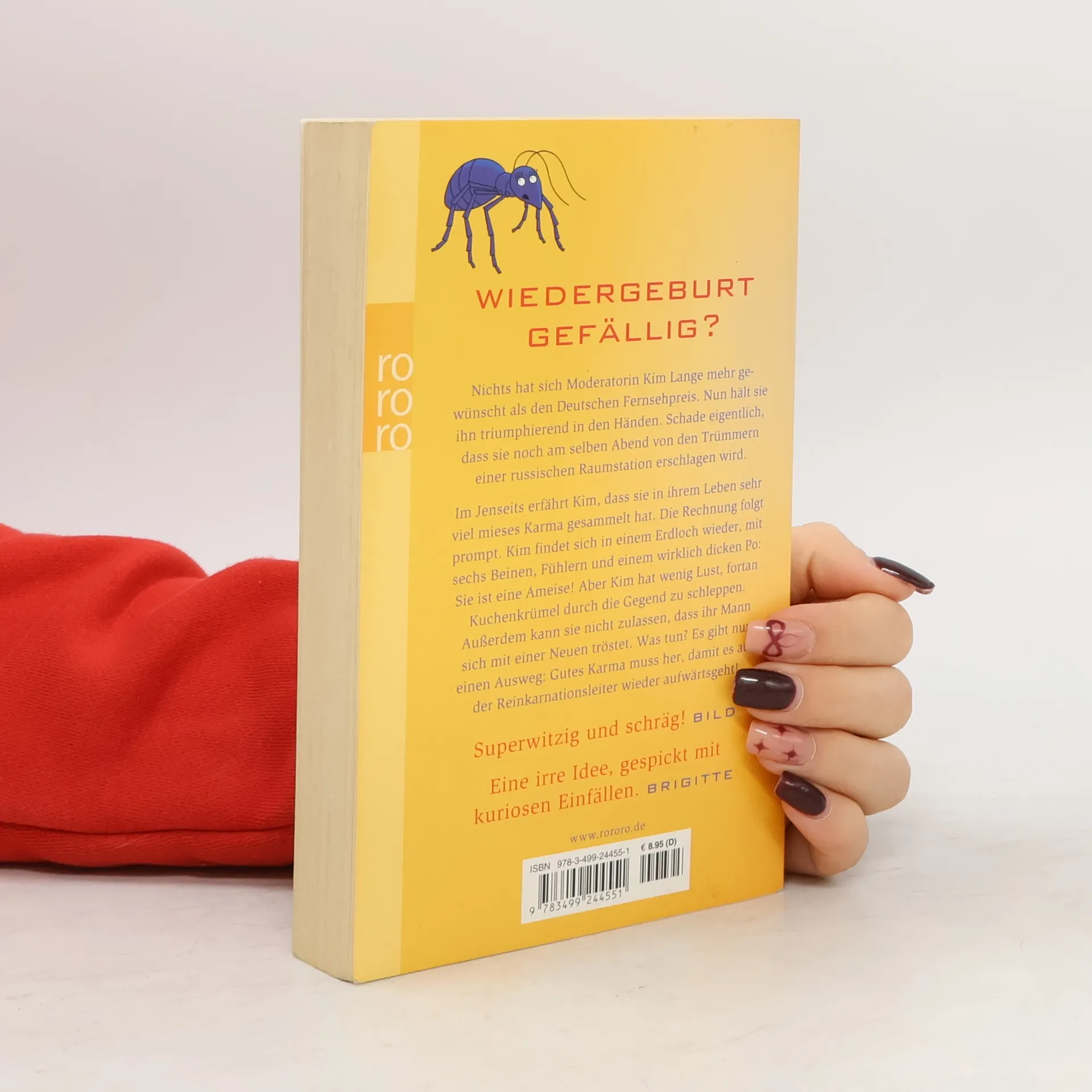 Wiedergeburt gefällig? Nichts hat sich Moderatorin Kim Lange mehr gewünscht als den deutschen Fernsehpreis. Nun hält sie ihn triumphierend in den Händen. Schade eigentlich, dass sie noch am selben Abend von den Trümmern einer russischen Raumstation erschlagen wird.Im Jenseits erfährt Kim, dass sie in ihrem Leben sehr viel mieses Karma gesammelt hat. Die Rechnung folgt prompt. Kim findet sich in einem Erdloch wieder, mit sechs Beinen, Fühlern und einem wirklich dicken Po: Sie ist eine Ameise! Aber Kim hat wenig Lust, fortan Kuchenkrümel durch die Gegend zu schleppen. Außerdem kann sie nicht zulassen, dass ihr Mann sich mit einer Neuen tröstet. Was tun? Es gibt nur einen Ausweg: Gutes Karma muss her, damit es auf der Reinkarnationsleiter wieder aufwärts geht! «Superwitzig und schräg!» (Bild) «Eine irre Idee, gespickt mit kuriosen Einfällen.» (Brigitte)