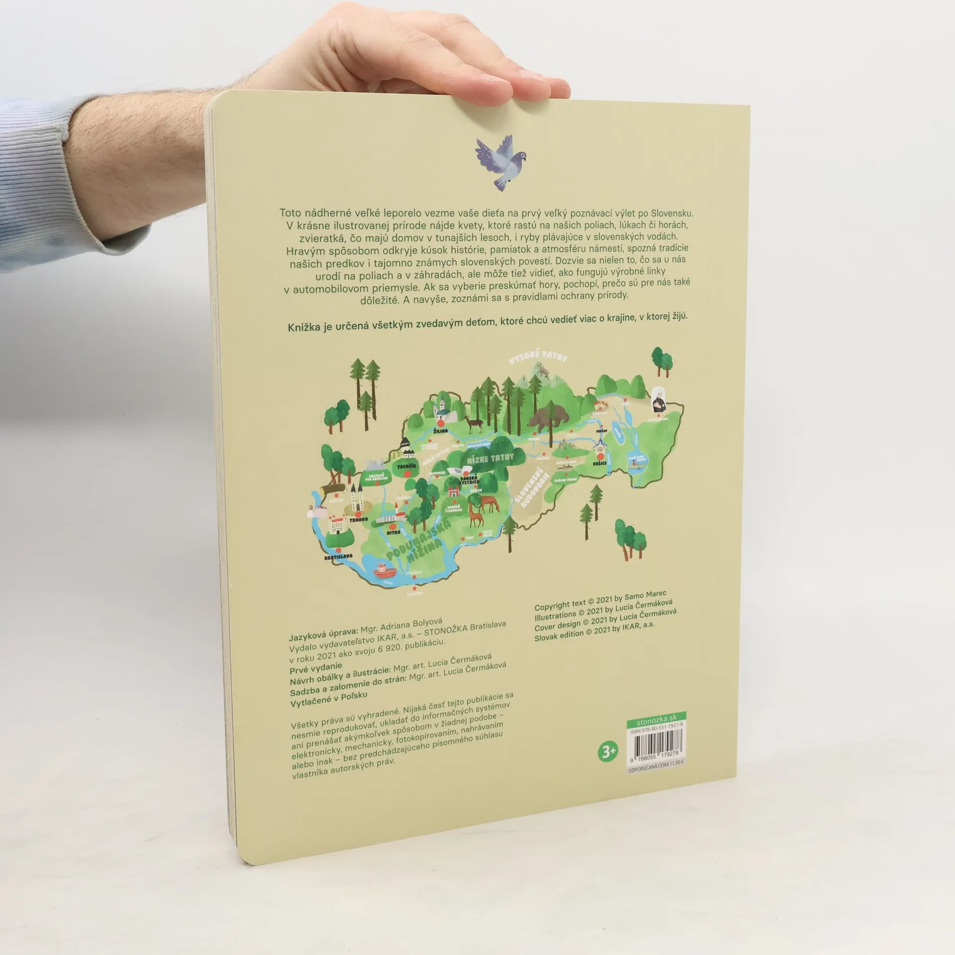 Toto nádherné veľké leporelo vezme vaše dieťa na prvý veľký poznávací výlet po Slovensku. V krásne ilustrovanej prírode nájde kvety, ktoré rastú na našich poliach, lúkach či horách, zvieratká, čo majú domov v tunajších lesoch, i ryby plávajúce v slovenských vodách. Hravým spôsobom odkryje kúsok histórie, pamiatok a atmosféru námestí, spozná tradície našich predkov i tajomno známych slovenských povestí. Dozvie sa nielen to, čo sa u nás urodí na poliach a záhradách, ale môže tiež vidieť, ako fungujú výrobné linky v automobilovom priemysle. Ak sa vyberie preskúmať hory, pochopí, prečo sú pre nás také dôležité. A navyše, zoznámi sa s pravidlami ochrany prírody. Knižka je určená všetkým zvedavým deťom, ktoré chcú vedieť viac o krajine, v ktorej žijú. Pre deti od 3 rokov