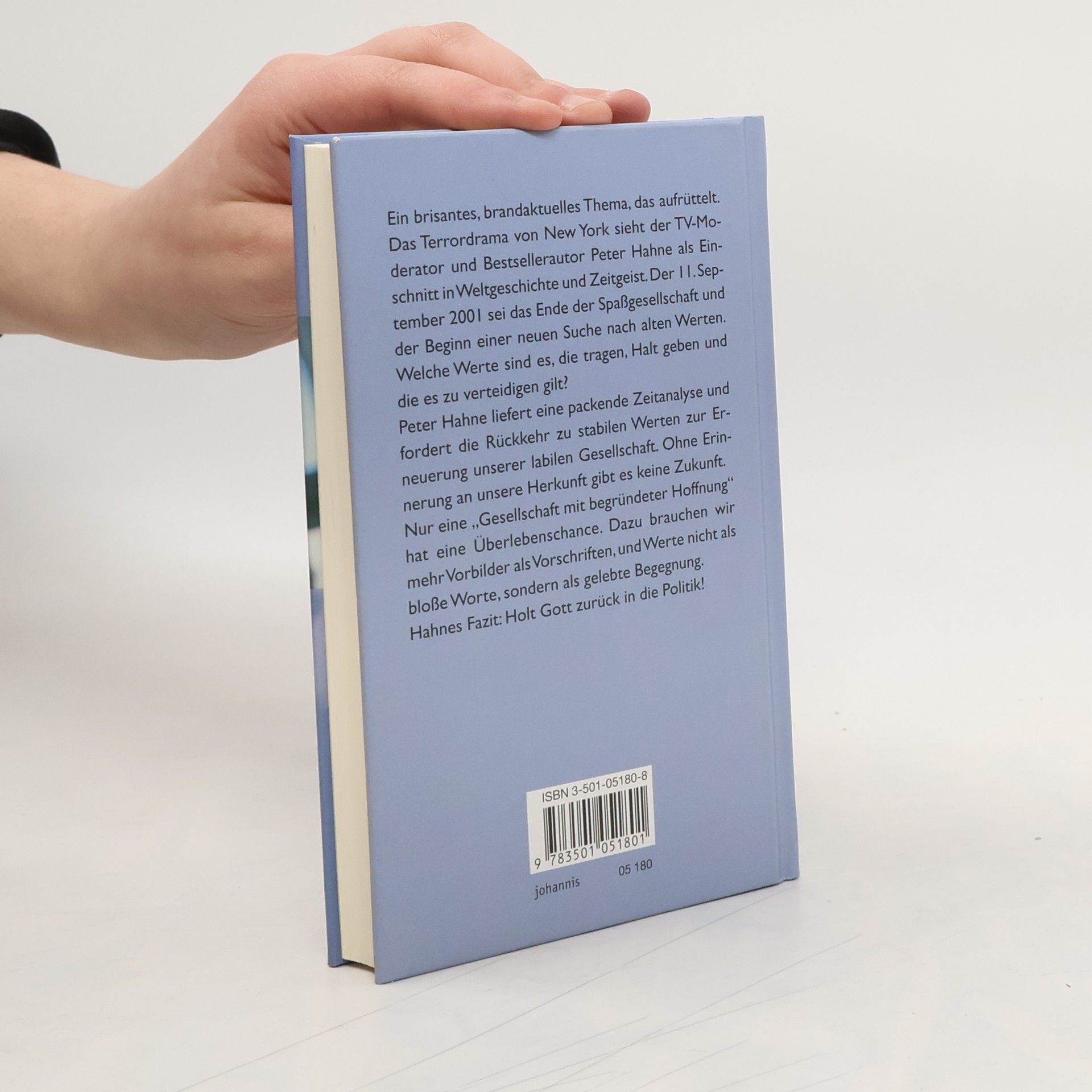 Ein brisantes, brandaktuelles Thema, das aufrüttelt. Endlich gibt es den viel beachteten Vortrag von Peter Hahne als Buch. Wo immer der Berliner Topjournalist in den letzten Monaten auf Einladung von Kirchen, Wirtschaftsverbänden oder Banken sprach: Die Hallen waren überfüllt, das Presseecho überschwänglich. Das Terrordrama von New York sieht Hahne als Einschnitt in Weltgeschichte und Zeitgeist. Der 11. September 2001 sei das Ende der Spaßgesellschaft und der Beginn einer neuen Suche nach alten Werten. Welche Werte sind es, die tragen, Halt geben und die es zu verteidigen gilt? Peter Hahne liefert eine packende Zeitanalyse und fordert die Rückkehr zu stabilen Werten zur Erneuerung unserer labilen Gesellschaft. Ohne Erinnerung an unsere christliche Herkunft gibt es keine Zukunft. Hahnes Fazit: Holt Gott zurück in die Politik!