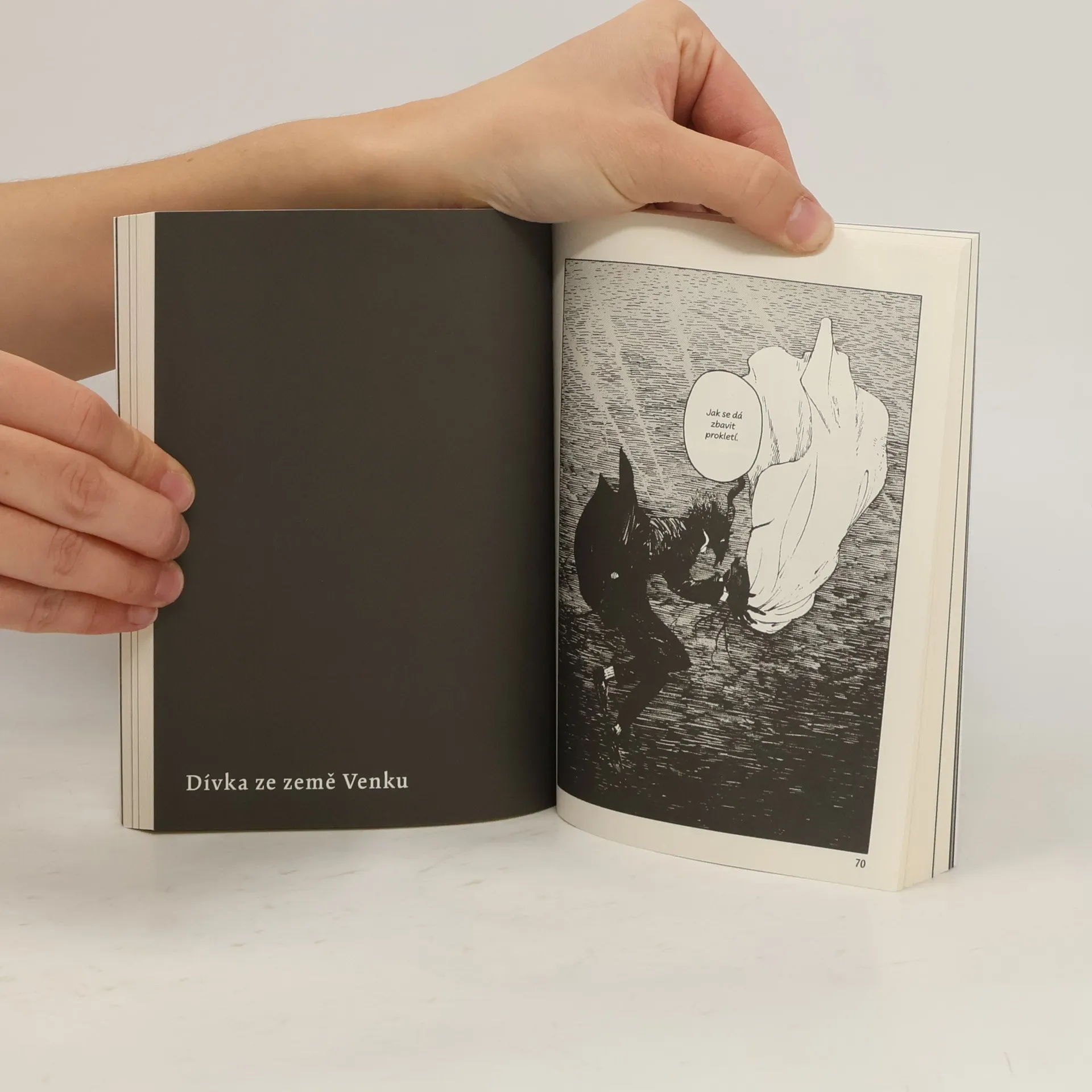 Kdysi dávno byly dvě země, oddělené od sebe vysokou zdí. Země Uvnitř, kde žili lidé, a země Venku, obývaná prokletými bytostmi. Prokletí se šířilo dotykem – a tak každého, kdo vkročil do země Venku, čekal přísný trest. I přes to však v zemi Venku žila malá dívenka jménem Šiva. Nebyla sama – starala se o ni prokletá bytost, pan učitel. Ti dva se nesměli dotknout, avšak poutalo je k sobě více, než by se na první pohled mohlo zdát. Dívenka ze země Venku je melancholický fantasy komiks plný bohaté představivosti a temných prvků. Vymyká se současné japonské komiksové produkci jak grafickým zpracováním, tak citlivým příběhem, který čtenáře záhy pohltí. Dětská zvídavost hlavní hrdinky odhaluje svět plný podivných bytostí a lidí, jejichž pohnuté osudy a strach z prokletí prověří, kam až sahá dojemné přátelství Šivy a jejího ochránce. Tváře Šivy se dotkla černá ruka, která nepatřila panu učiteli a která se jí nikdy dotknout neměla. Šiva, bezbranná dívenka, stojí nyní před hrozbou, že se promění v bytost z Venku. Jaký jen děs hrozivá představa vyvolává v panu učiteli… a kdo je „matka”, o níž zmateně hovořila bytost z Venku, jež se Šivy dotkla? Příběh dvou, dívky a bytosti, chycených v hluboké průrvě,která odděluje noc a den…
