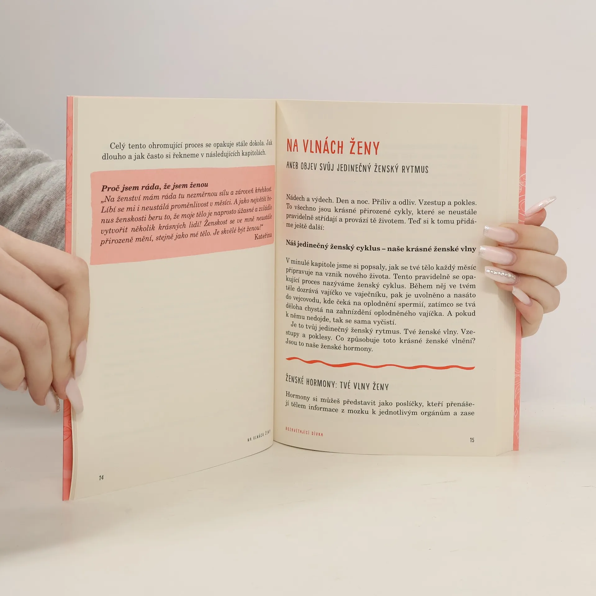 Kniha Na vlnách ženy přináší zcela nový pohled na ženský cyklus. Pohled, který jednou provždy změní tvůj život! Ale nečekej další nudnou hodinu biologie. Tentokrát se na to podíváme hravě, s humorem a současně s velkým respektem a něhou. A zapojíme do toho i tvou představivost a další smysly! Ženský cyklus není jen o menstruačním krvácení a schopnosti rodit děti. Je to tvá nejhlubší ženská podstata, tvá schopnost vdechnout život čemukoli, co si budeš přát. Tvé proměnlivé ženské schopnosti, tvá nekonečná síla. Tvoje výkyvy a proměny jsou způsobené kolísavou hladinou ženských hormonů ve tvém těle, tvými ženskými vlnami. Ale nemusíš se jimi nechat každý měsíc bezmocně vláčet. Můžeš je vědomě ovládnout a elegantně na nich surfovat. Jak na to se naučíš v této knize, která je z jedné strany určená pro dívky a z druhé pro ženy. Tak si připrav svoje surfovací prkno, vyplouváme! První část knihy je určená dívkám, ale zvu i tebe, milá ženo, ať ti je 20, 40, 60 či 80 let, abys knihu začala číst z této strany. Vrátíš se do doby kolem 10. roku života a všechno si to prožiješ znovu jako ta malá holka, kterou jsi jednou byla. Ale s novou emocí! Až si přečteš první část, obrátíš knihu vzhůru nohama a budeš číst z druhé strany V té tě provedu stejnými kapitolami a tématy, ale ponoříme se do větších podrobností a souvislostí.