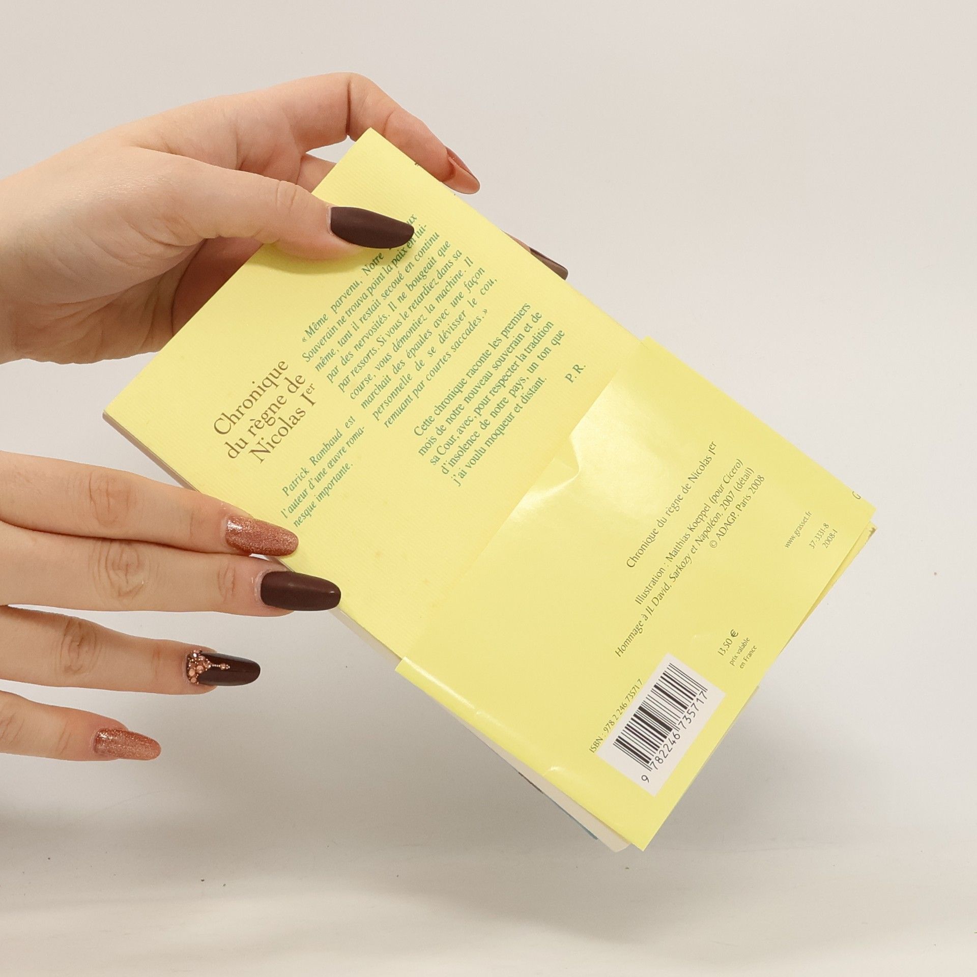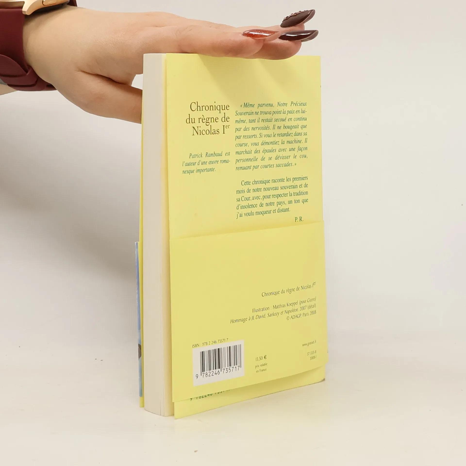 « Même parvenu, Notre Précieux Souverain ne trouva point la paix en lui-même, tant il restait secoué en continu par des nervosités. Qui l’a vu fixe et arrêté ? Il ne bougeait que par ressorts. Si vous le retardiez dans sa course, vous démontiez la machine. Il marchait des épaules avec une façon personnelle de se dévisser le cou, remuant par courtes saccades comme s’il était engoncé dans un costume que lui taillait pourtant à sa mesure un artiste italien de renom. (…) Quand il parlait en public, plusieurs fois dans une même journée, il se rengorgeait ainsi qu’un pigeon et se livrait à de curieuses contorsions pour animer ses dires… » P.R. Amusé, atterré, ébloui, agacé par la passion, l’amour et l’attention que suscite notre nouveau président – notre nouvel empereur, devrait-on dire –, Patrick Rambaud s’est lancé dans une chronique un peu particulière : conter, au jour le jour, l’éclosion de ce nouveau monarque, se fondant sur des faits vrais, mais dans l’esprit, avec la drôlerie et la cruauté de Saint-Simon… Dans cette chronique irrévérencieuse, on croise ainsi un souverain trépidant, une impératrice pincée qui règne sur son empereur, un dauphin de dix ans, des ministres empoudrés et fébriles, un duc de Bordeaux tragique, des barons à genoux… Rien n’échappe à la plume de notre chroniqueur, ni le short, ni le renouveau de la lampe Empire, ni les flagorneries des princes, ni les courbettes des petits marquis… ni, enfin, la folie amoureuse d’autres chroniqueurs et portraitistes un peu moins agacés&hellip.