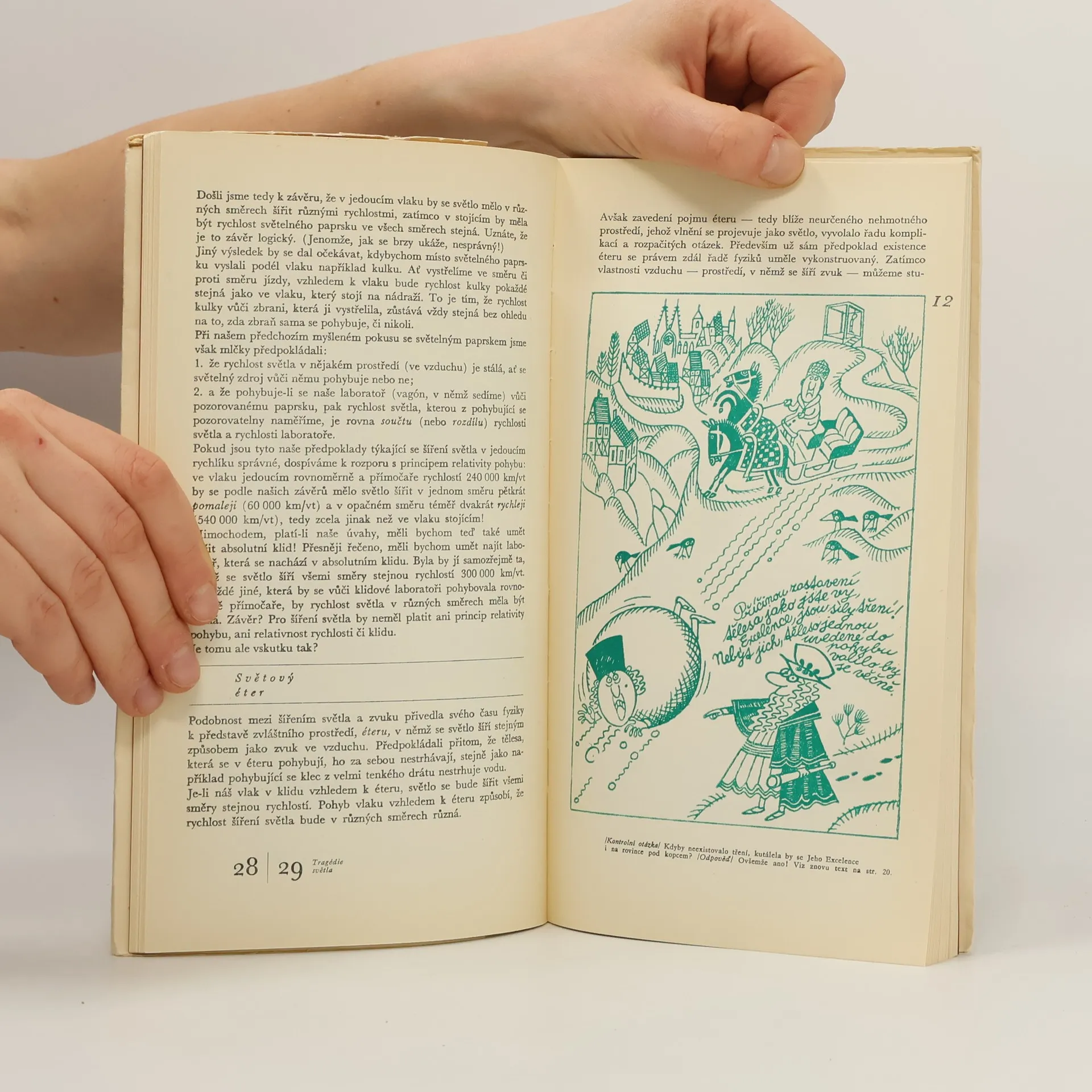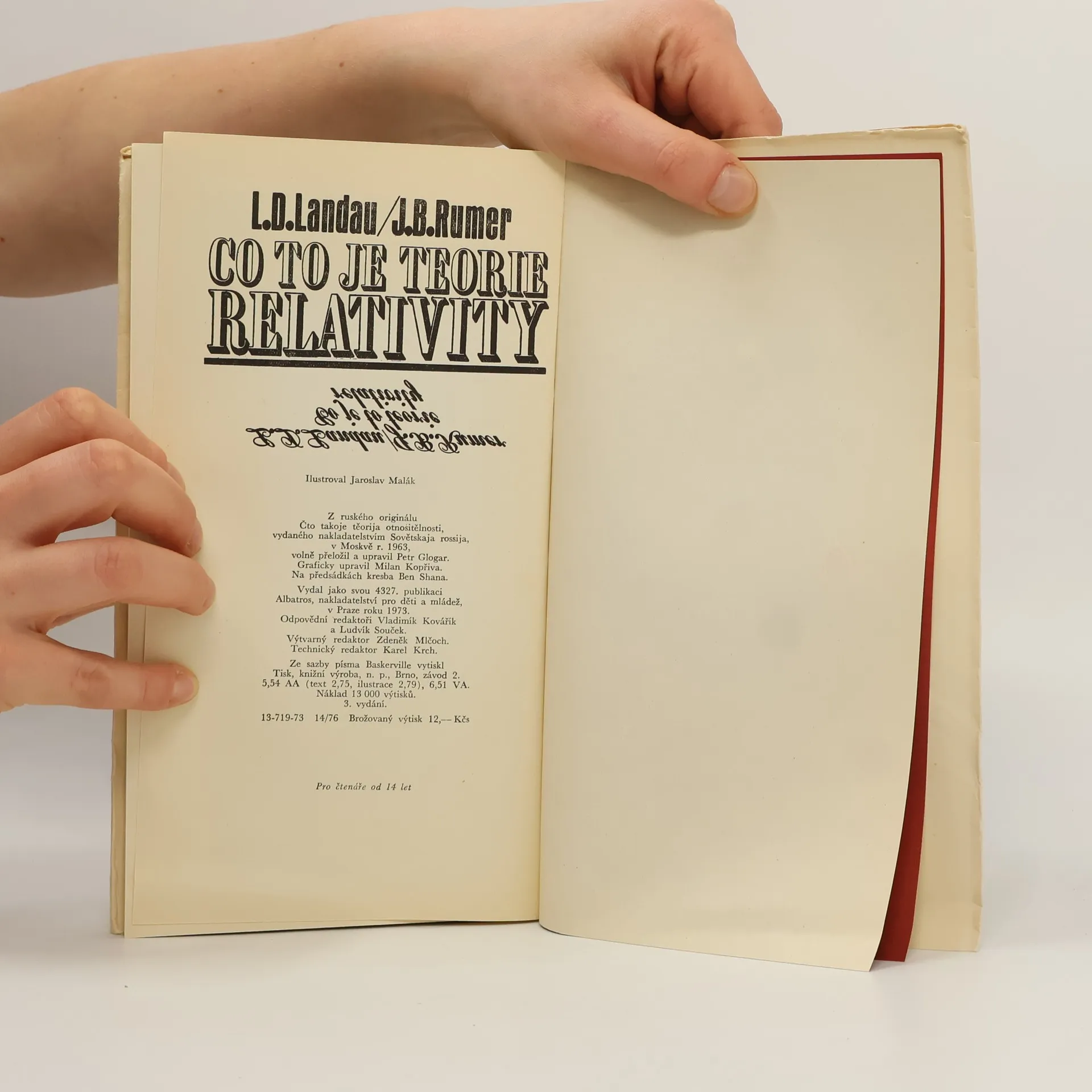 Velmi obtížné problémy, které vznikají, hledíme-li na jevy ze zorného úhlu teorie relativity, jsou vysvětlovány vtipnou a co nejsrozumitelnější formou za přispění humorných ilustrací. Odborná úroveň je zajištěna tím, že jeden z autorů, Landau, je předním sovětským fyzikem. Na závěrbylo převyprávěno několik stran vzpomínek polského vědce L. Infelda na A. Einsteina. - Knížka obalena modrou stužkou s nápisem "V krátké době vychází již třetí vydání knížky slavného fyzika L. D. Landaua Co to je teorie relativity". - Volně přeložil a upravil Petr Glogar.