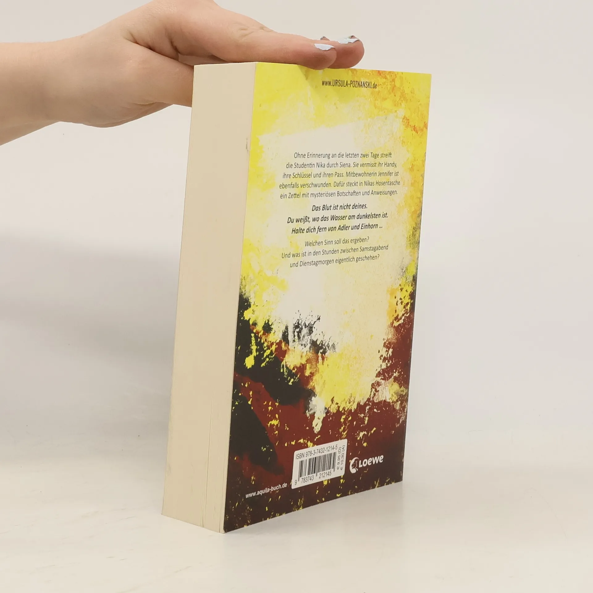Spurensuche in Siena Ohne Erinnerung an die letzten zwei Tage streift die Studentin Nika durch Siena. Sie vermisst ihr Handy, ihre Schlüssel und ihren Pass. Mitbewohnerin Jennifer ist ebenfalls verschwunden. Dafür steckt in Nikas Hosentasche ein Zettel mit mysteriösen Botschaften und Anweisungen. Das Blut ist nicht deines. Du weißt, wo das Wasser am dunkelsten ist Halte dich fern von Adler und Einhorn … Welchen Sinn soll das ergeben? Und was ist in den Stunden zwischen Samstagabend und Dienstagmorgen eigentlich geschehen? Nicht nur für alle Italienliebhaber*innen: Bestseller-Autorin Ursula Poznanskis Siena- Thriller entführt in die engen Gassen, weiten Plätze und zu den Geheimnissen einer der schönsten Städte der Welt. Ein unlösbar scheinendes Rätsel, ein monströser Verrat und die geheimnisvollen Symbole des mittelalterlichen Siena bilden das Gerüst dieses exzellenten Psychothrillers .
