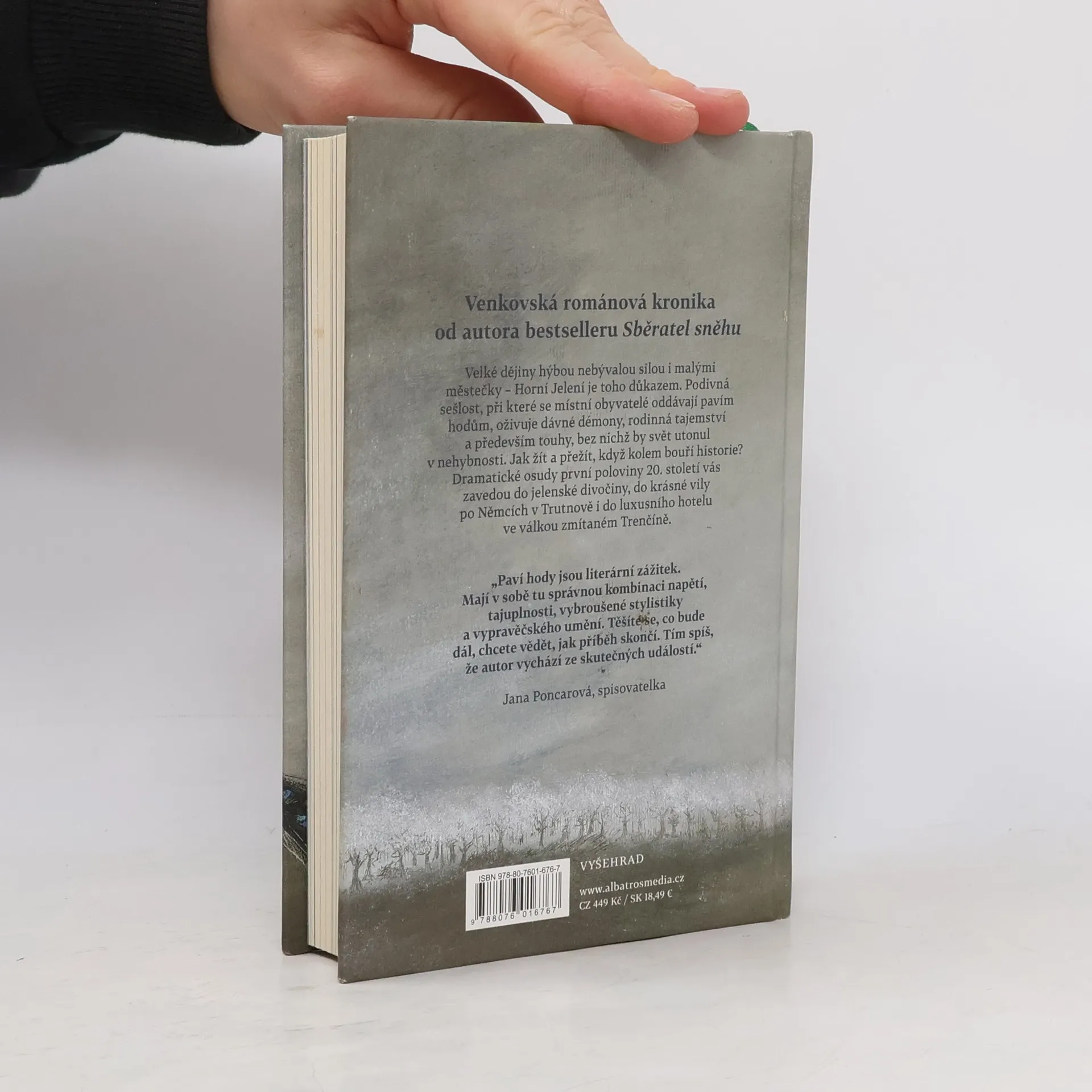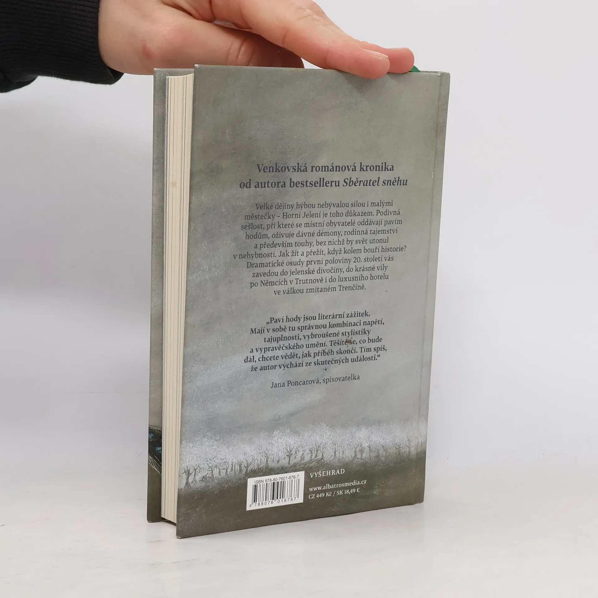 Venkovská románová kronika od autora bestselleru Sběratel sněhu Velké dějiny hýbou nebývalou silou i malými městečky – Horní Jelení je toho důkazem. Podivná sešlost, při které se místní obyvatelé oddávají pavím hodům, oživuje dávné démony, rodinná tajemství a především touhy, bez nichž by svět utonul v nehybnosti. Jak žít a přežít, když kolem bouří historie? Dramatické osudy první poloviny 20. století vás zavedou do jelenské divočiny, do krásné vily po Němcích v Trutnově i do luxusního hotelu ve válkou zmítaném Trenčíně.