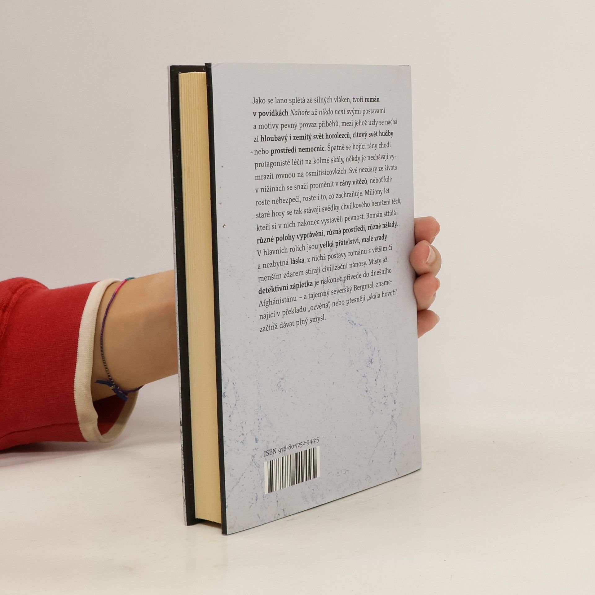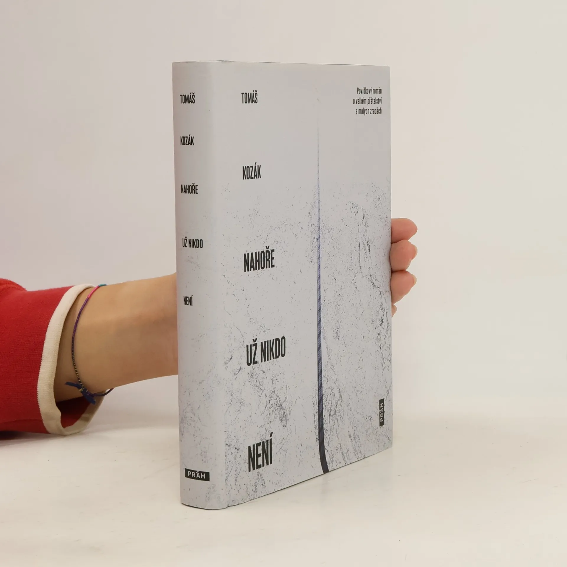 Jako se lano splétá ze silných vláken, tvoří román v povídkách Nahoře už nikdo není svými postavami a motivy pevný provaz příběhů, mezi jehož uzly se nachází hloubavý i zemitý svět horolezců, citový svět hudby nebo prostředí nemocnic. Špatně se hojící rány chodí protagonisté léčit na kolmé skály, někdy je nechávají vymrazit rovnou na osmitisícovkách. Své nezdary ze života v nížinách se snaží proměnit v rány vítězů, neboť kde roste nebezpečí, roste i to, co zachraňuje.Hory se tak stávají svědky chvilkového hemžení těch, kteří si v nich nakonec vystavěli pevnost. V hlavních rolích jsou velká přátelství, malé zrady a nezbytná láska, z nichž postavy románu s větším či menším zdarem stírají civilizační nánosy.