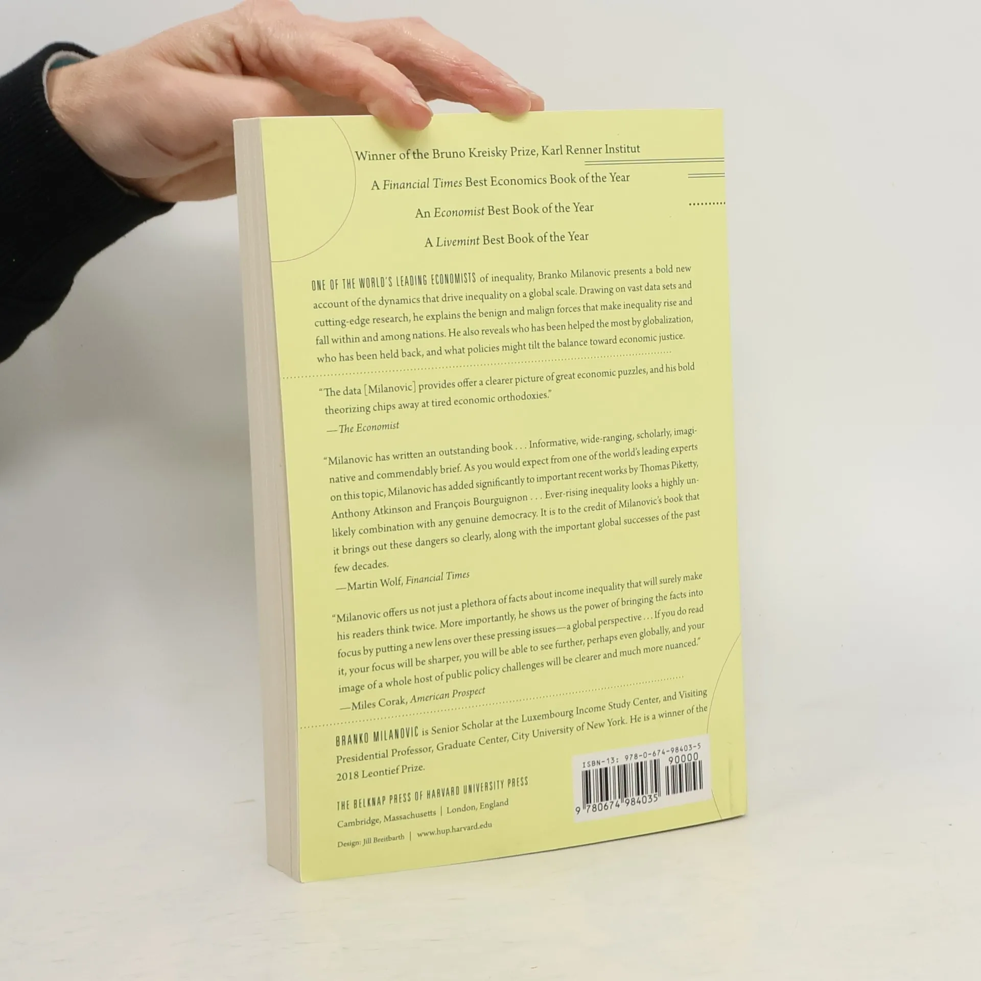 Winner of the Bruno Kreisky Prize, Karl Renner Institut A Financial Times Best Economics Book of the Year An Economist Best Book of the Year A Livemint Best Book of the Year One of the world’s leading economists of inequality, Branko Milanovic presents a bold new account of the dynamics that drive inequality on a global scale. Drawing on vast data sets and cutting-edge research, he explains the benign and malign forces that make inequality rise and fall within and among nations. He also reveals who has been helped the most by globalization, who has been held back, and what policies might tilt the balance toward economic justice. “The data [Milanovic] provides offer a clearer picture of great economic puzzles, and his bold theorizing chips away at tired economic orthodoxies.” —The Economist “Milanovic has written an outstanding book...Informative, wide-ranging, scholarly, imaginative and commendably brief. As you would expect from one of the world’s leading experts on this topic, Milanovic has added significantly to important recent works by Thomas Piketty, Anthony Atkinson and François Bourguignon...Ever-rising inequality looks a highly unlikely combination with any genuine democracy. It is to the credit of Milanovic’s book that it brings out these dangers so clearly, along with the important global successes of the past few decades. —Martin Wolf, Financial Times