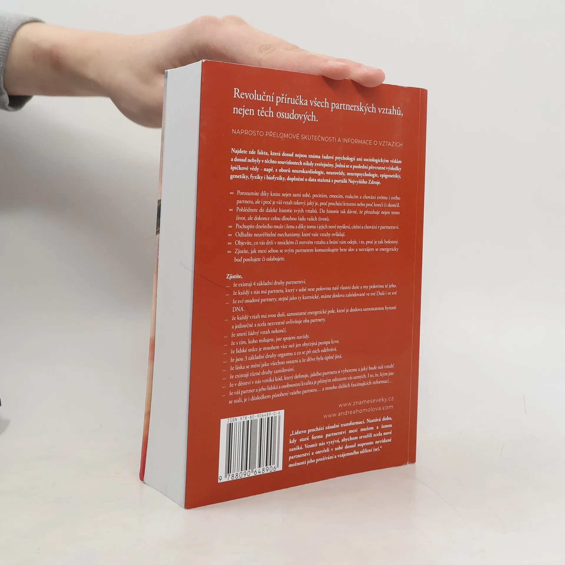Kniha o vztazích, která změní váš život. Revoluční příručka všech partnerských vztahů, včetně těch osudových. Najdete zde naprosto přelomové skutečnosti a informace týkající se vztahů, fakta, která dosud nejsou známa řadové psychologii, ani sociologickým vědám, a dosud nebyla v těchto souvislostech nikdy zveřejněna. Jedná se nejen o poslední převratné výsledky špičkové světové vědy - např. z oborů neurokardiologie, neurovědy, neuropsychologie, epigenetiky, genetiky, fyziky a biofyziky, související se vztahy, ale i skutečnosti a souvislosti z duchovních věd. Kniha je výjimečná syntézou obou pramenů poznání a také tím, že vám zodpoví všechny otázky na téma partnerství, na které jste dosud hledali odpovědi, ale nenalezli je. Dozvíte se například, že DNA je neuroplastická, neboli že začínáme být schopni ji sami přepisovat svým vlastním vědomím. Že v DNA je uložen kód našich partnerů. Že žádný vztah nikdy neskončí, ani smrtí jednoho z partnerů. Že pouhou myšlenkou, i na vzdálenost tisíců kilometrů, ovlivňujeme tepovou frekvenci toho, na nějž s láskou pomyslíme a mnoho podobných převratných informací, které nebyly dosud zveřejněny v těchto souvislostech. Lze koupit na www.znameseveky.cz