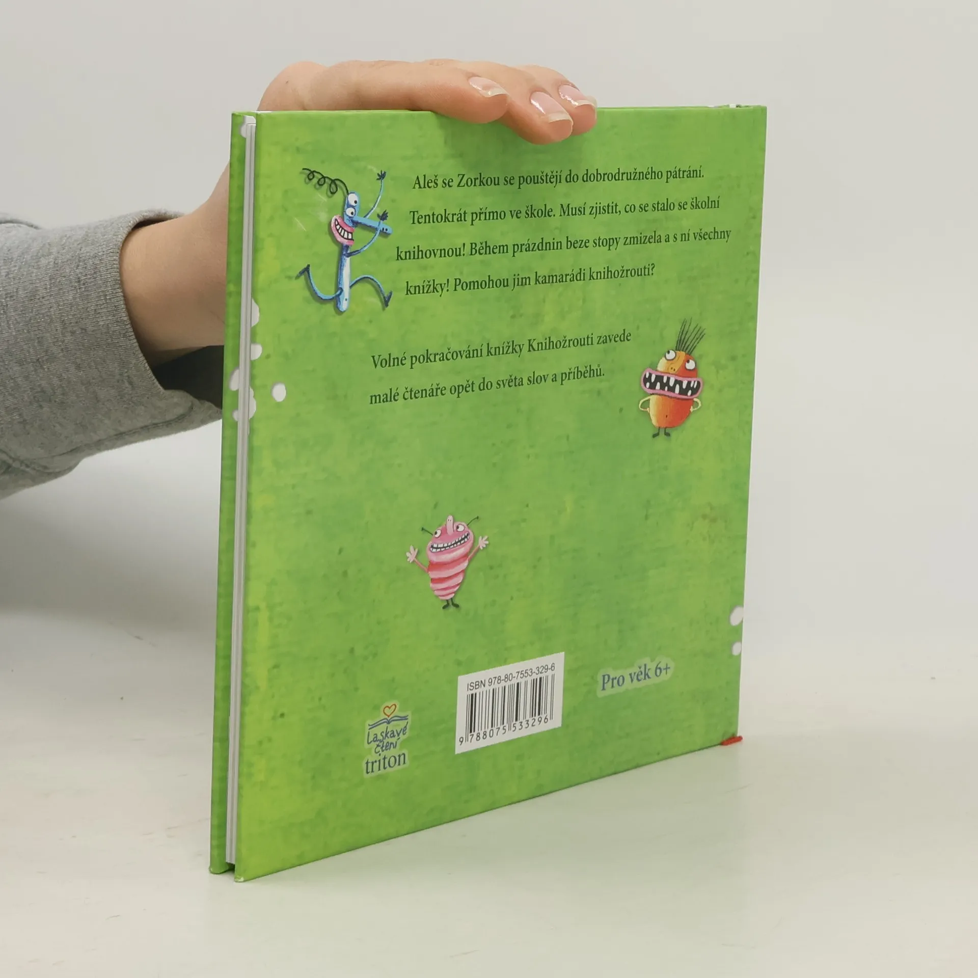 Aleš se Zorkou se pouštějí do dobrodružného pátrání. Tentokrát přímo ve škole. Musí zjistit, co se stalo se školní knihovnou! Během prázdnin beze stopy zmizela a s ní všechny knížky! Pomohou jim kamarádi knihožrouti? Volné pokračování knížky Knihožrouti zavede malé čtenáře opět do světa slov a příběhů.