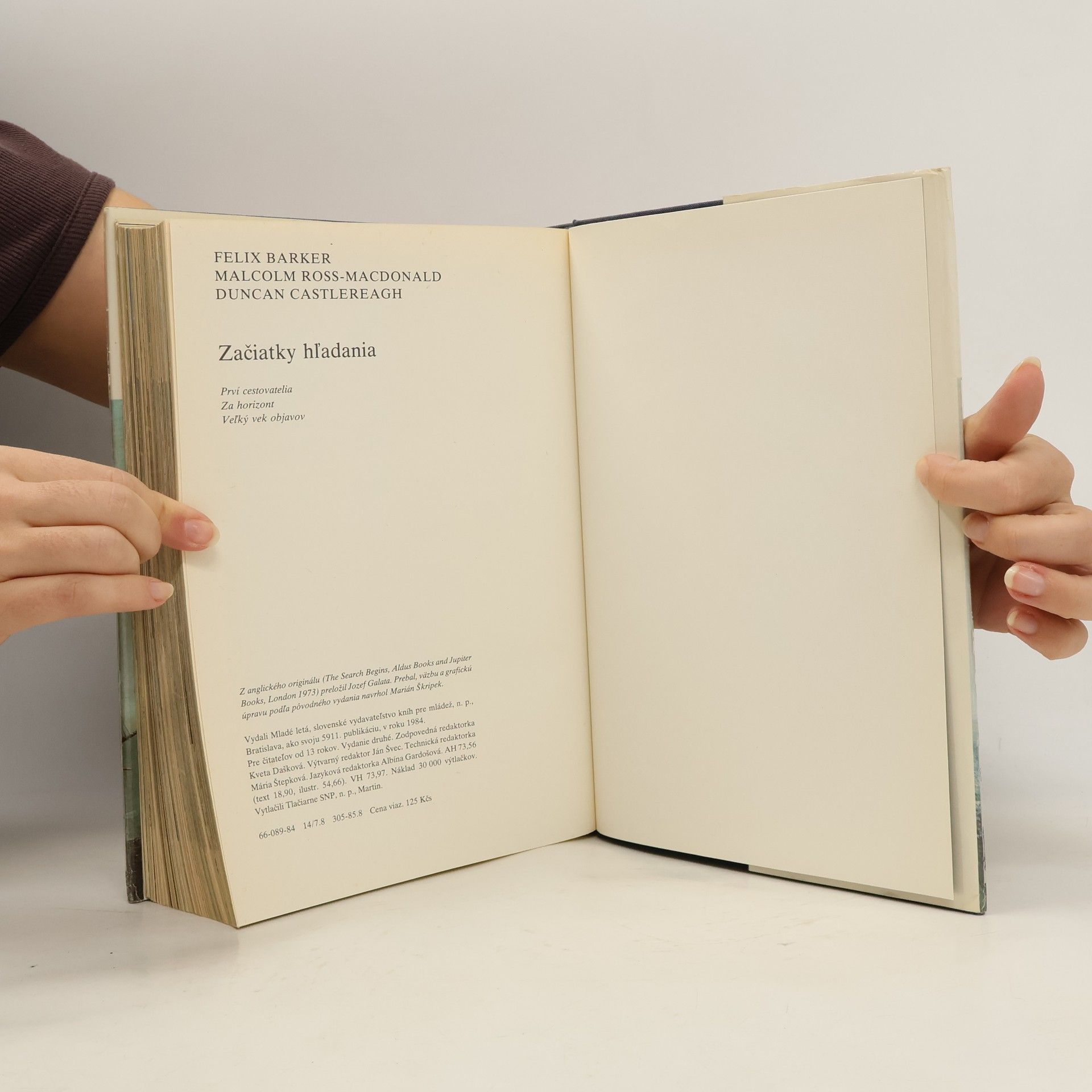 Dejiny zemepisných prieskumov a objavov. Kapitoly: Prvá časť-Prví cestovatelia-1. Do neznáma, 2. Cesty Egypťanov, 3. Priekopníci z Fenície, 4. Z Kartága na západ, 5. Grécki dobrodruhovia, 6. Alexander Veľký, 7. Nové horizonty, 8. Hannibal prekročil Alpy, 9. Objavy Rimanov, 10. Hodvábna cesta doČíny, 11. Koniec začiatku. Druhá časť-Za horizont-1.Veľký Atlantický oceán, 2. Nájazdy Vikingov, 3. Island a Grónsko, 4. Vikingovia v Severnej Amerike, 5. Džingischán a Mongoli, 6. Poslovia u veľkého chána, 7. Cesty Viliama Rubroeka, 8.Obchodné cesty, 9. Benátčania sa vracajú, 10. Marco Polo v Číne, 11. Cesty vedú do Číny. Tretia časť-Veľký vek objavov-1. Historická výzva, 2. Odpoveď, 3. More temnôt, 4. S nádejou na juh, 5. S Kolumbom na západ, 6. S Vascom da Gama na východ, 7. Ďalej na východ i na západ, 8. Okolo sveta.