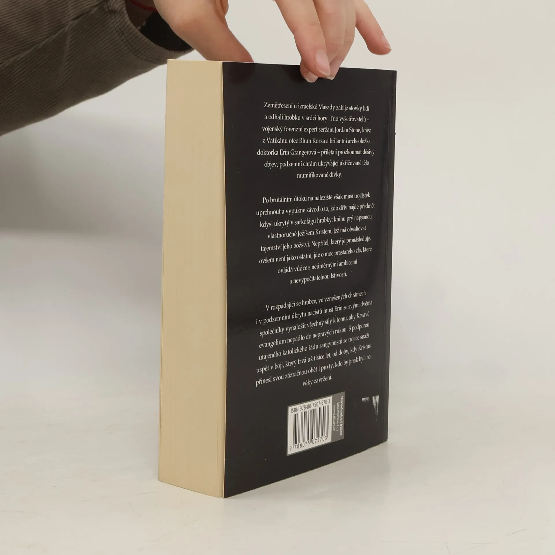 Přidat do mých knih KoupitKoupit eknihu Zemětřesení v izraelské Masadě zabije stovky lidí a odhalí hrobku v srdci hory. Trio vyšetřovatelů – seržant Jordan Stone, vojenský forenzní expert, otec Rhun Korza, kněz z Vatikánu a doktorka Erin Grangerová, brilantní, ale rozčarovaná archeoložka – jsou vysláni, aby prozkoumali děsivý objev, podzemní chrám ukrývající ukřižované tělo mumifikované dívky. Ale po brutálním útoku na naleziště musí uprchnout a vypukne závod o to, aby vrátili, co bylo kdysi ukryto v sarkofágu hrobky: knihu napsanou prý vlastnoručně Ježíšem Kristem, která má obsahovat tajemství jeho božství. Avšak nepřítel, který jim je v patách, není jako ostatní, jde o moc prastarého zla, které ovládá vůdce s neúměrnými ambicemi a nevypočitatelnou lstivostí. V rozpadající se hrobce i v okázalých chrámech musí Erin se svými společníky bojovat s minulostí vedoucí tisíce let zpět do doby, kdy v temných koutech světa lovily nečisté stvůry, až k okamžiku, kdy Kristus přinesl svou zázračnou oběť, smlouvu o spasení pro ty, kdo by jinak byli na věky zavrženi. Druhé vydání.
